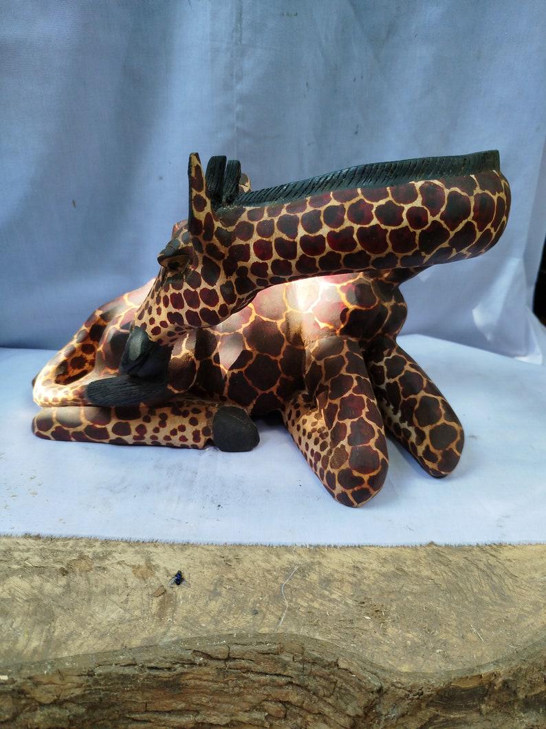This magnificent hand-carved wooden giraffe sculpture is a unique and serene piece of African art, depicting the animal in a relaxed, sitting pose. The statue is expertly carved from solid wood, showcasing a beautifully rich, dark stain and smooth finish. The entire body is covered in the giraffe's iconic markings, created by a lighter color or etched pattern that highlights the detail. Its resting posture makes it a charming and unusual safari animal collectible, perfect for adding character to any flat surface. This piece works perfectly as desktop decor, a bookshelf accent, or a centerpiece on a coffee table. It's an ideal wildlife art gift for a collector, a new homeowner, or anyone who appreciates handcrafted global decor. Searching for a subtle yet striking accent for your home? This beautiful wooden giraffe offers a touch of the wild with artistic elegance. This stunning sculpture is ready to display and instantly infuse your space with African warmth and style.