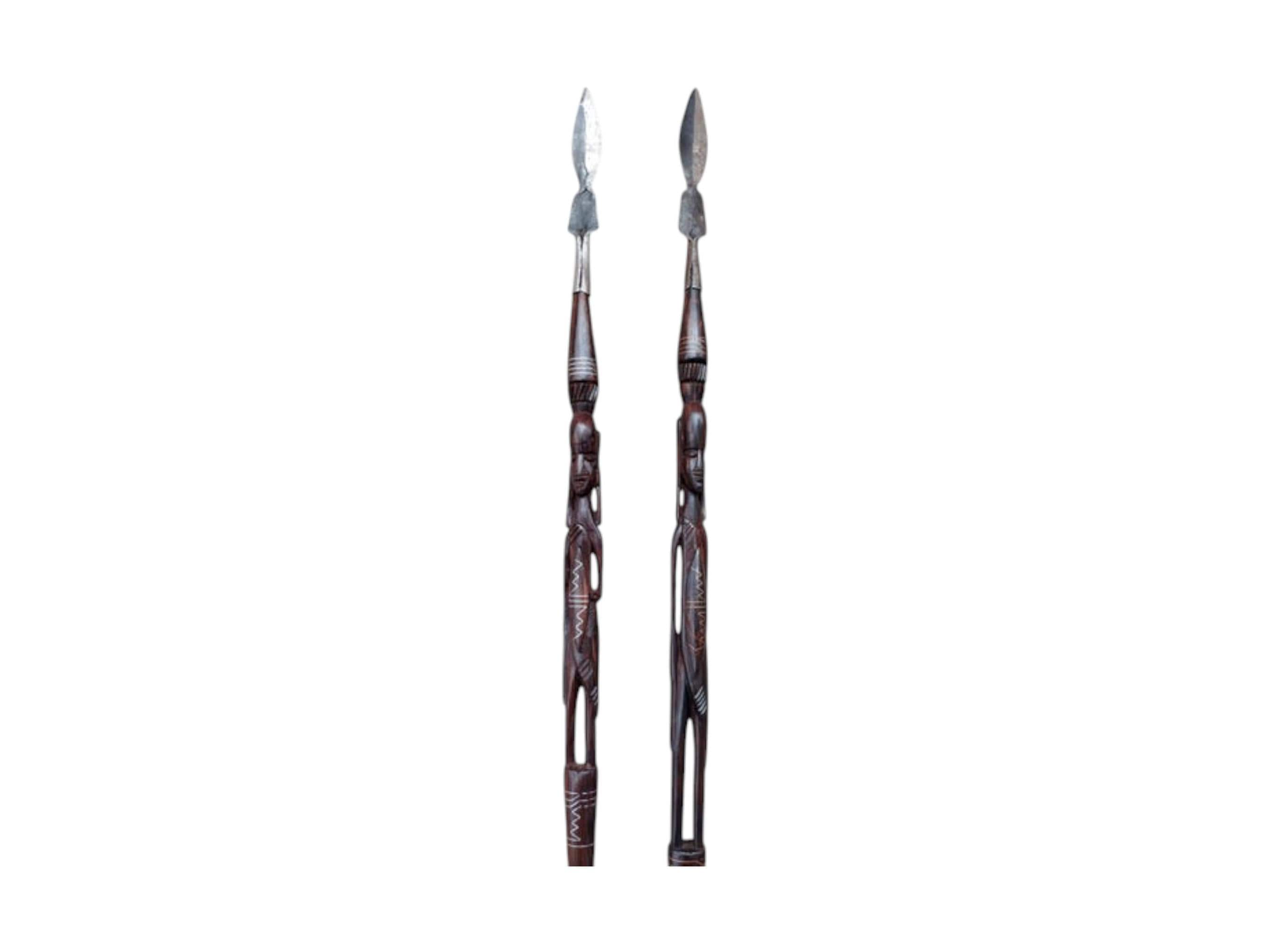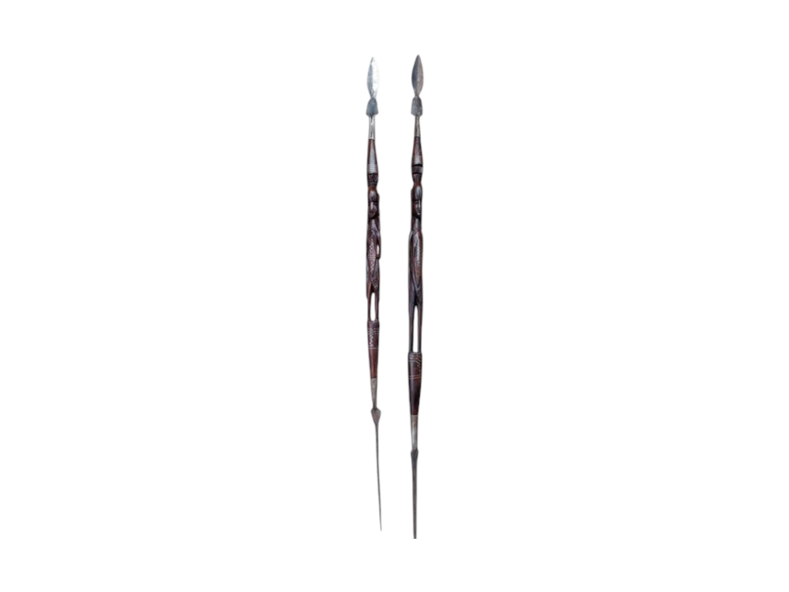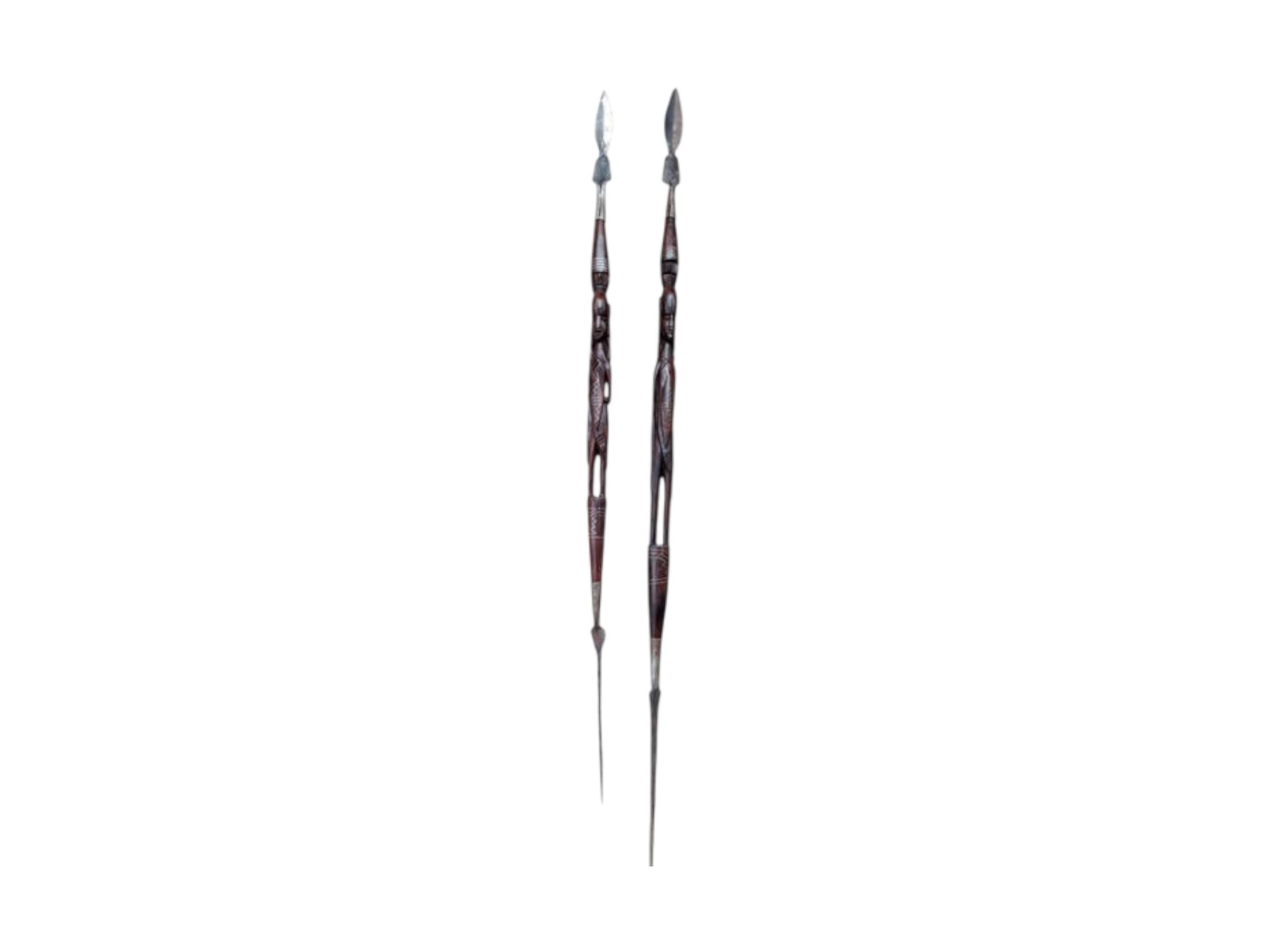 This magnificent pair of African wooden spears is a unique representation of the Maasai warrior heritage, traditionally used for hunting and protection. Each spear measures approximately 45 inches in length, making them an impressive and authentic tribal art piece for wall display. The long wooden shaft features meticulously hand carved details and geometric patterns, showcasing the artisan's exceptional skill. The spears are tipped with sharpened metal points at both ends, emphasizing their traditional function as a formidable weapon (for display only). Listed as a set of two, they create a powerful and balanced statement piece for a den, living room, or gallery wall. This stunning collector gift set is ideal for military history enthusiasts, ethnographic art collectors, and lovers of East African culture. The rich, dark wood grain and intricate carving ensure these are not just objects but unique pieces of African decor. These beautiful Maasai Royal Spears are ready to hang and instantly infuse your space with a sense of adventure and history.