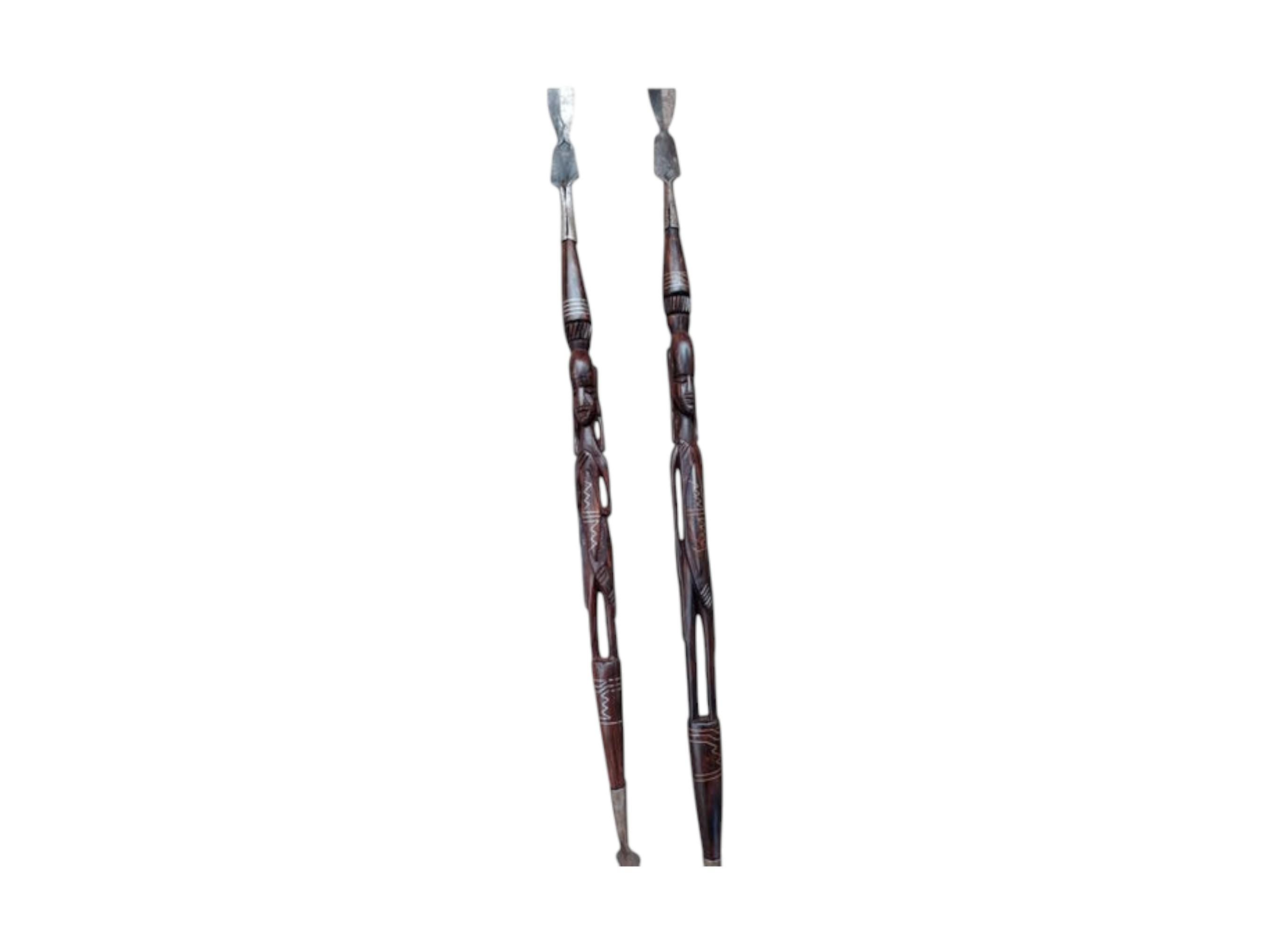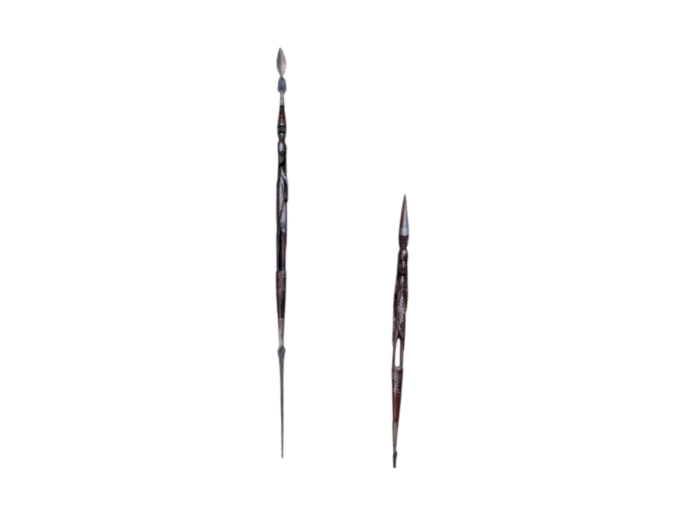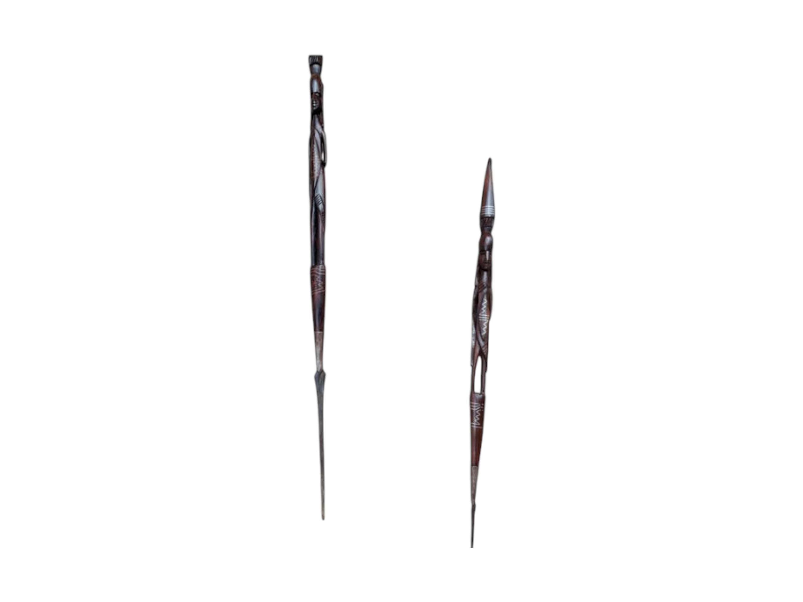 This magnificent pair of African wooden spears is a unique representation of the Maasai warrior heritage, traditionally used for hunting and protection. Each spear measures approximately 45 inches in length, making them an impressive and authentic tribal art piece for wall display. The long wooden shaft features meticulously hand carved details and geometric patterns, showcasing the artisan's exceptional skill. The spears are tipped with sharpened metal points at both ends, emphasizing their traditional function as a formidable weapon (for display only). Listed as a set of two, they create a powerful and balanced statement piece for a den, living room, or gallery wall. This stunning collector gift set is ideal for military history enthusiasts, ethnographic art collectors, and lovers of East African culture. The rich, dark wood grain and intricate carving ensure these are not just objects but unique pieces of African decor. These beautiful Maasai Royal Spears are ready to hang and instantly infuse your space with a sense of adventure and history.