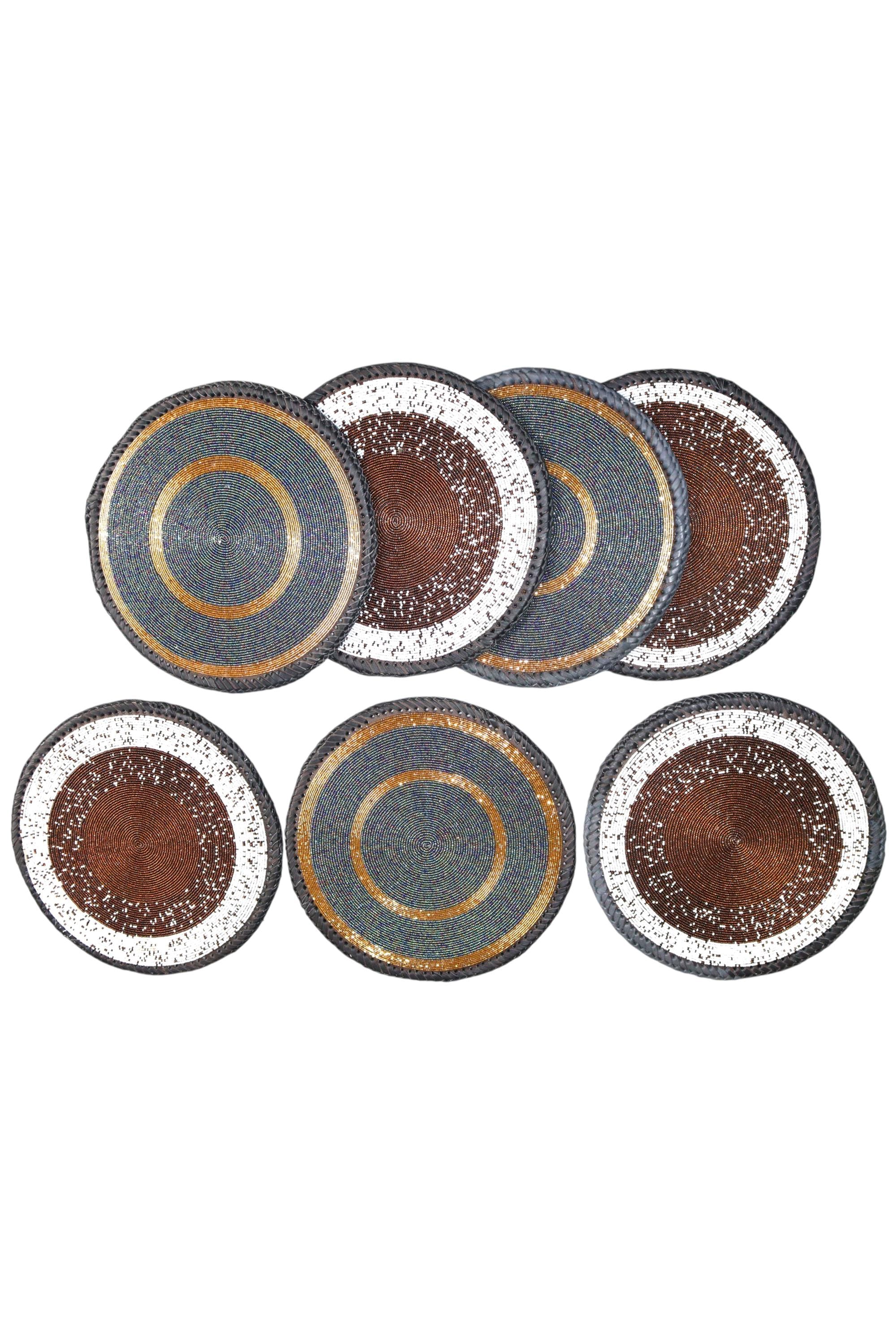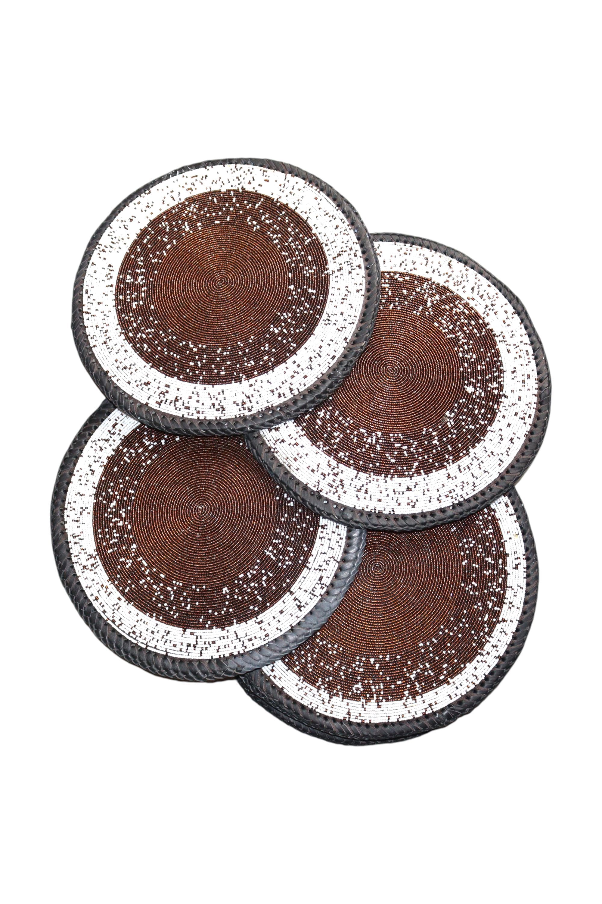 Elevate your dining or entertaining experience with this beautiful set of four hand-beaded African table mats. Each round mat is meticulously crafted with a central design of tightly coiled brown beads, creating a textured, spiral pattern. This is elegantly framed by a crisp white beaded ring, and finished with a dark, possibly woven or beaded, outer edge. These pieces are inspired by traditional African artistry, possibly Maasai designs, bringing a touch of cultural elegance to your home. Perfect as decorative place settings, large coasters, or unique accents for your coffee table, this set celebrates skilled craftsmanship and ethnic charm.