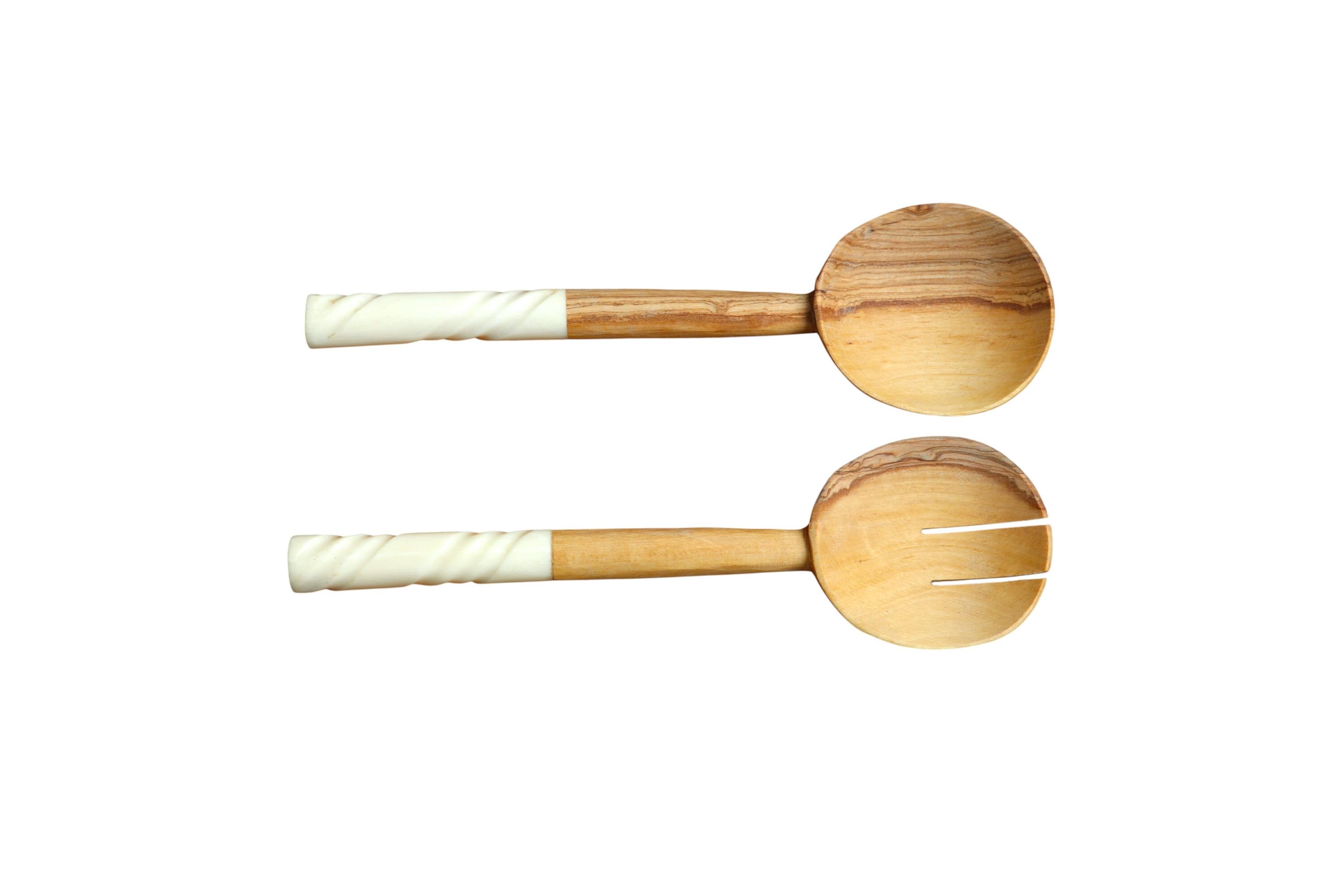 Elevate your dining experience with this beautiful pair of hand-carved African wooden salad servers. Crafted from natural light-toned wood, these servers feature a smooth finish and a rich grain, showcasing the organic beauty of the material. One server is a classic spoon, while the other features a slotted design, ideal for tossing and serving salads. The long handles are elegantly adorned with distinctive white bone, possibly with a subtle spiral texture, adding a touch of sophisticated ethnic artistry. Perfect for serving salads, pasta, or other dishes, these servers are not just functional utensils but also unique decorative pieces that bring an authentic touch of African craftsmanship to your kitchen or dining table. They make an excellent gift for food lovers and collectors of artisanal goods.