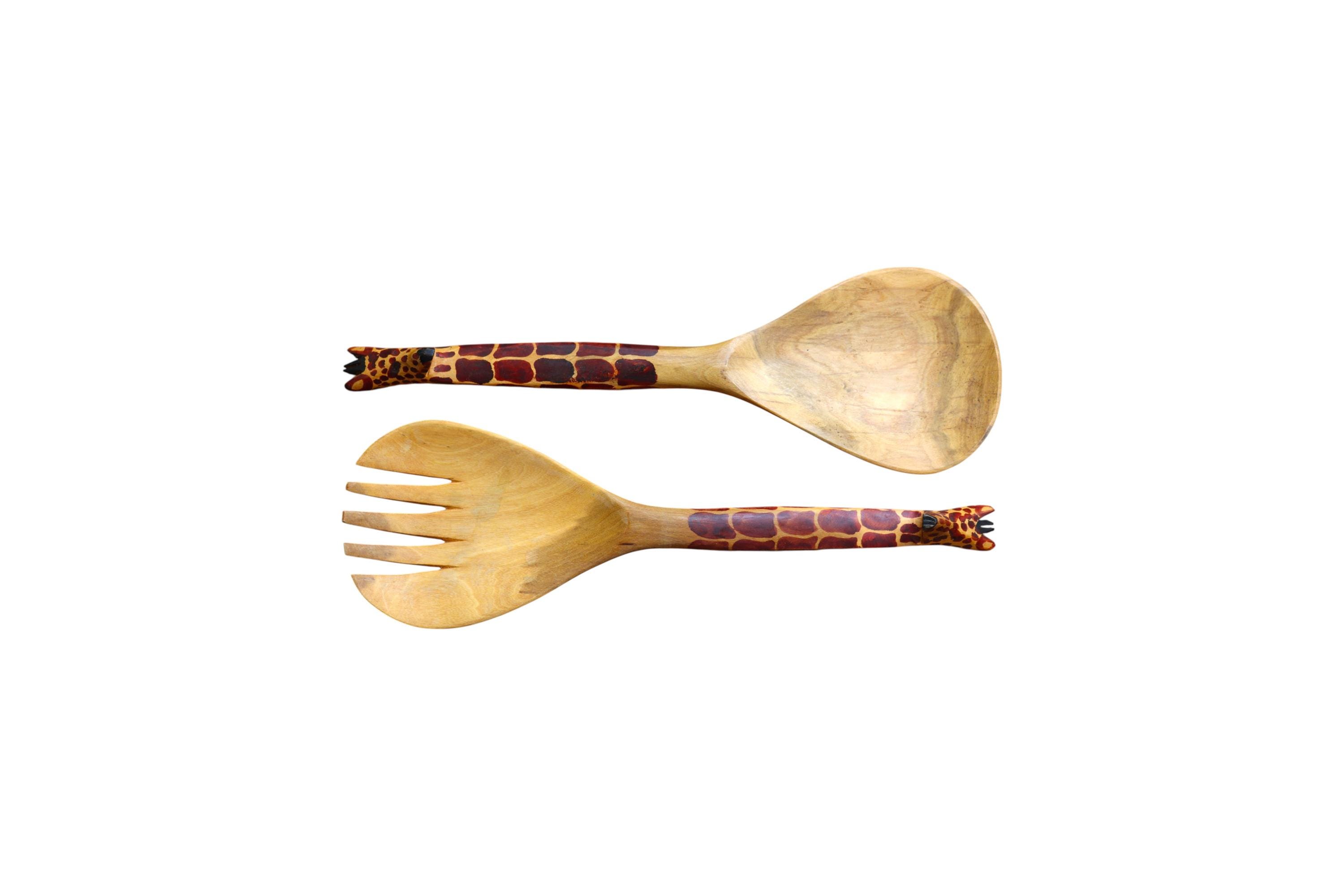Bring the charm of the African safari to your table with this delightful pair of hand-carved wooden salad servers. Crafted from light-toned natural wood, these servers feature smoothly shaped spoon and fork ends, perfect for tossing and serving. The handles are uniquely adorned with hand-painted or carved giraffe print patterns in reddish-brown hues, culminating in intricately detailed giraffe heads at the very top. These aren't just functional kitchen tools; they are artistic statements that celebrate wildlife and skilled craftsmanship. Ideal for serving salads, pasta, or as a unique gift for animal lovers and those who appreciate ethnic decor.