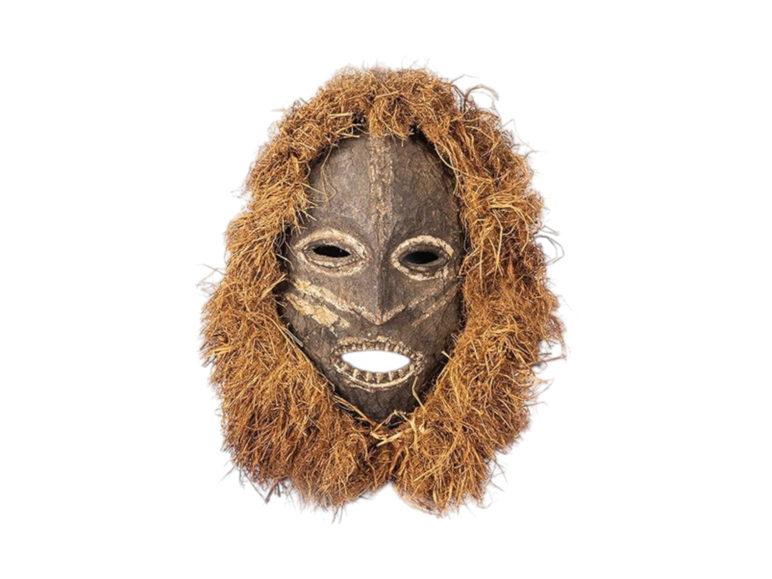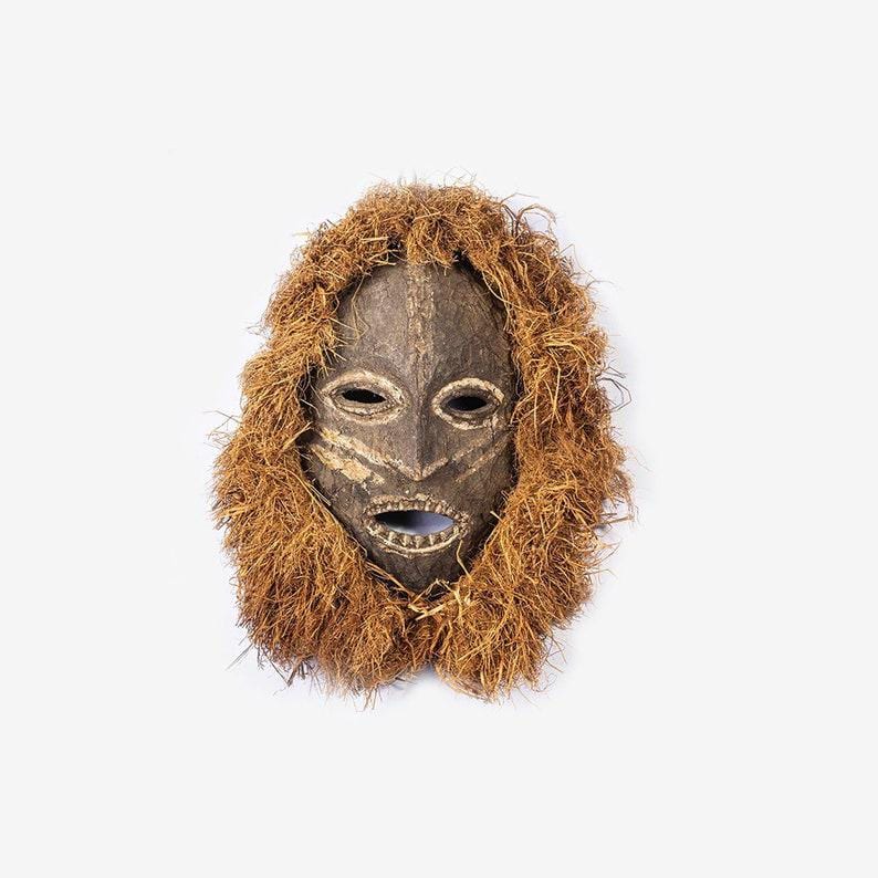 This dramatic authentic Songola tribal mask is a powerful piece of African wooden art, traditionally created by the Songola people of the Congo (DRC) region. The mask features a deeply carved, weathered facial surface, showcasing a fierce yet intriguing expression. An imposing ring of natural raffia fiber forms the hair or mane, adding tremendous texture and dramatic volume to the piece. This is a genuinely rare and exceptional ethnic art collectible for those interested in the history of Central African tribes. The use of natural materials and its rustic finish makes it an ideal statement piece for bohemian or rustic wall decor. It adds a sense of worldliness and history to any living room, den, or gallery space. This hand carved mask is a truly unique gift for an African art collector or an enthusiast of tribal artifacts. This large, expressive Congo mask is ready to hang and instantly transform your décor.