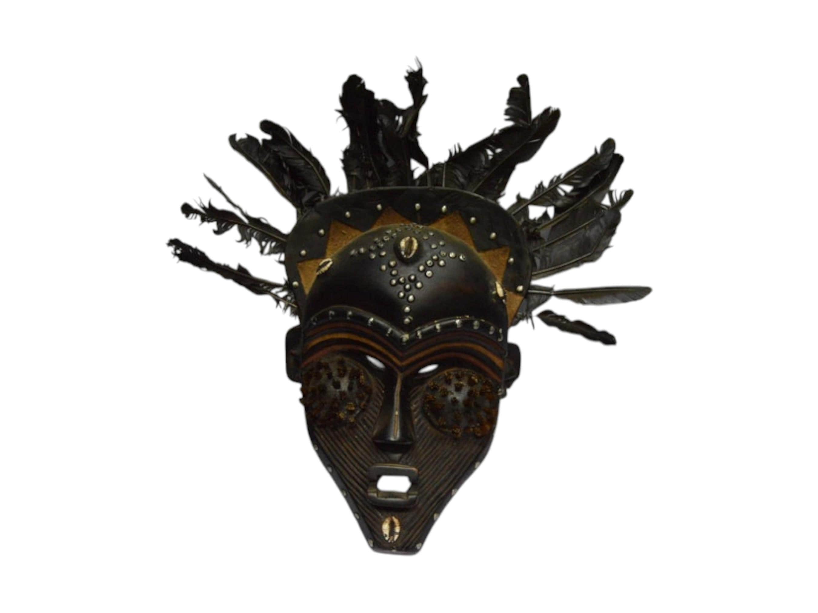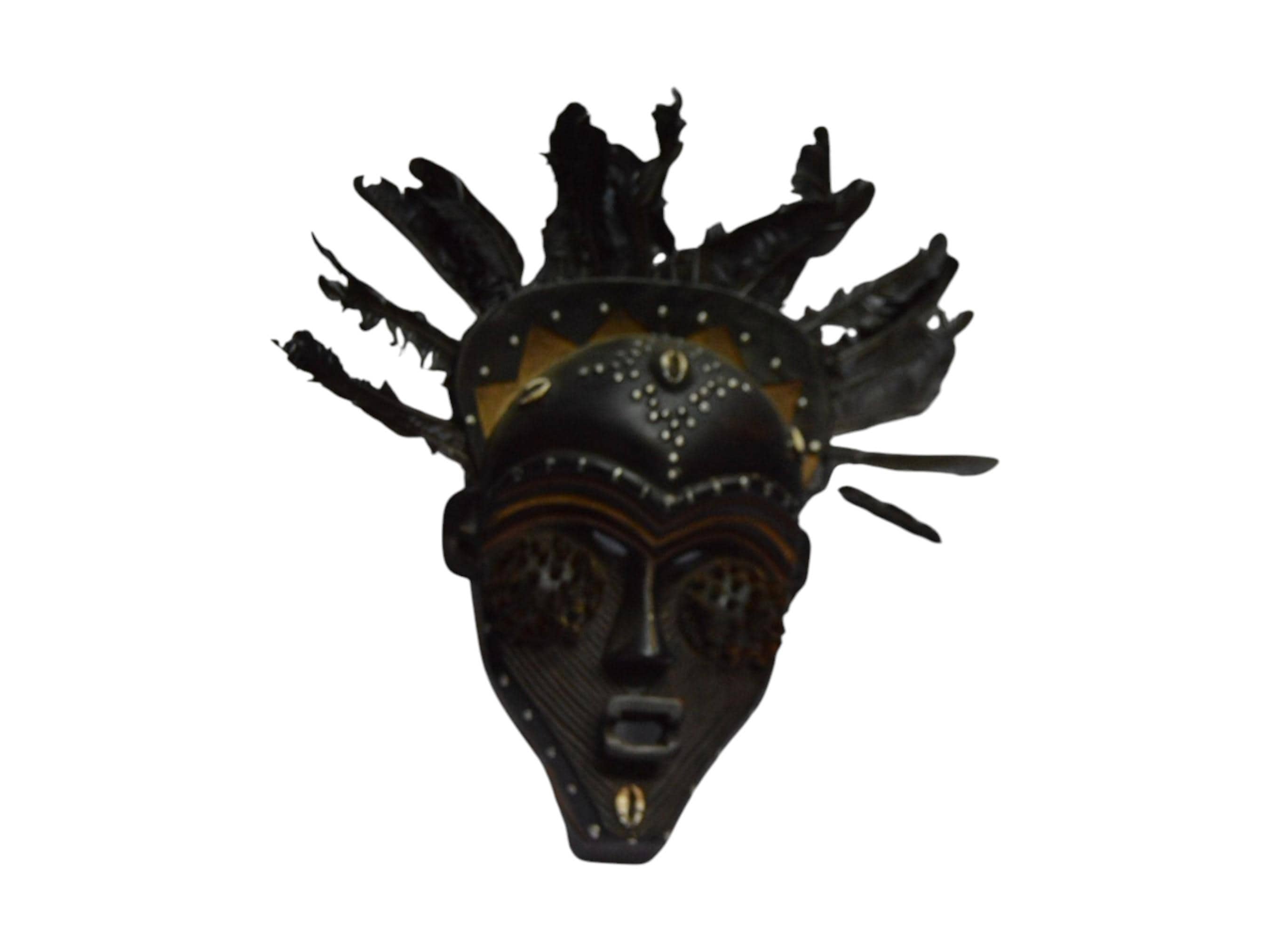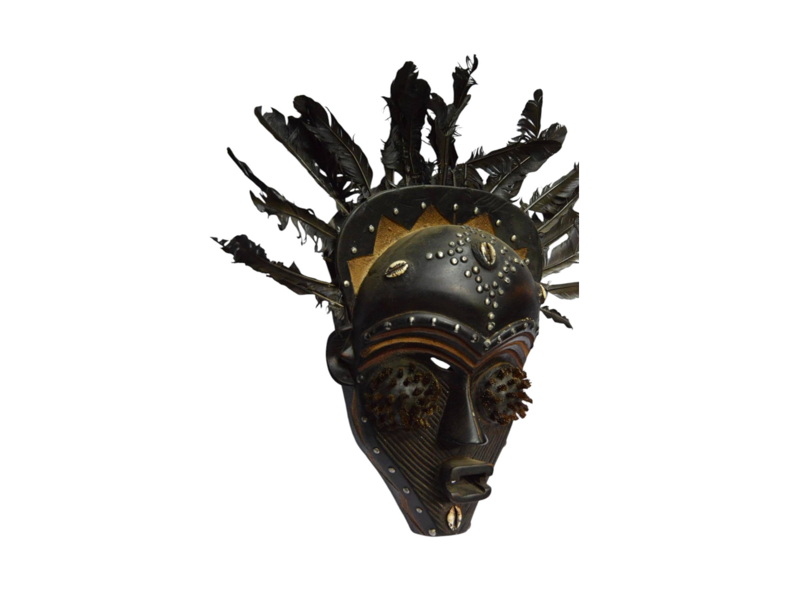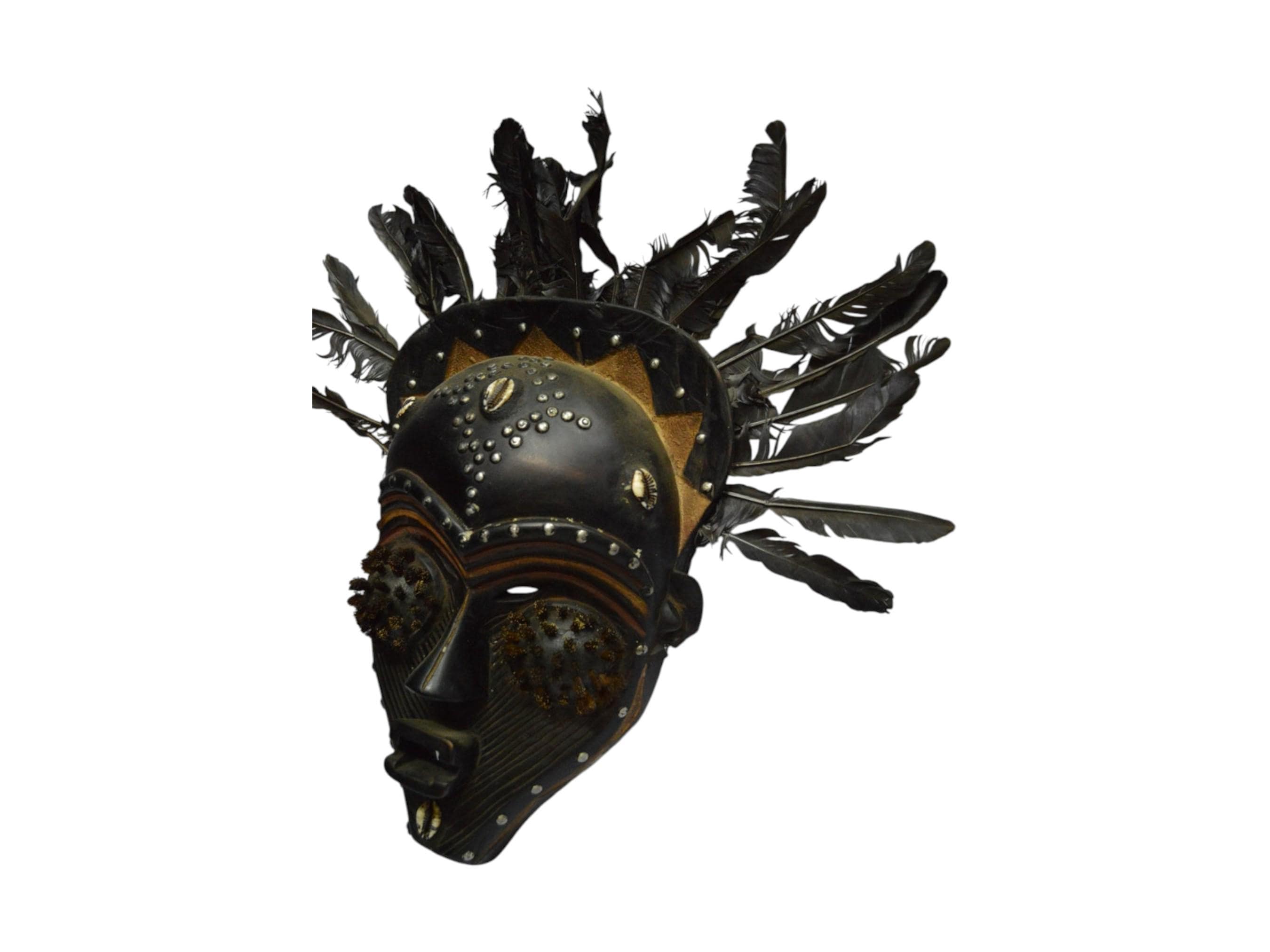 This dramatic, elaborate African ceremonial mask is a powerful piece of tribal art, featuring symmetrical features and deeply carved surface textures. The mask is highly embellished with decorative elements, including metal studs, small stones, and eye-catching cowrie shells placed prominently on the forehead and chin. Its most striking feature is the dramatic headdress, adorned with a spray of dark, genuine feathers, suggesting its use in significant rituals or dances. This hand carved wooden mask has a dark, rich patina and is beautifully crafted, reminiscent of the refined styles found among the Guro or Baule people. It is a spectacular and truly unique African collectible that commands attention wherever it is displayed. Searching for a high-impact item? This piece makes an unforgettable gift for serious art collectors and world history enthusiasts. It functions perfectly as an elegant and ethnic wall hanging, creating a sophisticated focal point in any living space. This extraordinary piece of ceremonial art is ready to hang and immediately elevate your home or office décor.