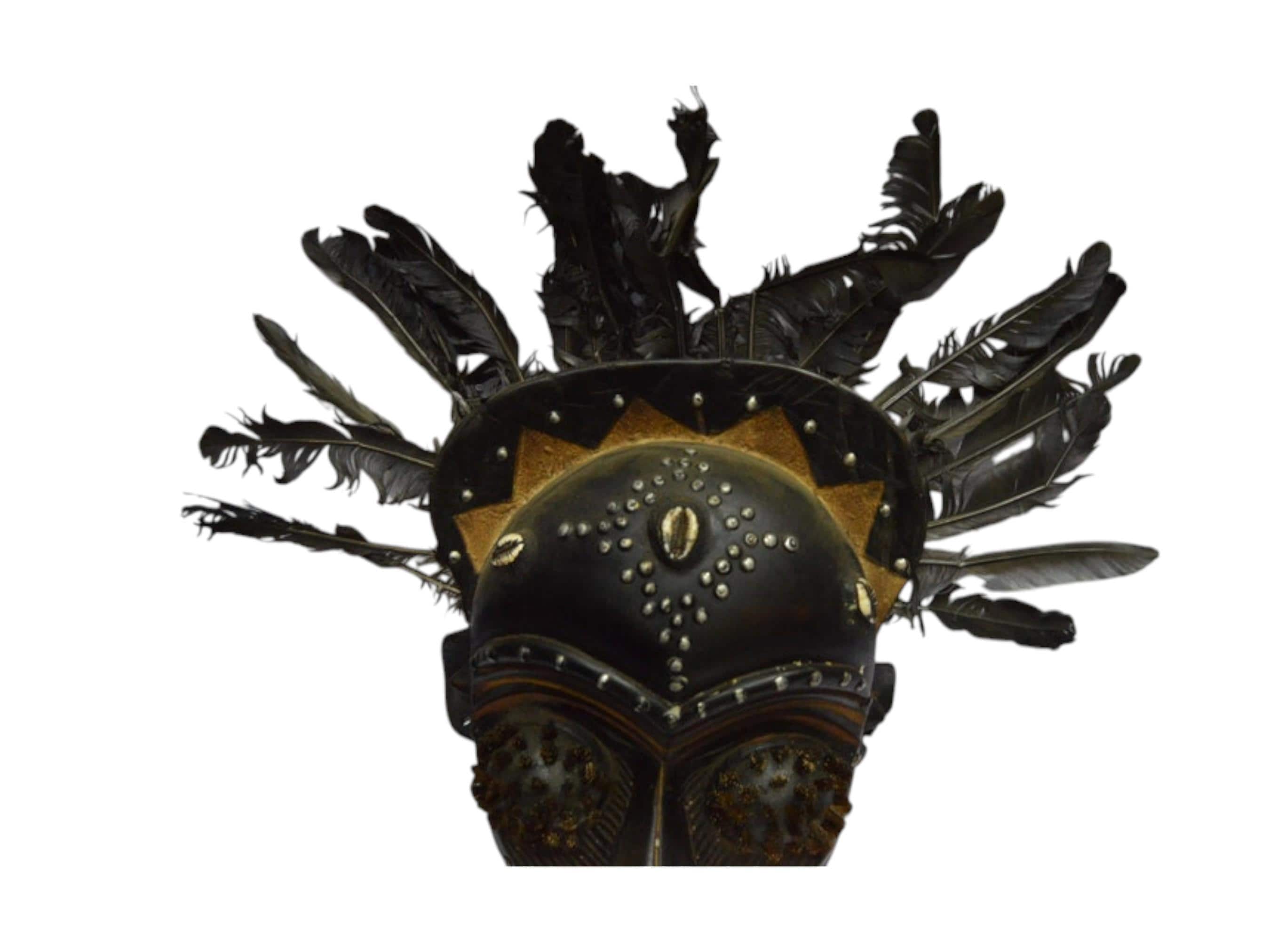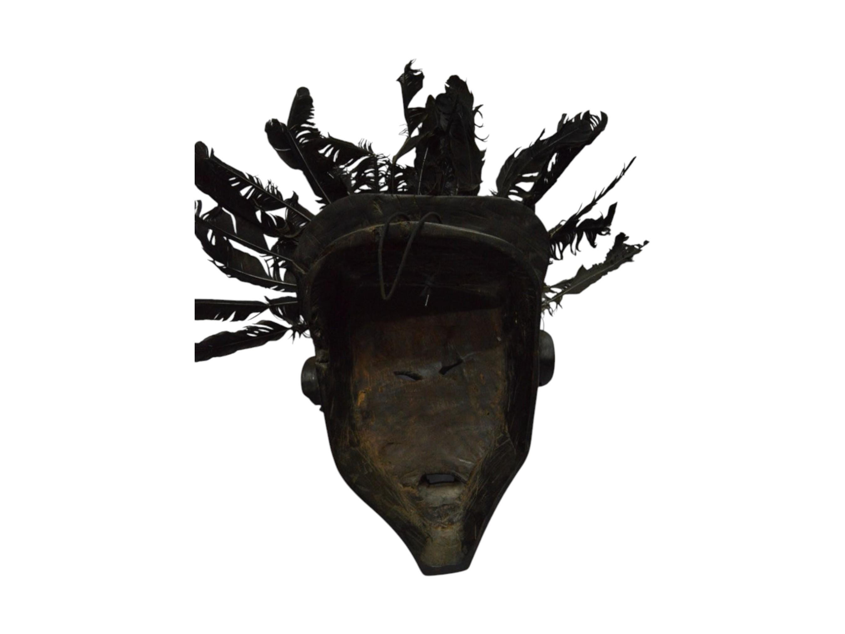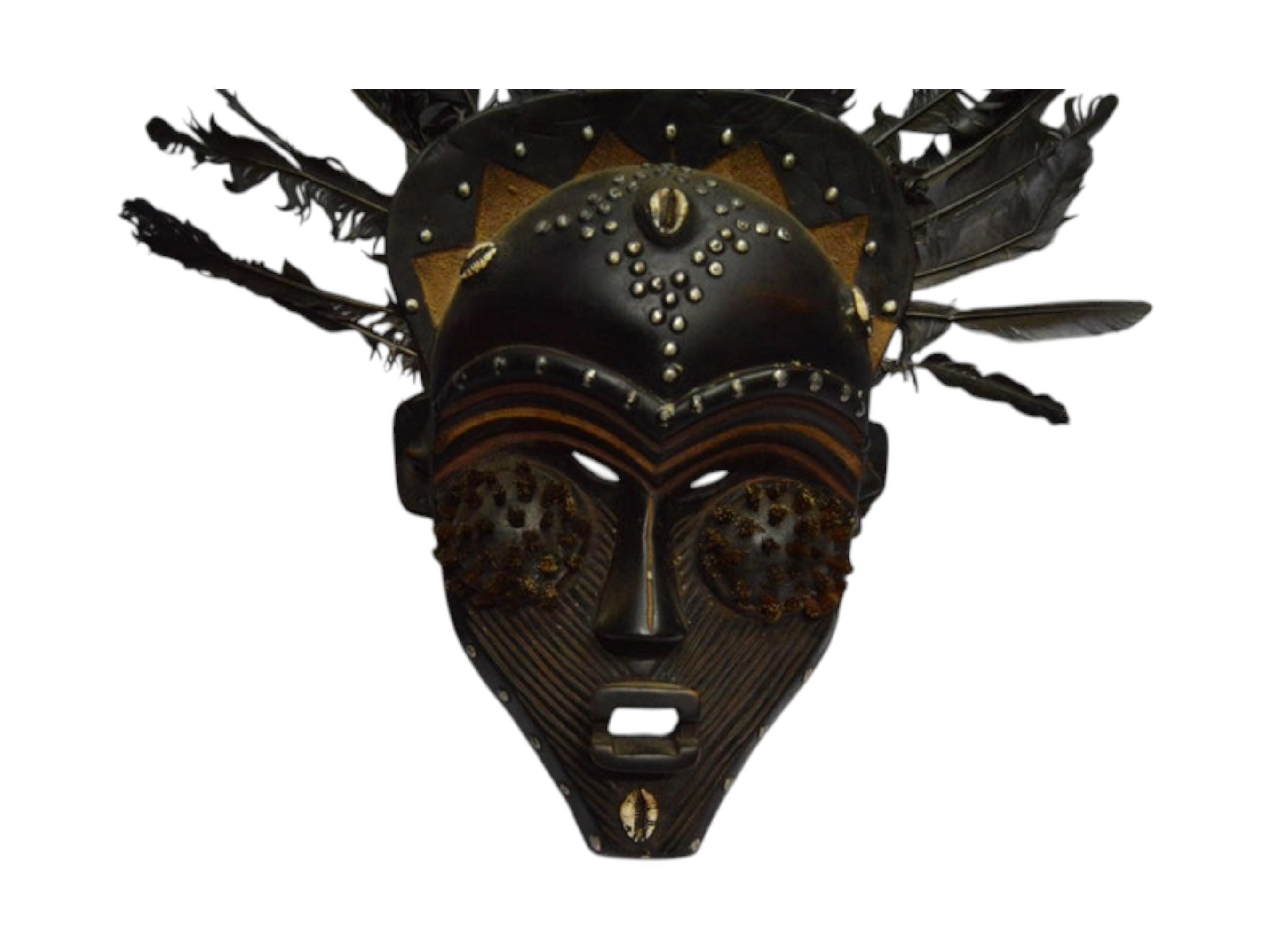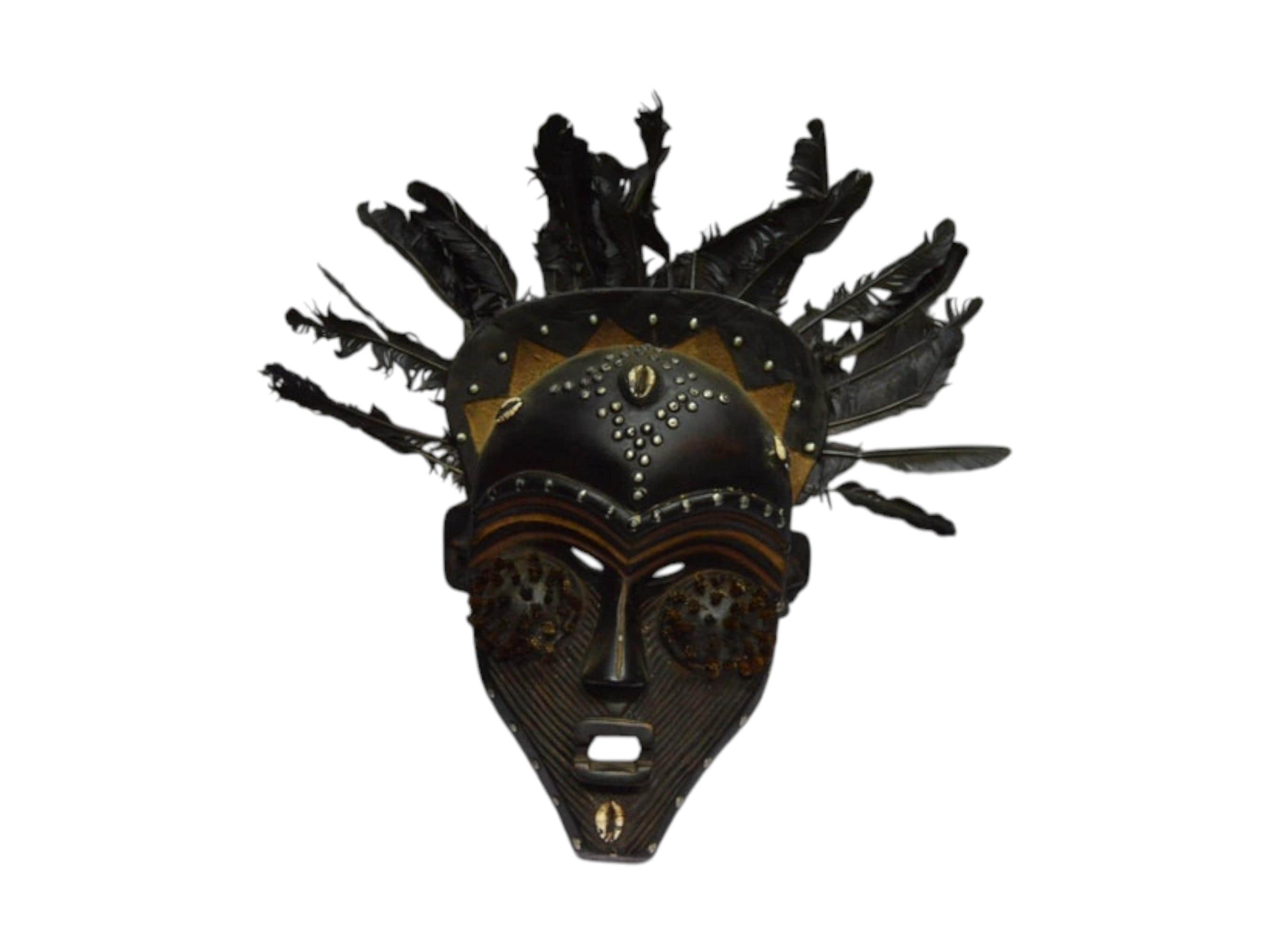 This dramatic, elaborate African ceremonial mask is a powerful piece of tribal art, featuring symmetrical features and deeply carved surface textures. The mask is highly embellished with decorative elements, including metal studs, small stones, and eye-catching cowrie shells placed prominently on the forehead and chin. Its most striking feature is the dramatic headdress, adorned with a spray of dark, genuine feathers, suggesting its use in significant rituals or dances. This hand carved wooden mask has a dark, rich patina and is beautifully crafted, reminiscent of the refined styles found among the Guro or Baule people. It is a spectacular and truly unique African collectible that commands attention wherever it is displayed. Searching for a high-impact item? This piece makes an unforgettable gift for serious art collectors and world history enthusiasts. It functions perfectly as an elegant and ethnic wall hanging, creating a sophisticated focal point in any living space. This extraordinary piece of ceremonial art is ready to hang and immediately elevate your home or office décor.