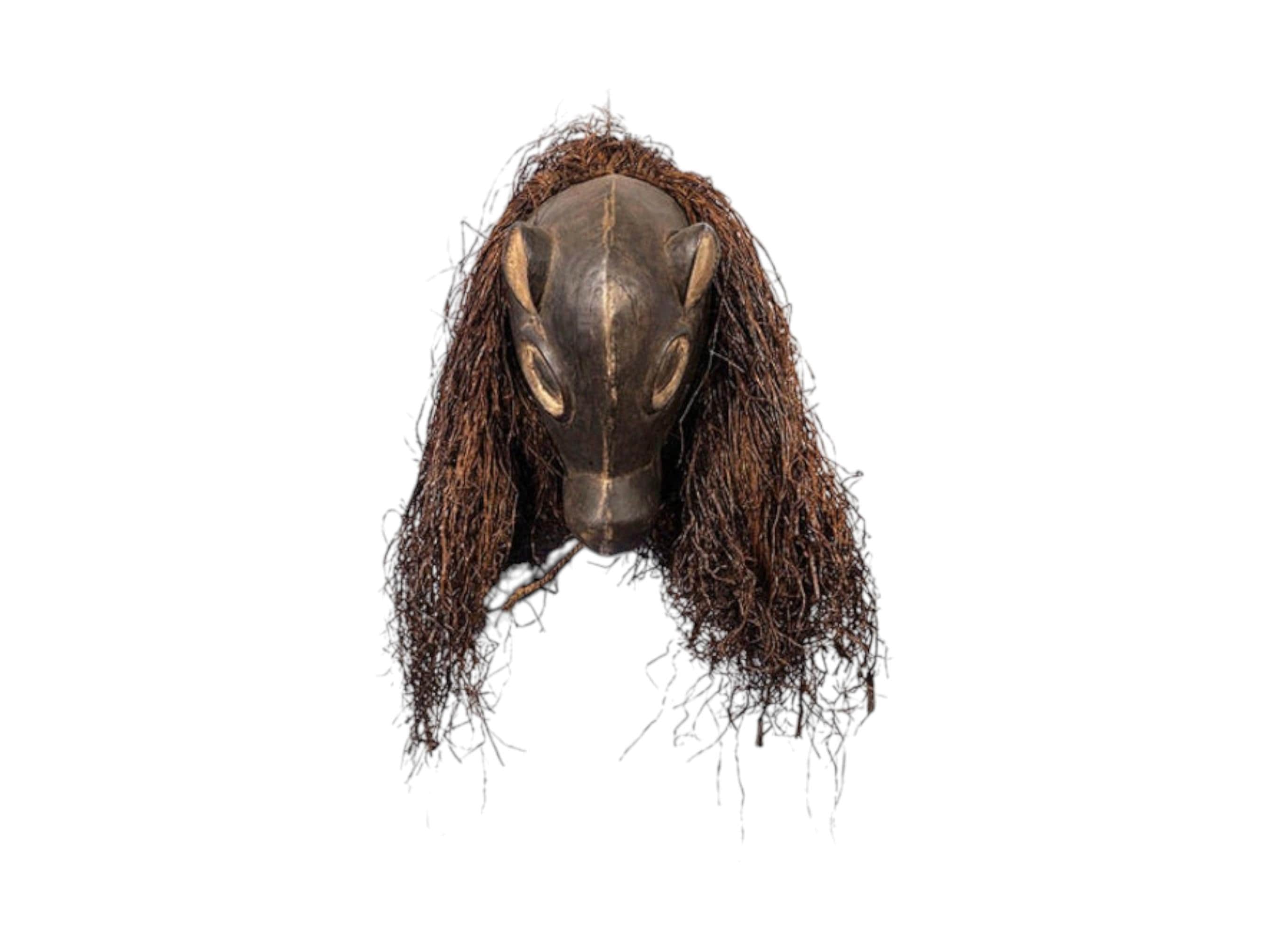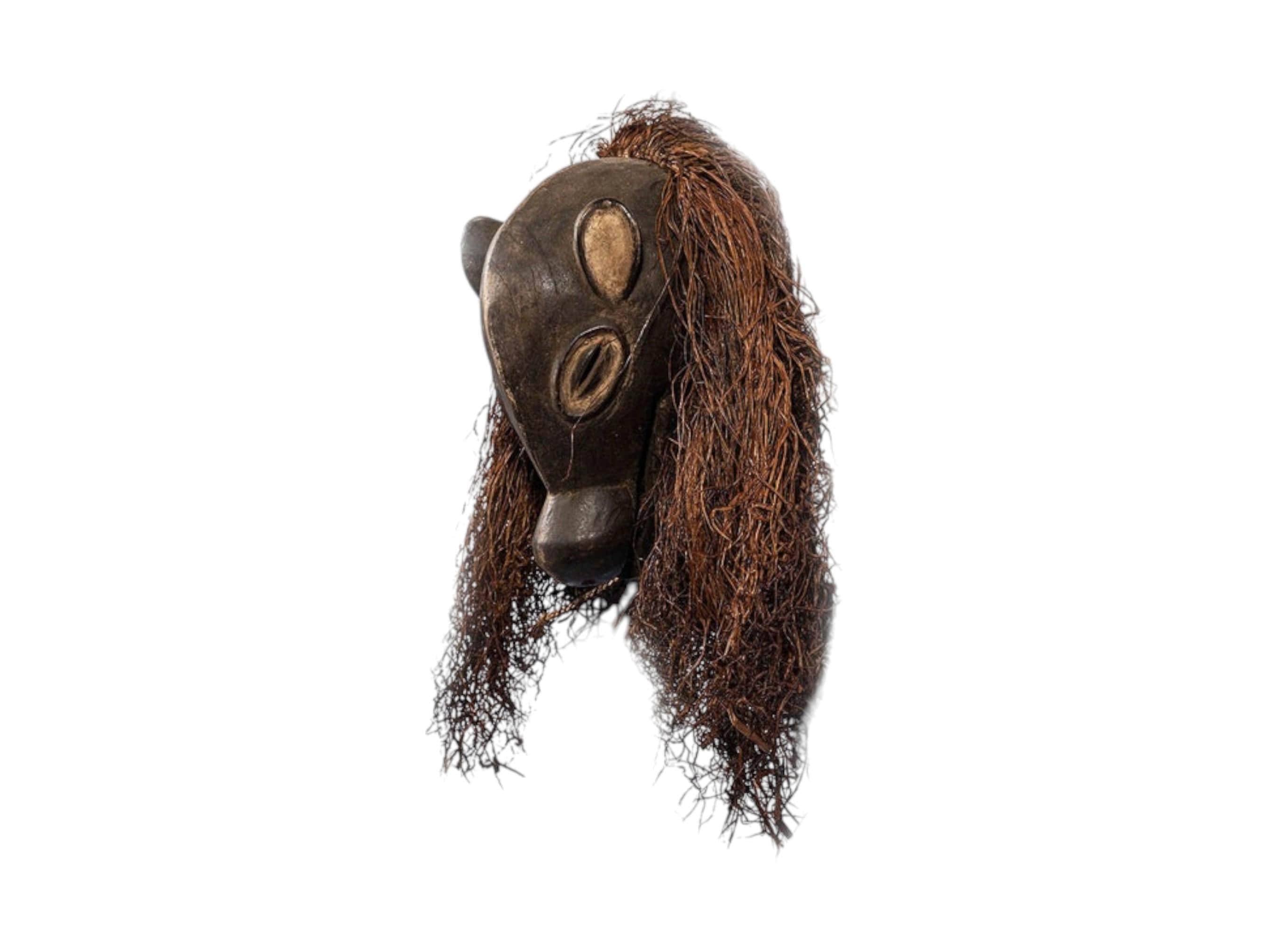 This dramatic authentic Yaka tribal mask is a striking example of African wooden art, traditionally created by the Yaka people of the Congo (DRC) region. The mask features the tribe’s signature style, characterized by a pronounced, upward-turned snout and large, stylized eyes. An imposing cascade of dark raffia fiber forms the hair or mane, adding tremendous volume and dramatic texture to the piece. This is a genuinely exceptional and authentic ethnic art collectible for serious enthusiasts of Central African traditions. The mask's powerful, animalistic presence makes it an ideal statement piece for bohemian or rustic wall decor. It adds a sense of worldliness and history to any living room, den, or gallery space. Searching for a truly unique gift? This hand carved mask is perfect for collectors of rare tribal artifacts and global art. This extraordinary Yaka animal mask is ready to hang, immediately transforming a space with its captivating cultural presence.