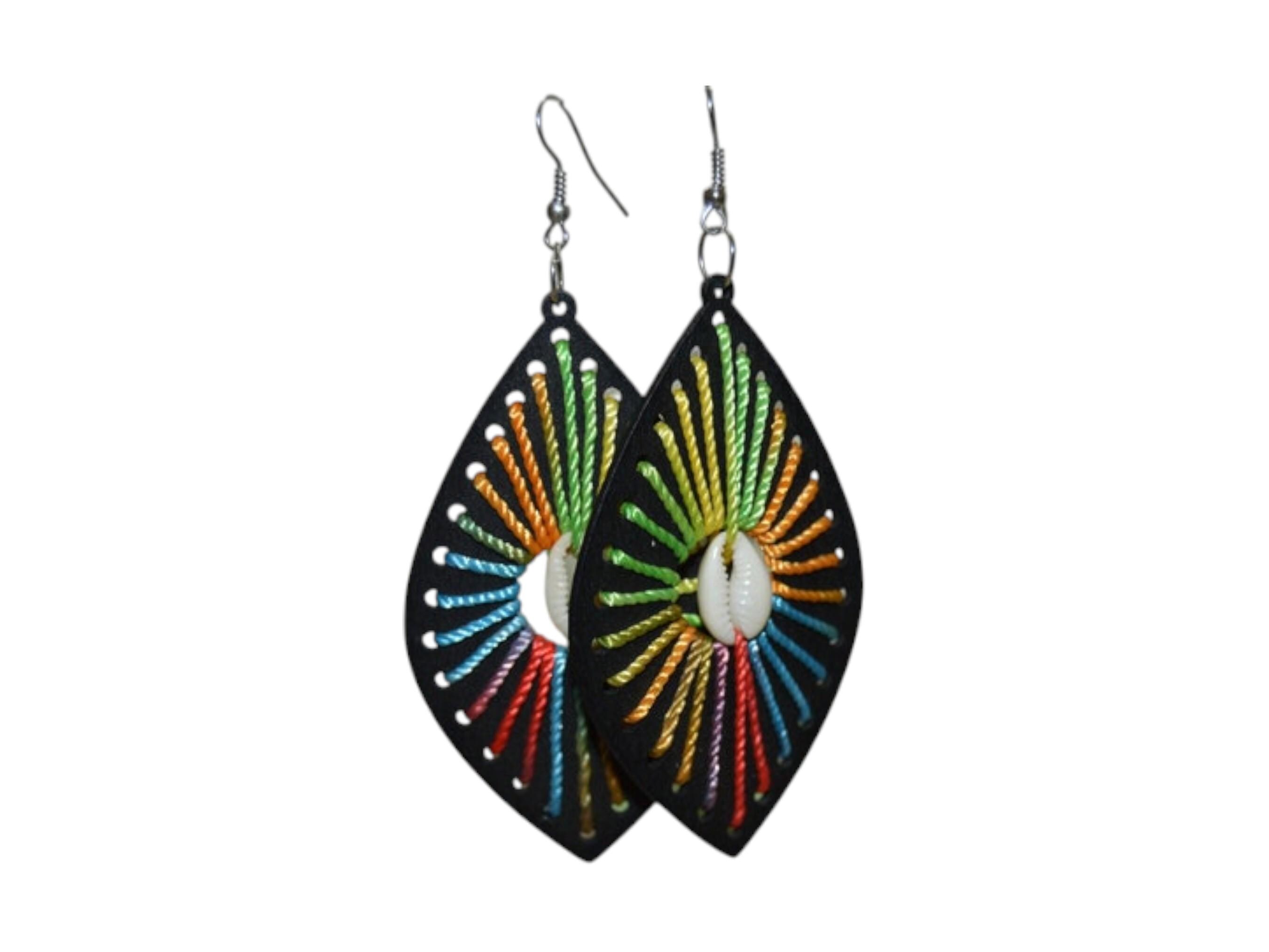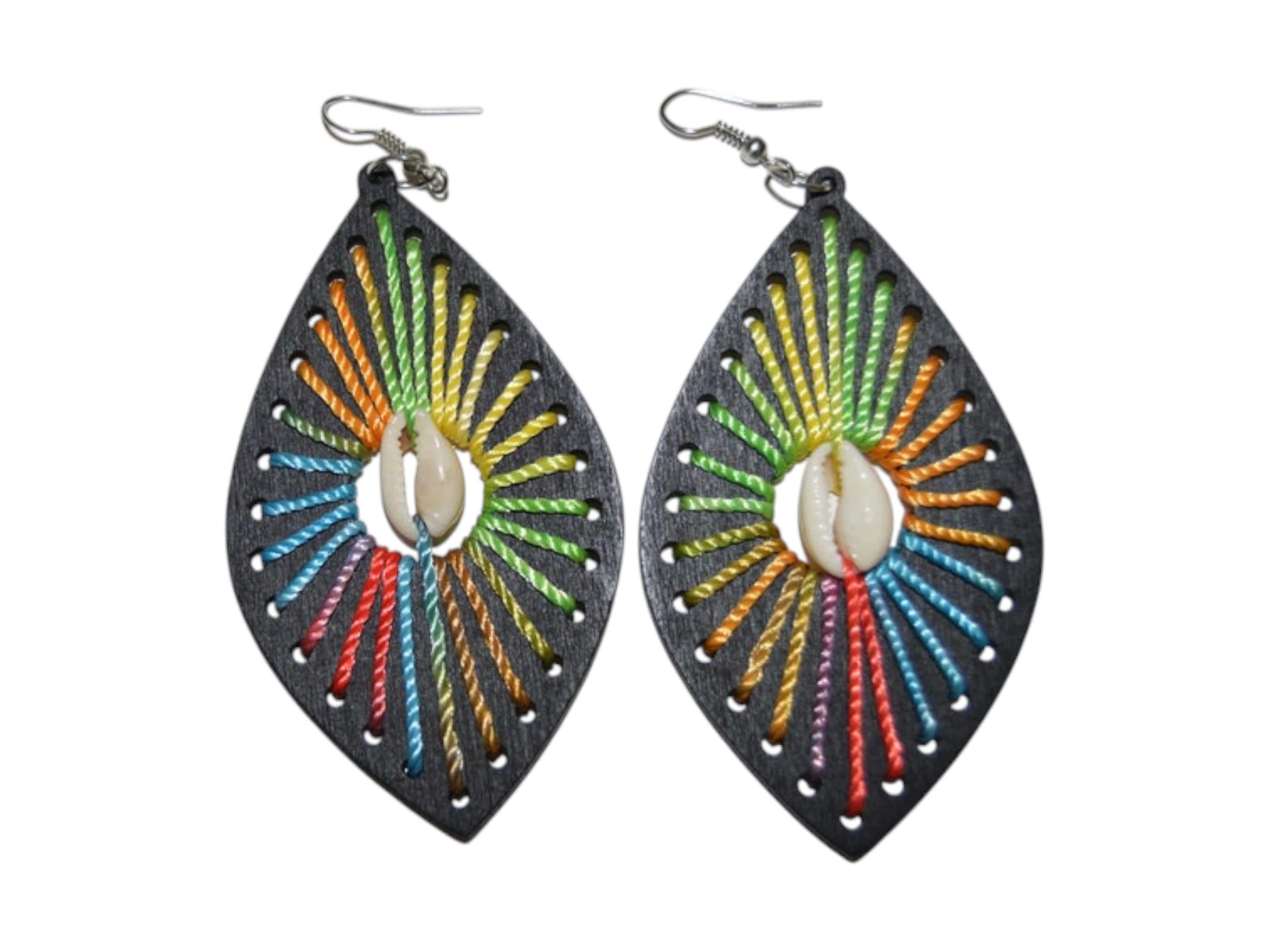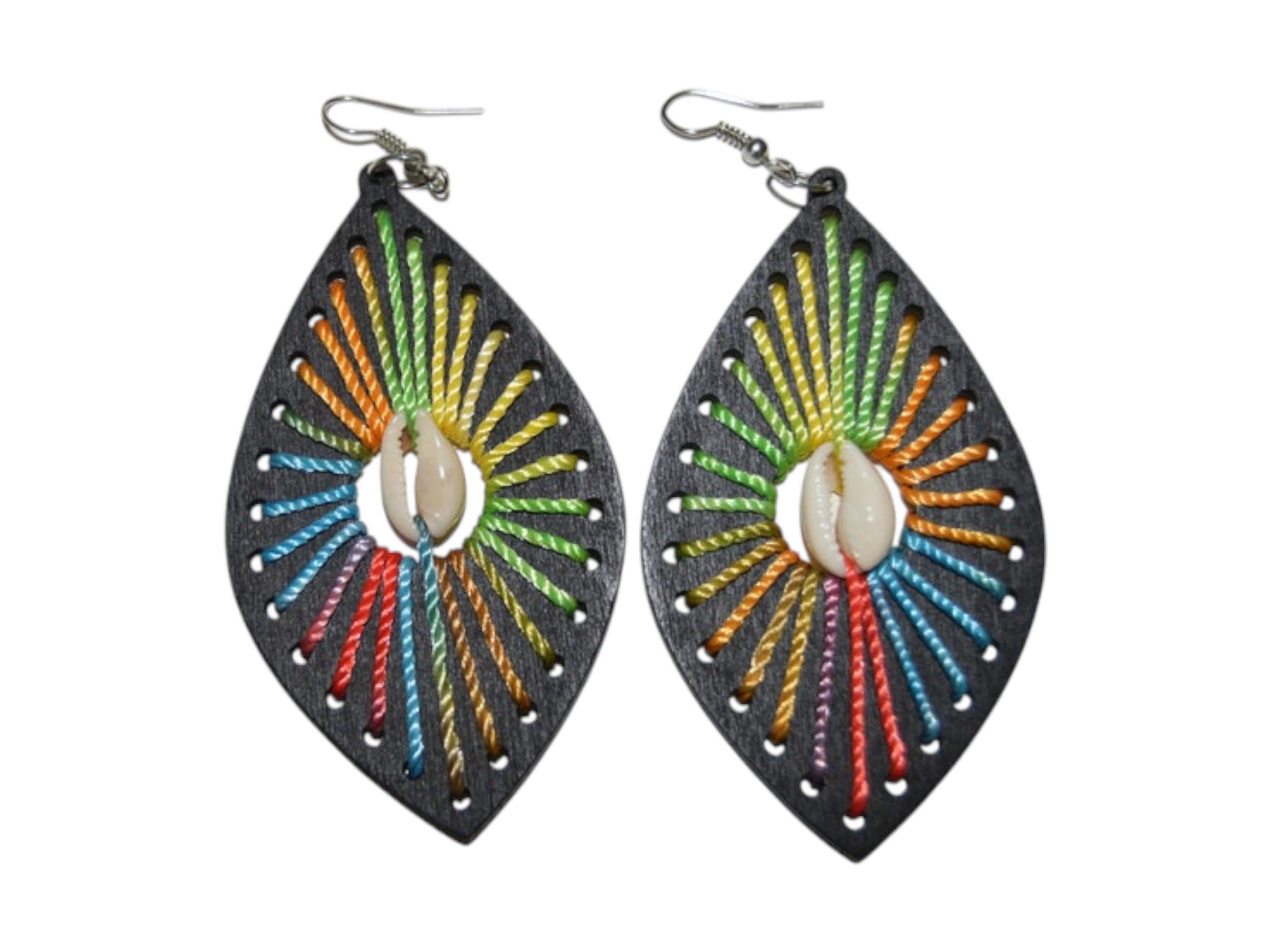 These stunning vibrant handmade earrings are an exquisite piece of statement jewelry, perfect for adding a pop of color to any style. Each earring is crafted from a lightweight black wooden teardrop shape, providing an elegant, high-contrast backdrop. The standout feature is the unique rainbow thread art, meticulously hand-stitched to create a striking sunburst pattern within the frame. Centered in the design is a small, natural cowrie shell, which adds an authentic African ethnic element and symbolizes prosperity. This detailed string art jewelry makes a powerful bohemian statement piece, ideal for festivals, summer vacations, or everyday fashion. The lightweight design ensures these large dangle earrings won't pull on your ears, making them a comfortable favorite. Searching for a memorable present? These unique wood and thread earrings make a thoughtful gift for her, perfect for birthdays or anniversaries. These beautiful rainbow earrings are ready to ship and will quickly become a cherished and unique part of your accessory collection.