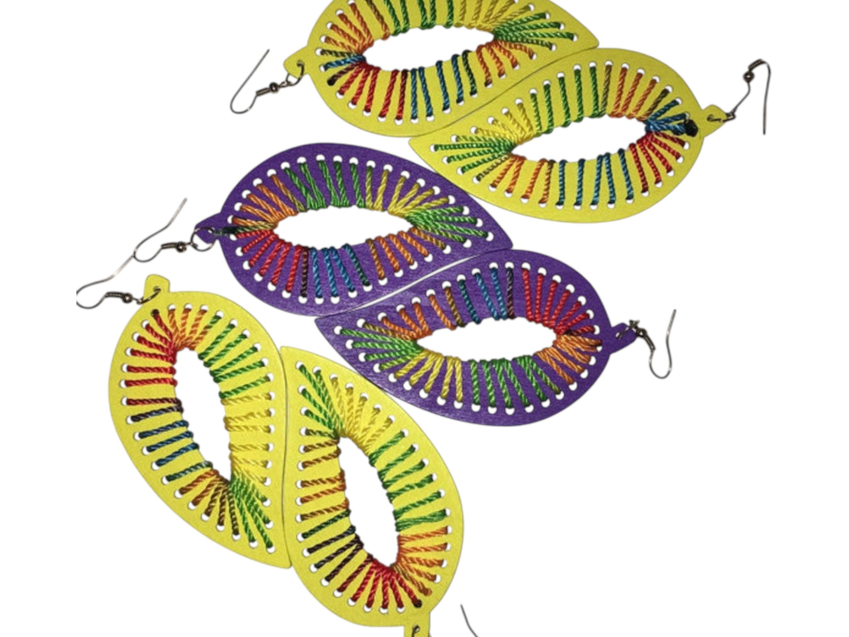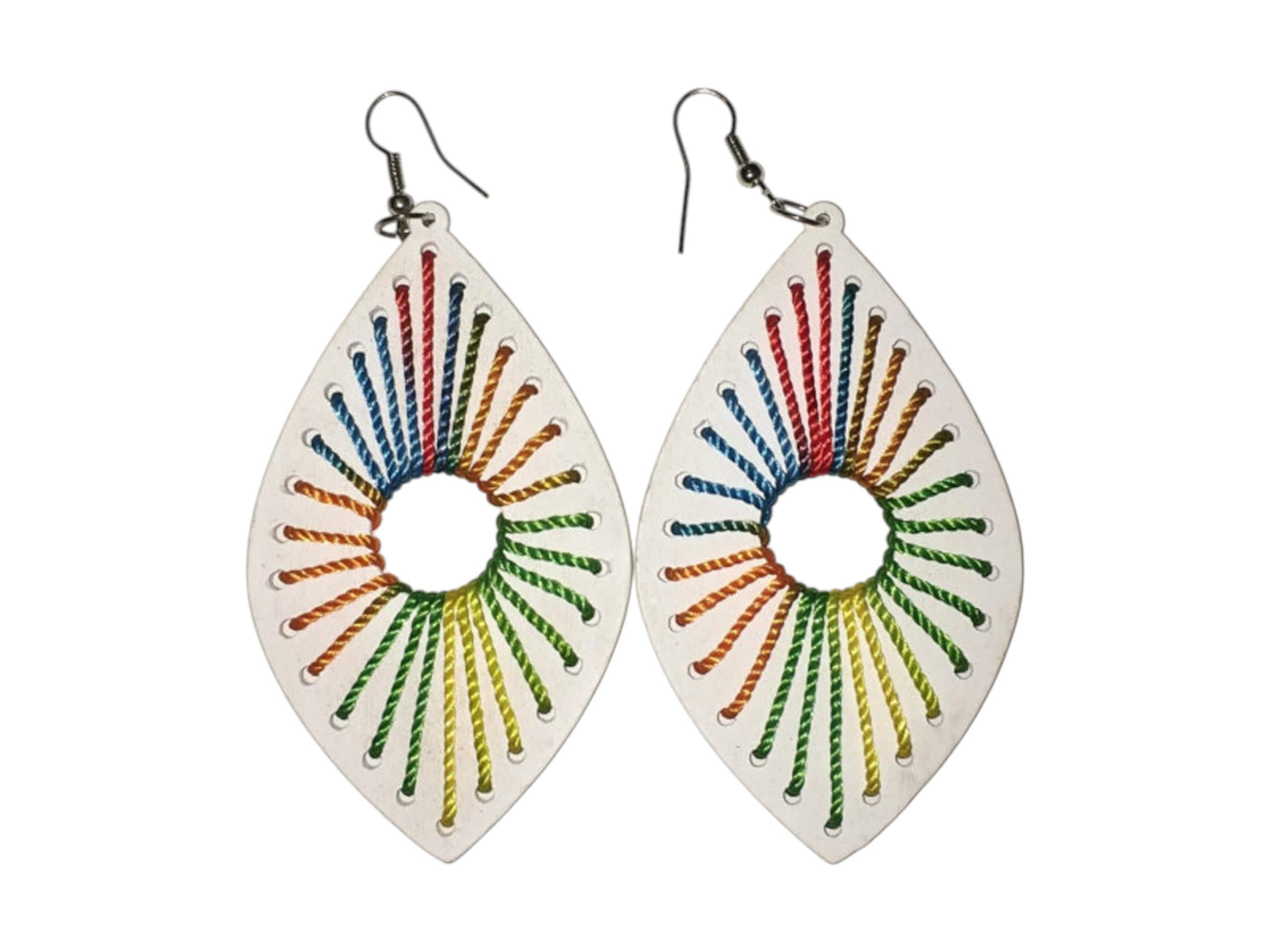These stunning vibrant handmade earrings are the perfect accessory, effortlessly blending a clean aesthetic with a bold burst of color. Each piece is crafted from a lightweight wooden teardrop shape, painted a crisp white, ensuring comfort for all-day wear. The standout feature is the unique rainbow thread art, meticulously hand-stitched to create a striking sunburst pattern within the frame. This detailed string art jewelry makes a powerful boho statement piece, ideal for summer festivals, vacation wear, or brightening up everyday style. The lightweight design ensures these large dangle earrings won't pull on your ears, making them a comfortable favorite. Searching for a memorable present? These unique wooden earrings make a thoughtful gift for her, perfect for birthdays or a 'just because' surprise. The clean white wood ensures this modern statement jewelry pairs easily with any outfit. These beautiful rainbow earrings are ready to ship and will quickly become a cherished part of any jewelry collection.