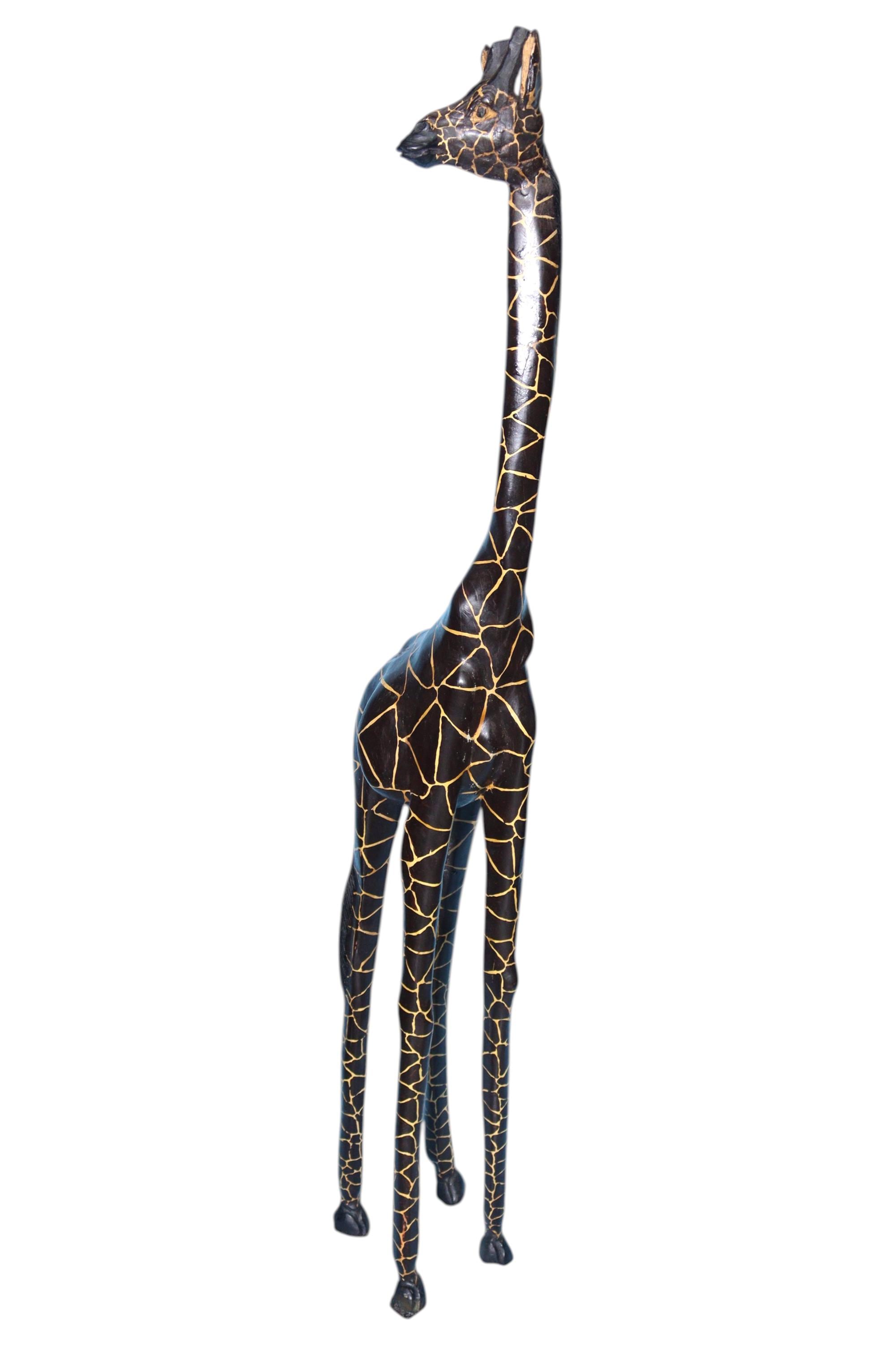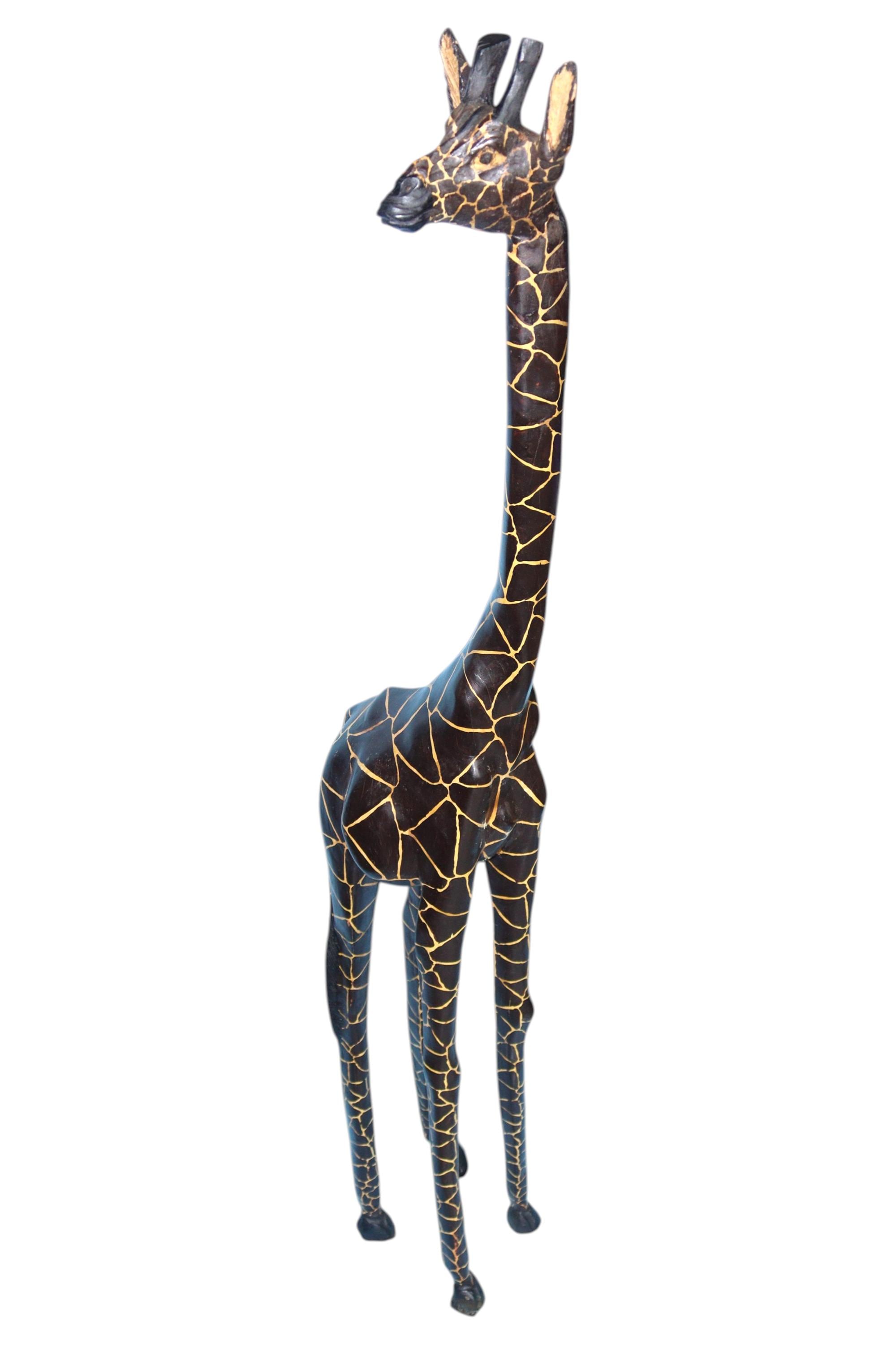 This magnificent extra tall wooden giraffe statue is a stunning piece of African sculpture, commanding attention in any space. The statue is expertly hand carved from solid wood, featuring the elegant, elongated neck and slender legs characteristic of the animal. Its surface boasts a unique, artistic crackle finish (or mosaic/cracked-earth look) that highlights the giraffe's iconic markings in gold or white. This spectacular African safari decor piece makes an instant statement as a unique floor or entryway accent. As a large hand carved animal sculpture, it's an ideal focal point for a living room, office, or child's nursery. This is a must-have ethnic art collectible for enthusiasts of global décor and wildlife themes. Searching for a truly grand and unique gift? This piece makes an unforgettable present for a lover of African culture or sophisticated home accents. This impressive wooden giraffe is ready to stand and instantly infuse your space with a touch of the wild.