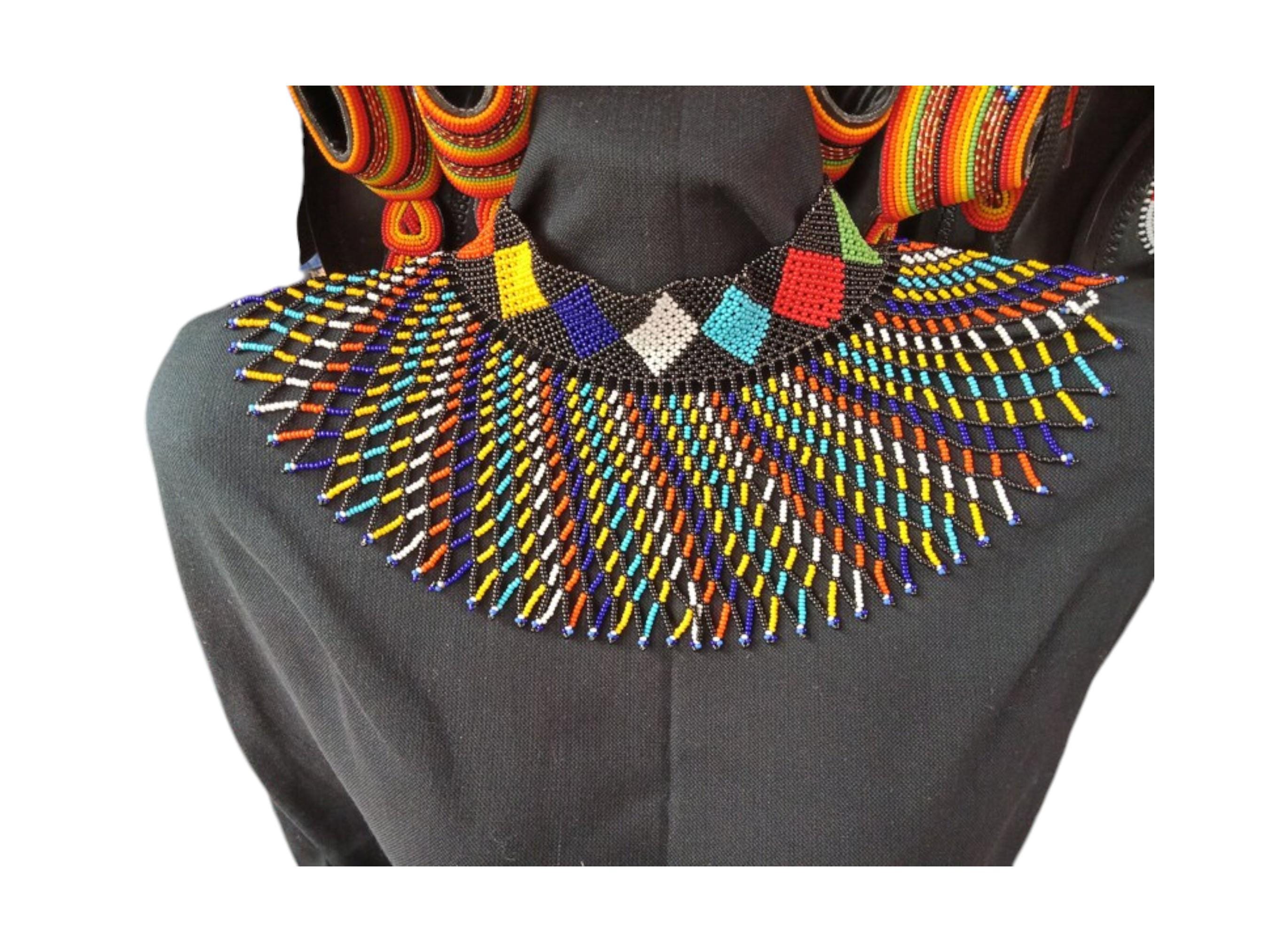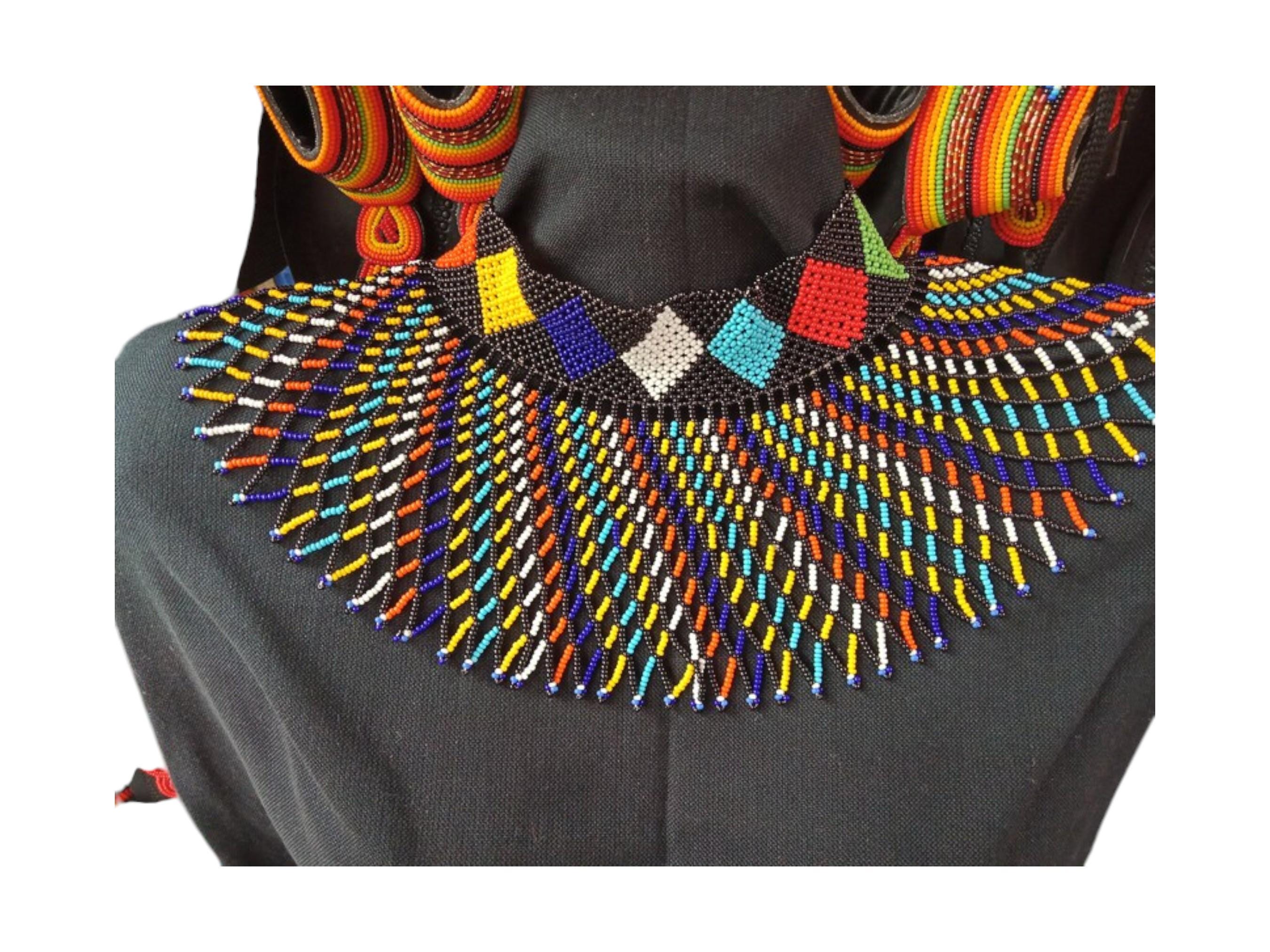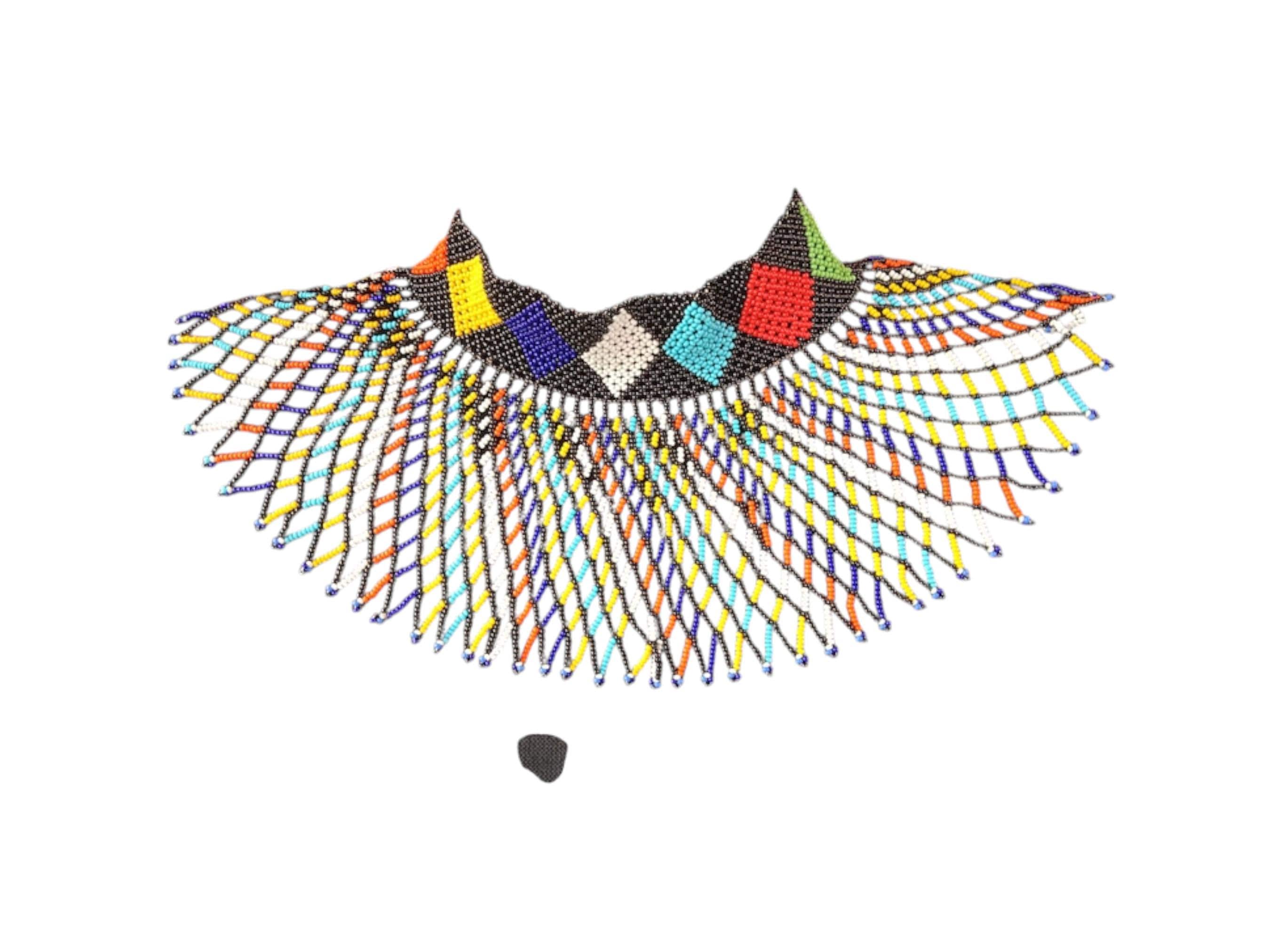 This stunning dramatic Maasai beaded collar necklace is a spectacular piece of wearable African art, reflecting the vibrant traditions of the Maasai people. The necklace is meticulously handcrafted, featuring countless tiny beads woven into an intricate, wide pattern that frames the neck and shoulders. It boasts a dark base, dramatically contrasted by a cascading fringe of bright blue, yellow, red, and white beads, creating a striking visual effect. The collar is designed to sit high on the neck, making it a bold, unforgettable statement jewelry piece. This piece is an authentic tribal choker, perfect for cultural enthusiasts and collectors of unique ethnic fashion. The quality of the beading and the traditional geometric design ensure this is a meaningful and unique accessory. Searching for an extraordinary gift? This Maasai necklace makes an unforgettable present for a lover of Bohemian style and global craftsmanship. This powerful handcrafted collar is ready to wear and instantly elevate any outfit with a touch of authentic African elegance.