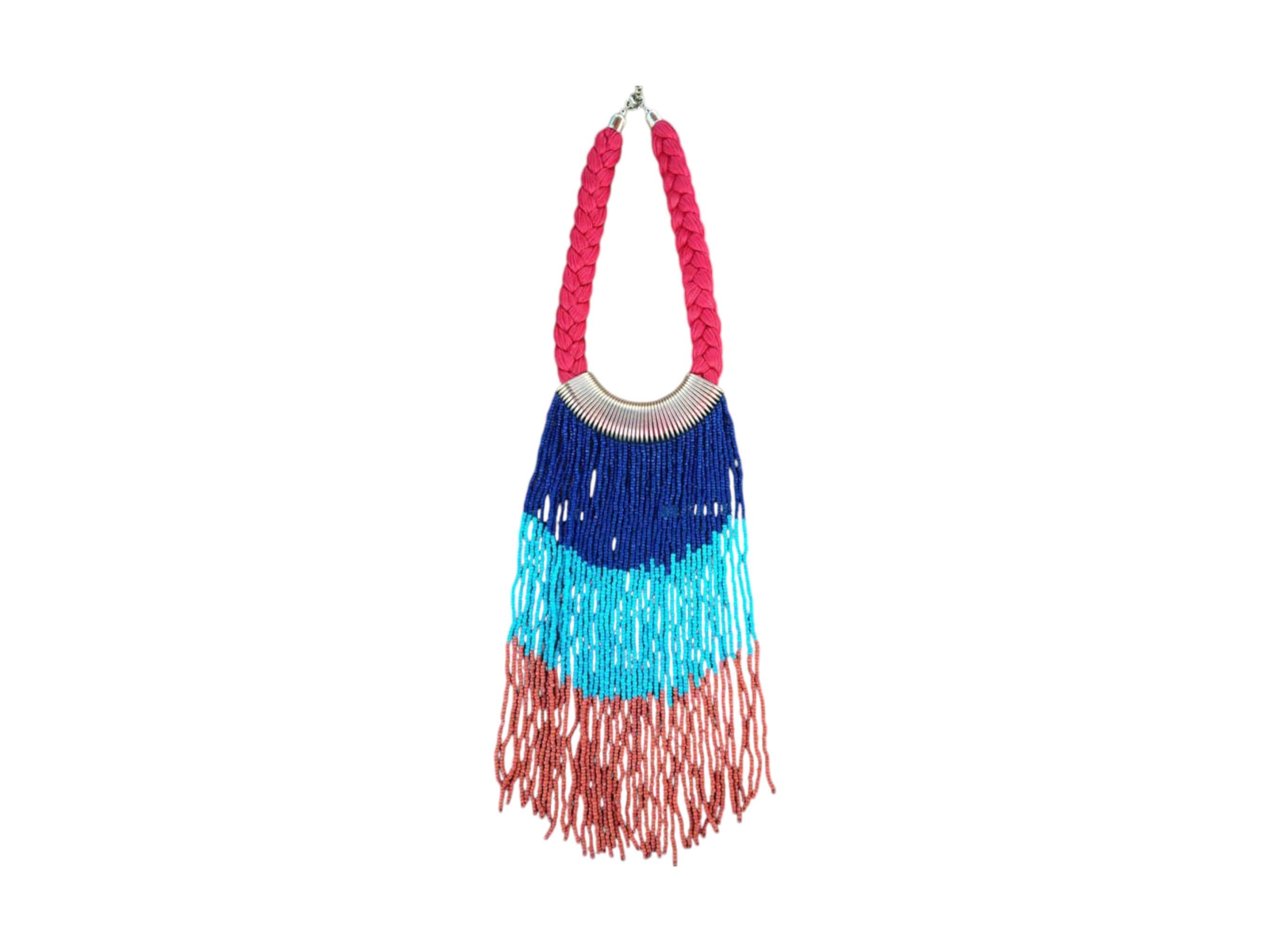 This stunning Bohemian beaded fringe necklace is a spectacular statement jewelry piece, blending traditional beadwork with modern textile elements. The top features a thick, hand-braided red textile collar that provides comfortable structure and a bold splash of color around the neck. Below the collar, a gold-toned metallic fan accent anchors the cascade of beads, adding a touch of elegant contrast. The body of the necklace is a dense field of tiny beads arranged in a distinct gradient of dark blue, vibrant teal, and terracotta orange fringe. This bold multicolored fringe creates a dramatic, layered effect, instantly elevating any plain top or outfit. This unique piece is perfect for enthusiasts of maximalist style, Bohemian fashion, or those who love to wear unique global art. Searching for an extraordinary gift? This handmade necklace makes an unforgettable present for a lover of bold colors and unique craftsmanship. This beautiful tribal choker style piece is ready to wear and instantly infuse your look with striking color and texture.