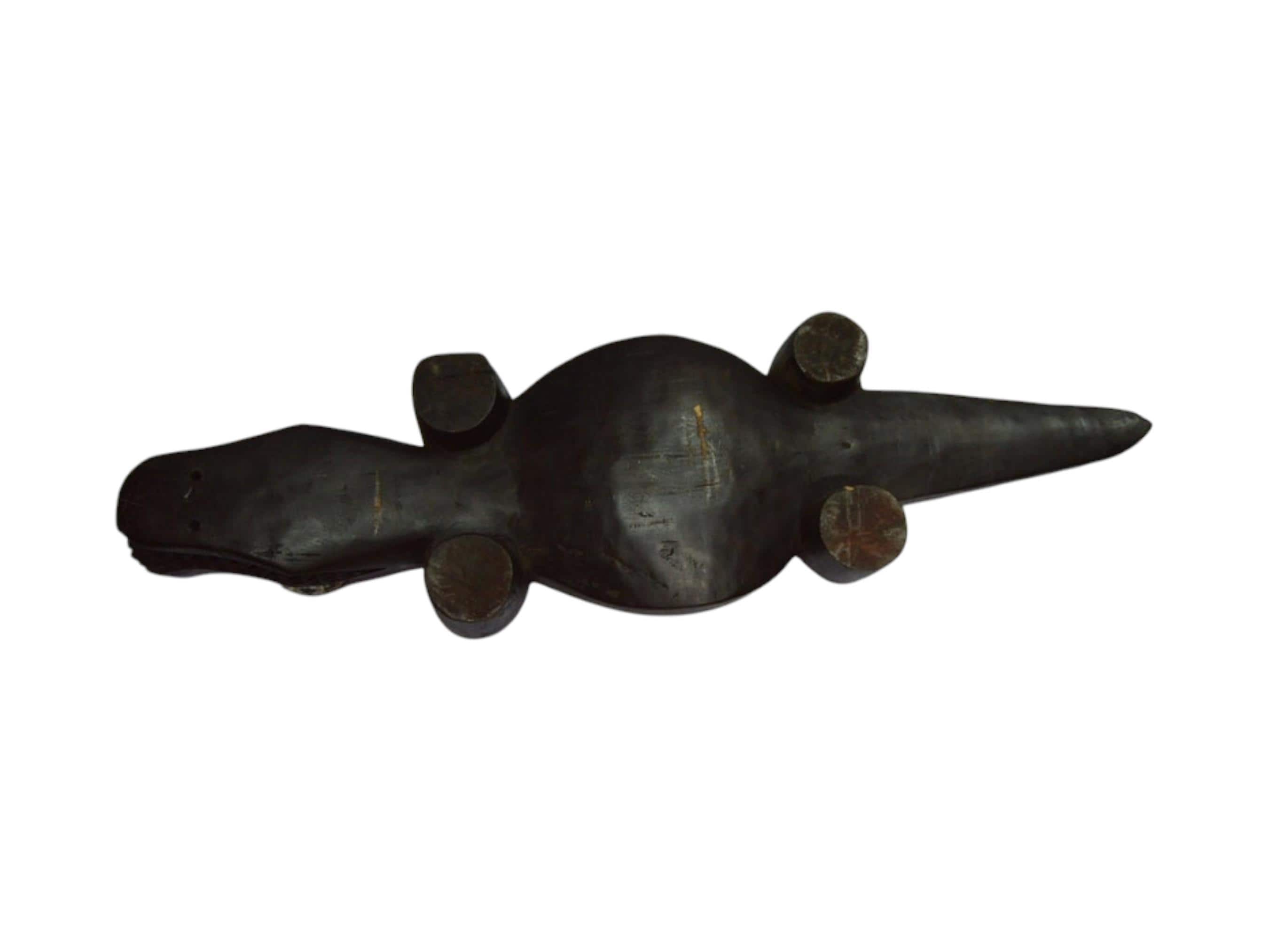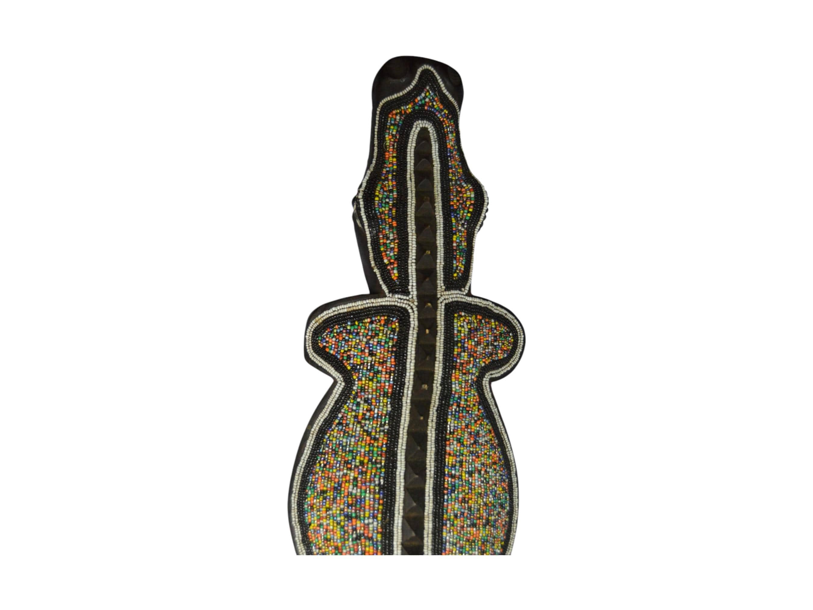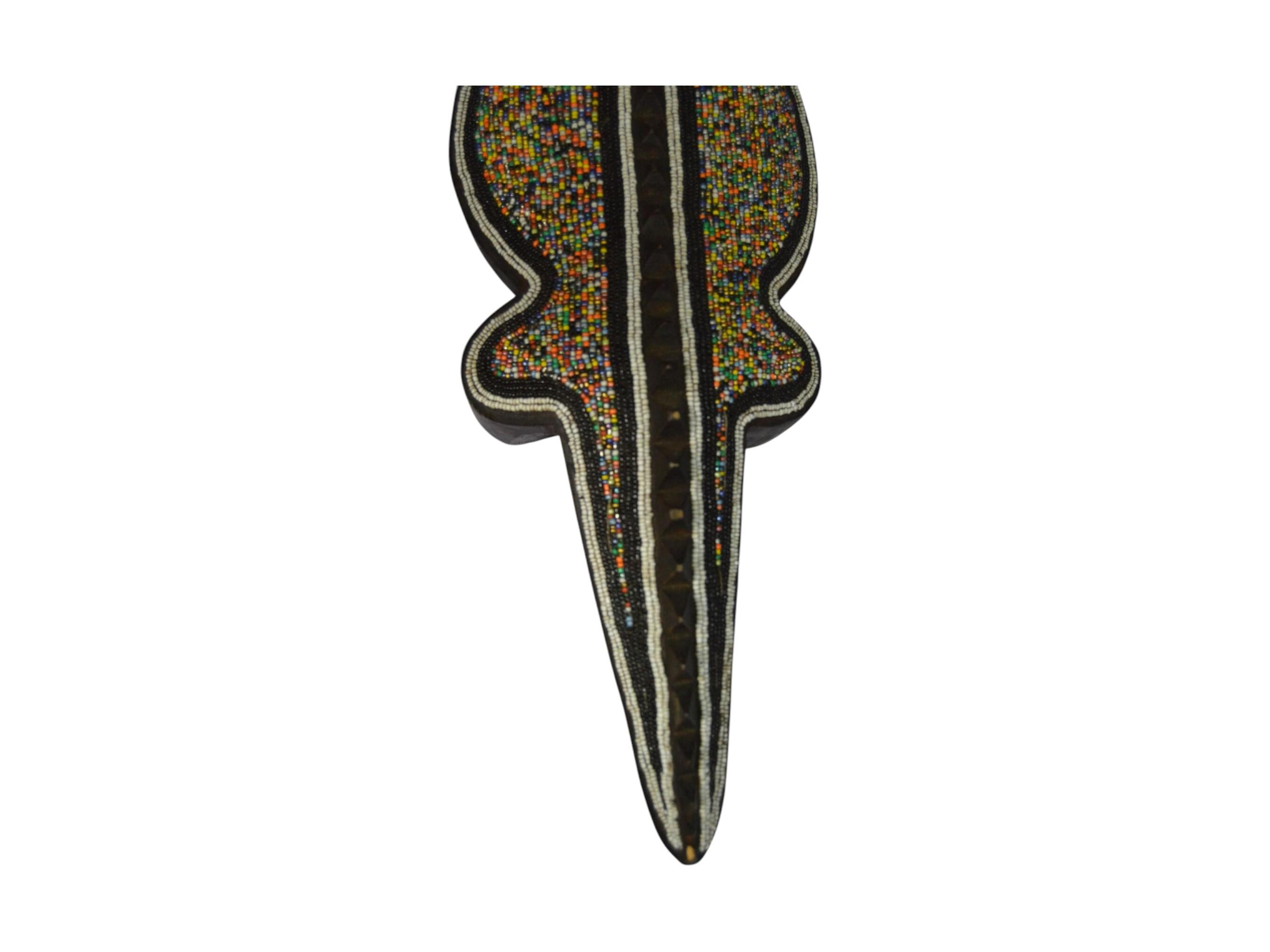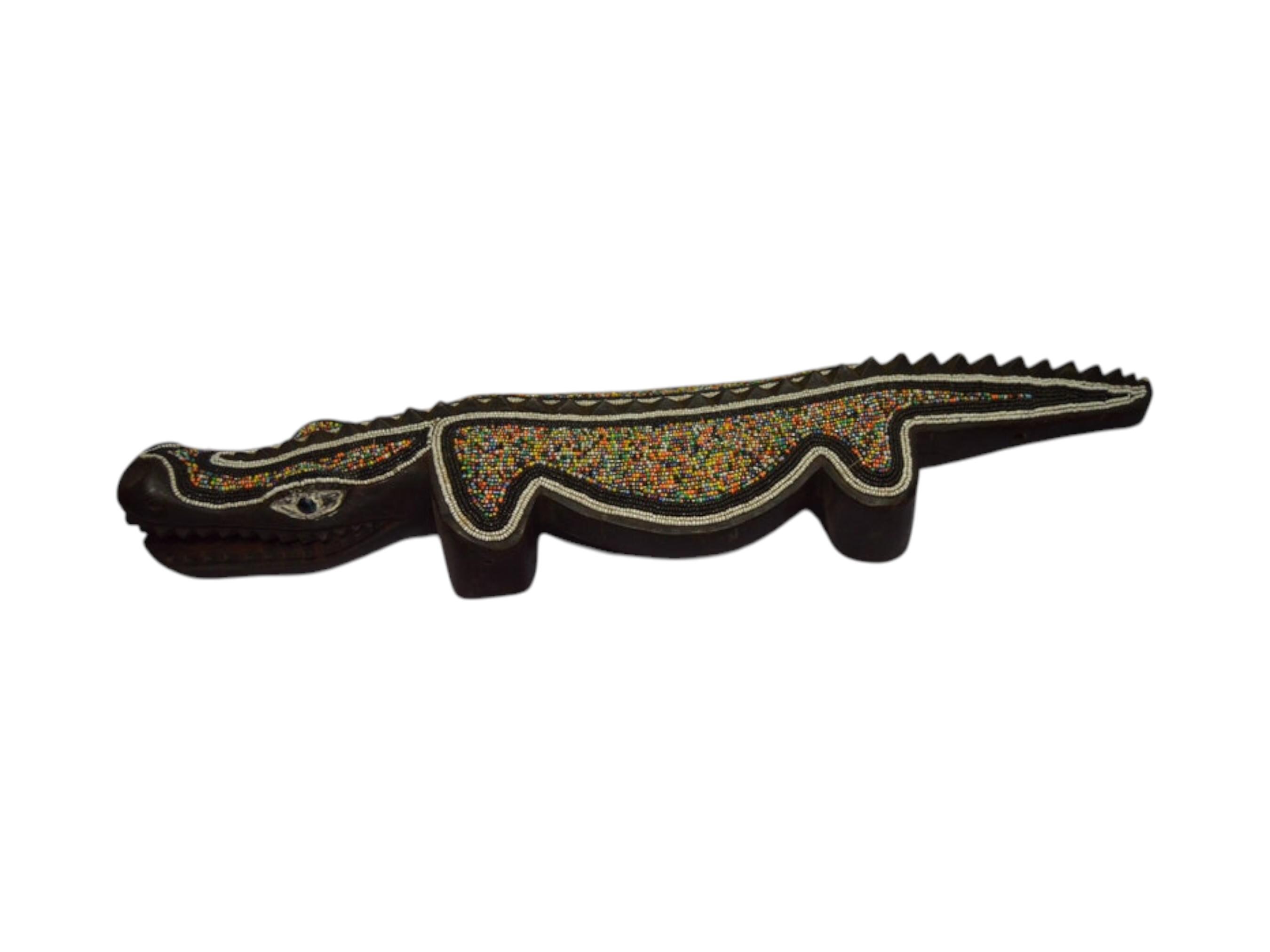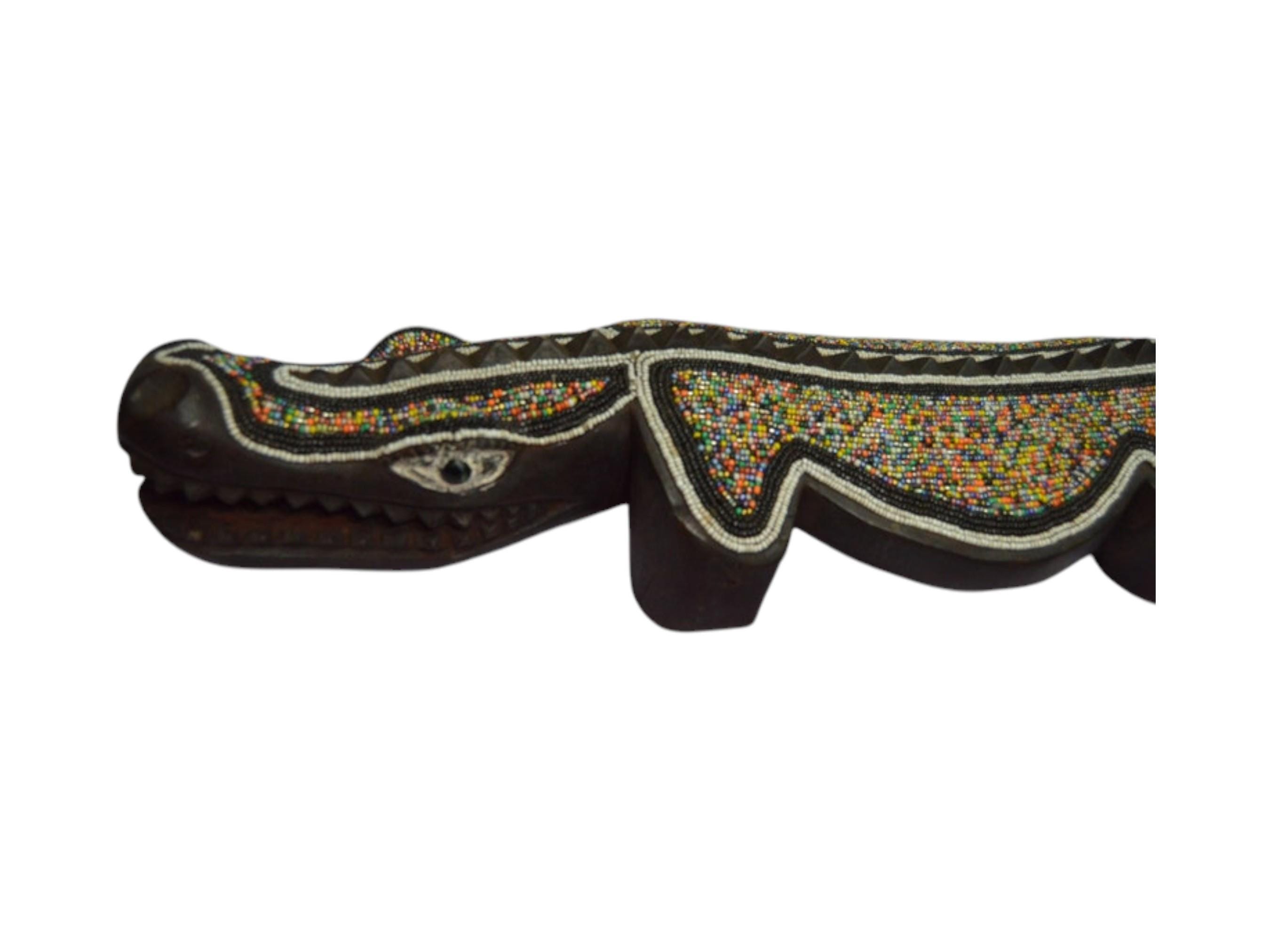 This exceptional hand carved crocodile sculpture is a unique fusion of African folk art and traditional beadwork. The base is expertly carved from a rich, dark ebony wood (or similar dark hardwood), capturing the powerful silhouette of the crocodile. Its back and head are intricately covered with thousands of tiny seed beads, creating a vibrant, multicolored mosaic pattern. The beadwork is accented with bold white outlines, emphasizing the contours of the animal and its fierce eyes. This striking safari animal collectible is perfect as a unique conversation piece for a mantel, bookshelf, or executive desk. As an authentic piece of tribal decor, it showcases the incredible skill and patience of the artisan. Searching for a truly distinctive piece of wildlife art? This beaded wooden crocodile is an ideal gift for a collector or an enthusiast of unique global artifacts. This magnificent African art statue is ready to display and instantly infuse your home with bold style and culture.