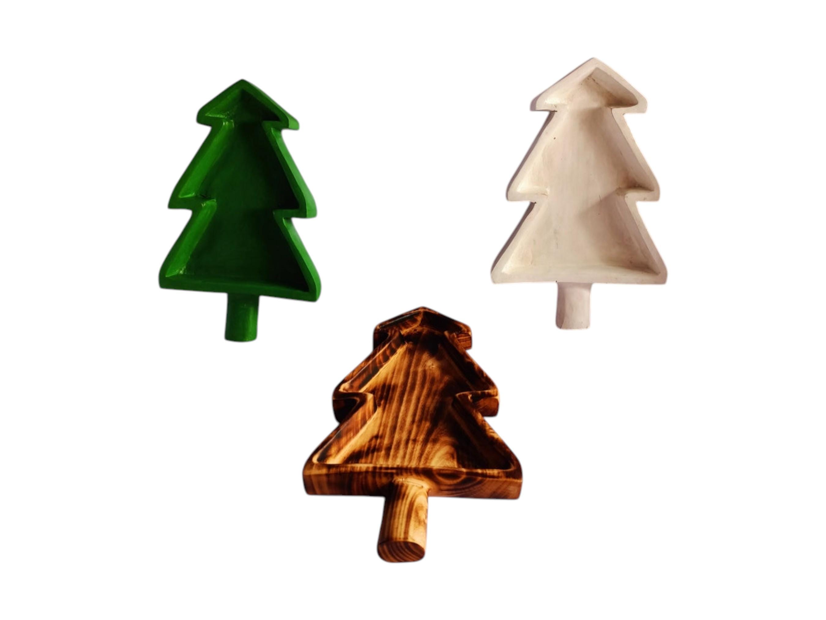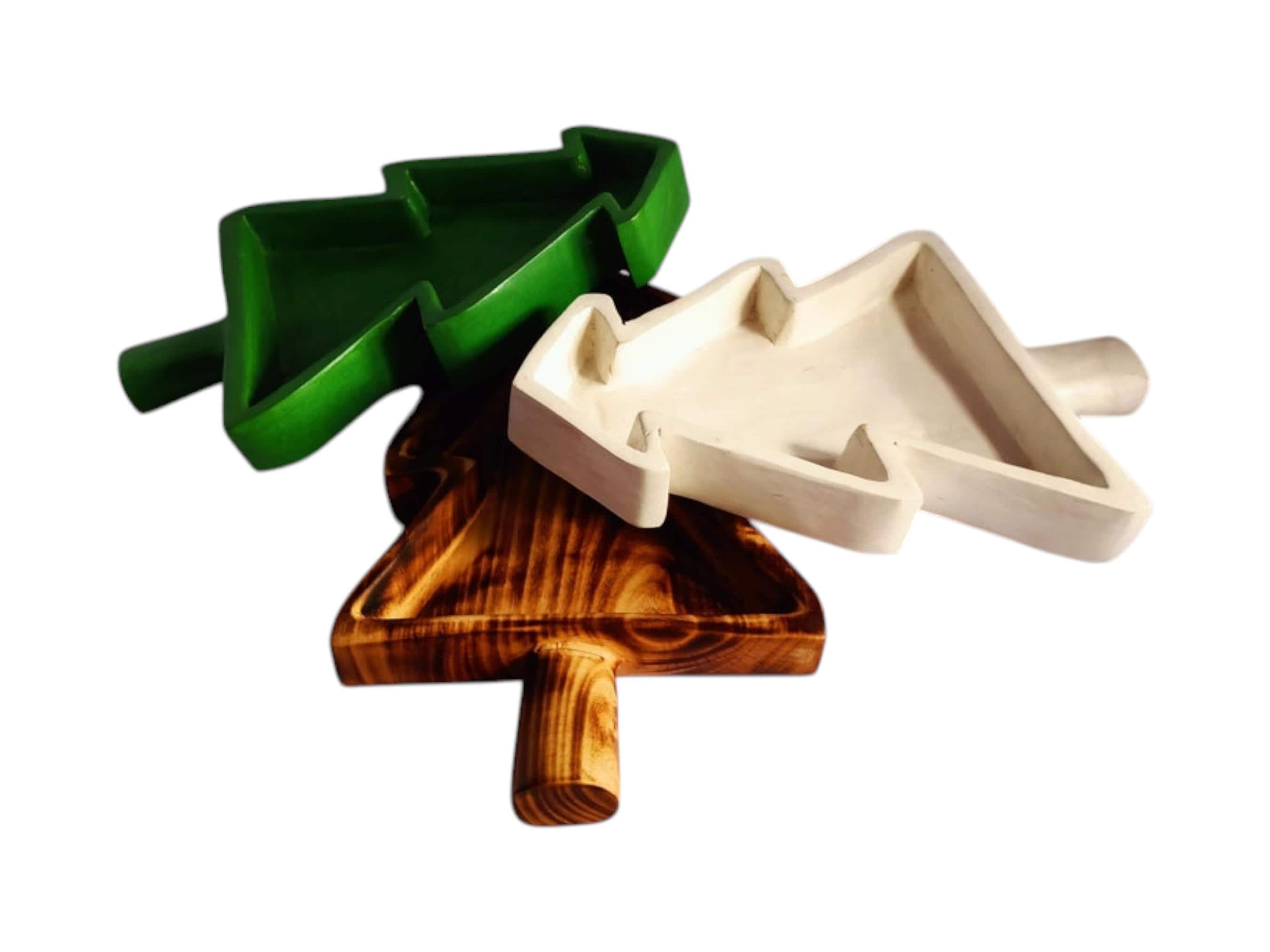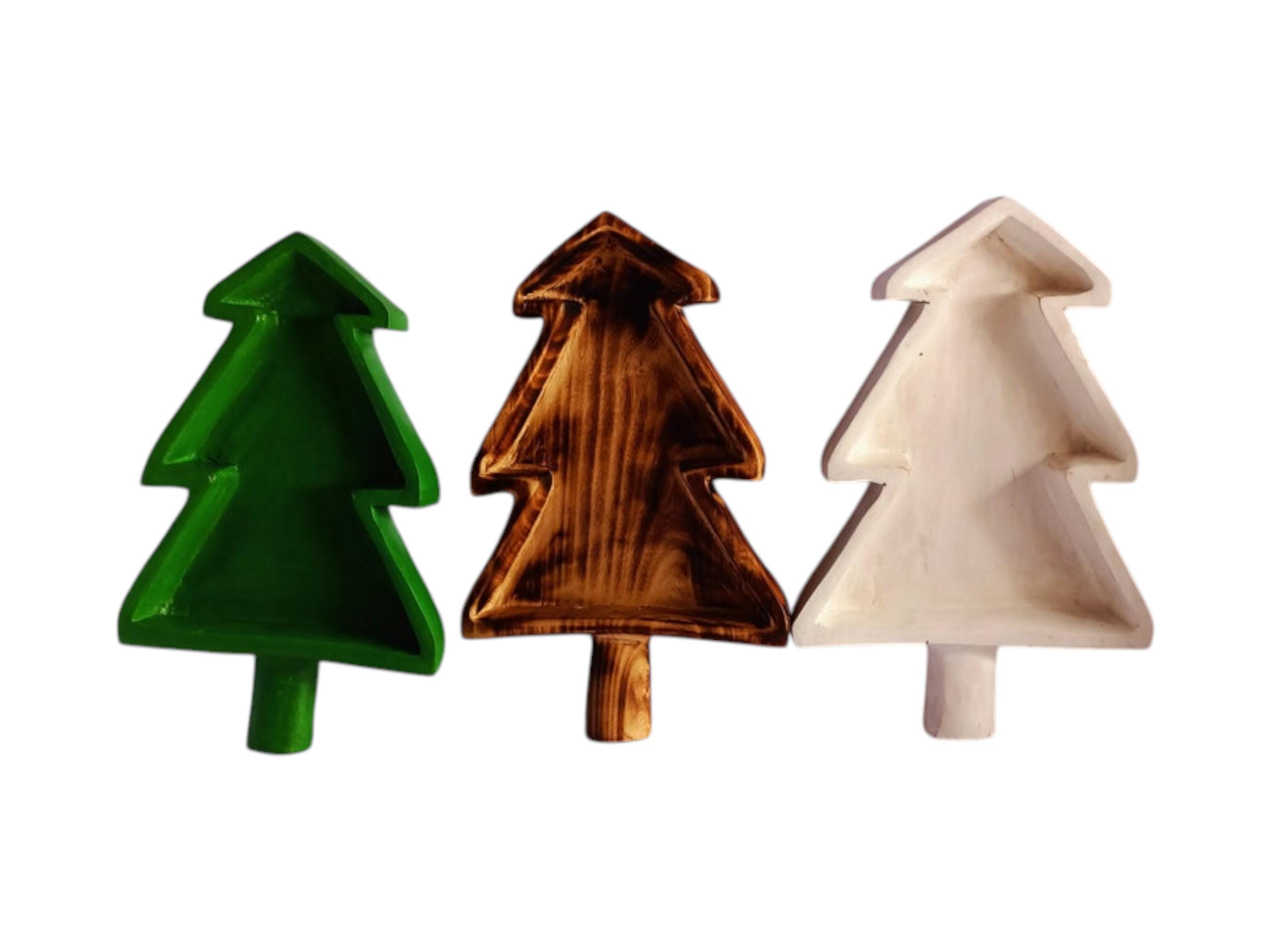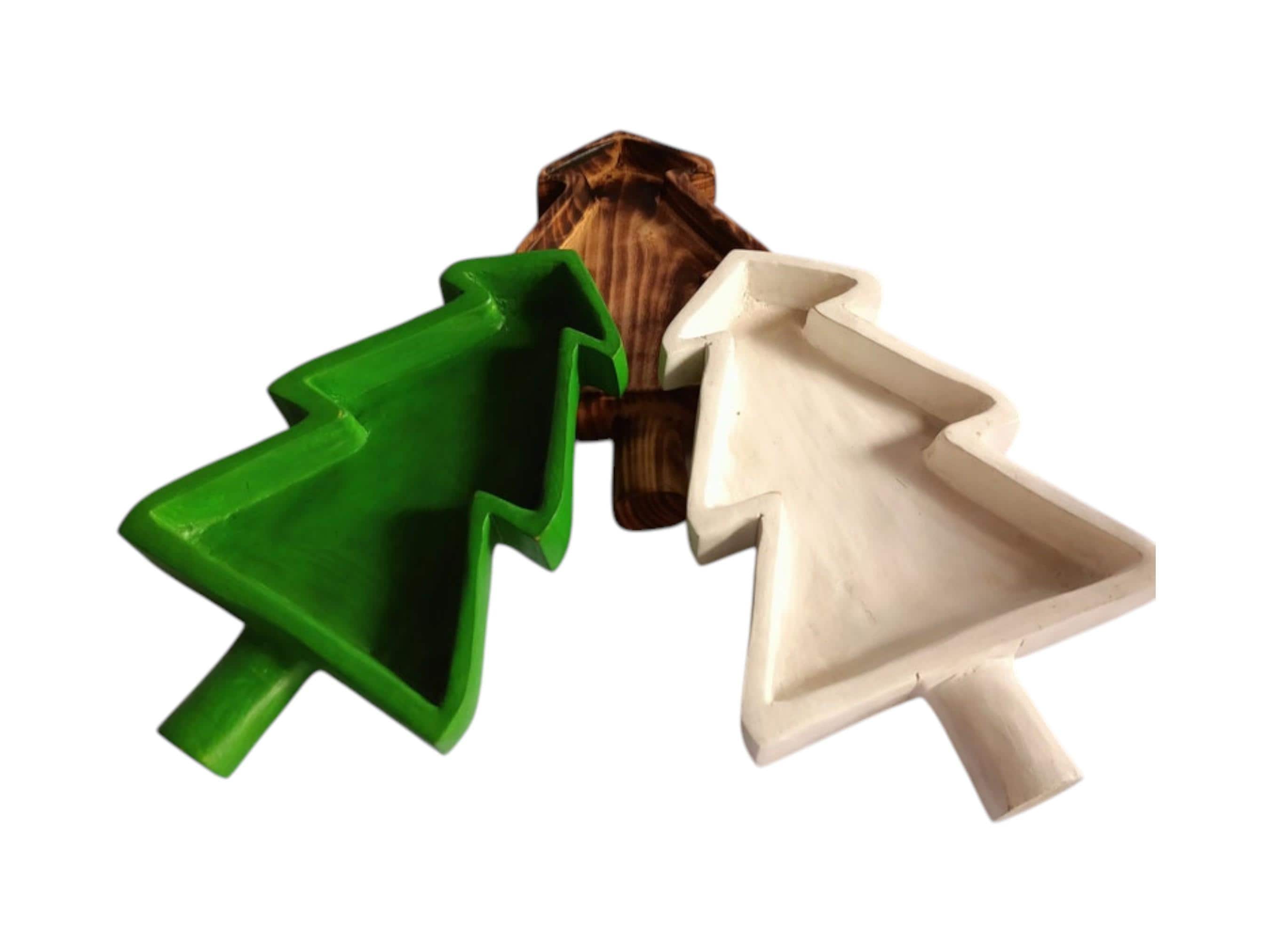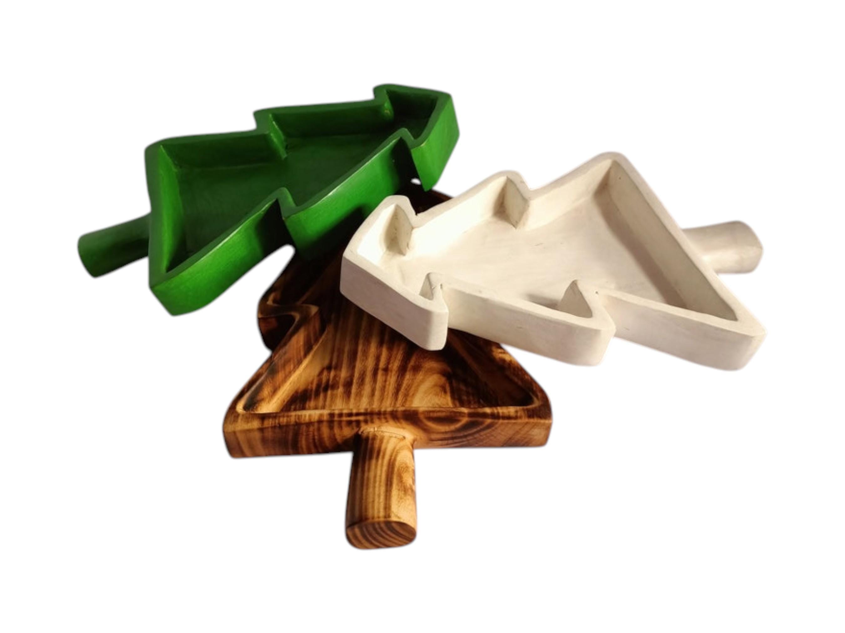 This delightful set of 3 hand-carved wooden Christmas tree bowls is the perfect way to add rustic charm to your holiday celebrations. The set includes three distinct finishes: a bold Christmas green paint, a warm natural wood stain, and a festive winter white or cream color. Each bowl is meticulously shaped from solid hardwood, featuring the iconic Christmas tree silhouette with a small trunk base. They are perfectly sized for use as decorative accents on a mantel, tiered tray, or coffee table during the holiday season. The deep cavities make them ideal vessels for DIY candle making, creating unique farmhouse-style Christmas candles. Alternatively, use them for serving small holiday candies, nuts, or snacks for a charming seasonal presentation. Searching for a truly unique host or Christmas gift? This trio of wooden tree bowls is a versatile and beautiful present for a decorator or candle maker. This unique handcrafted set is ready to display and instantly brings a cohesive, rustic, and festive look to your home.