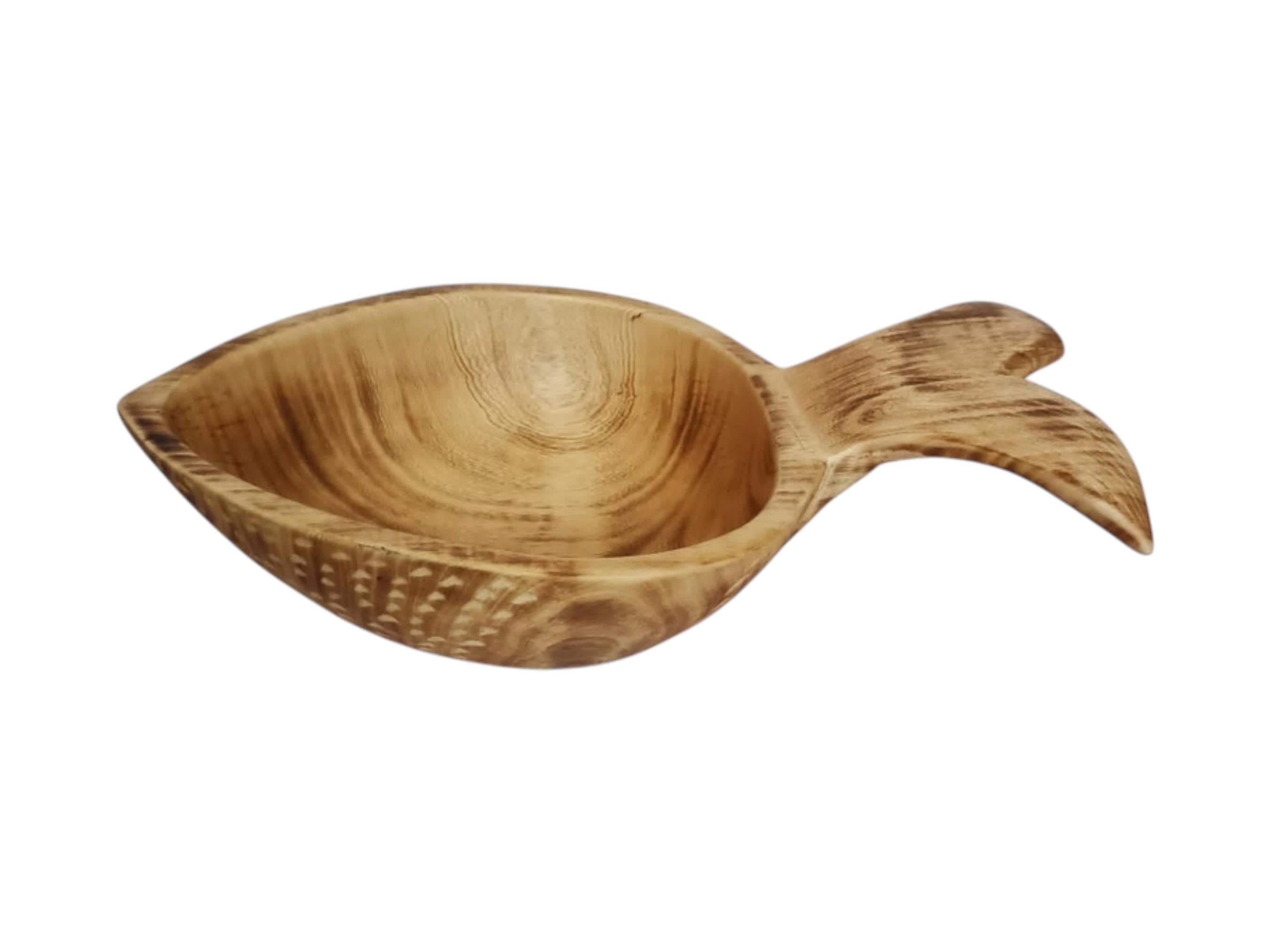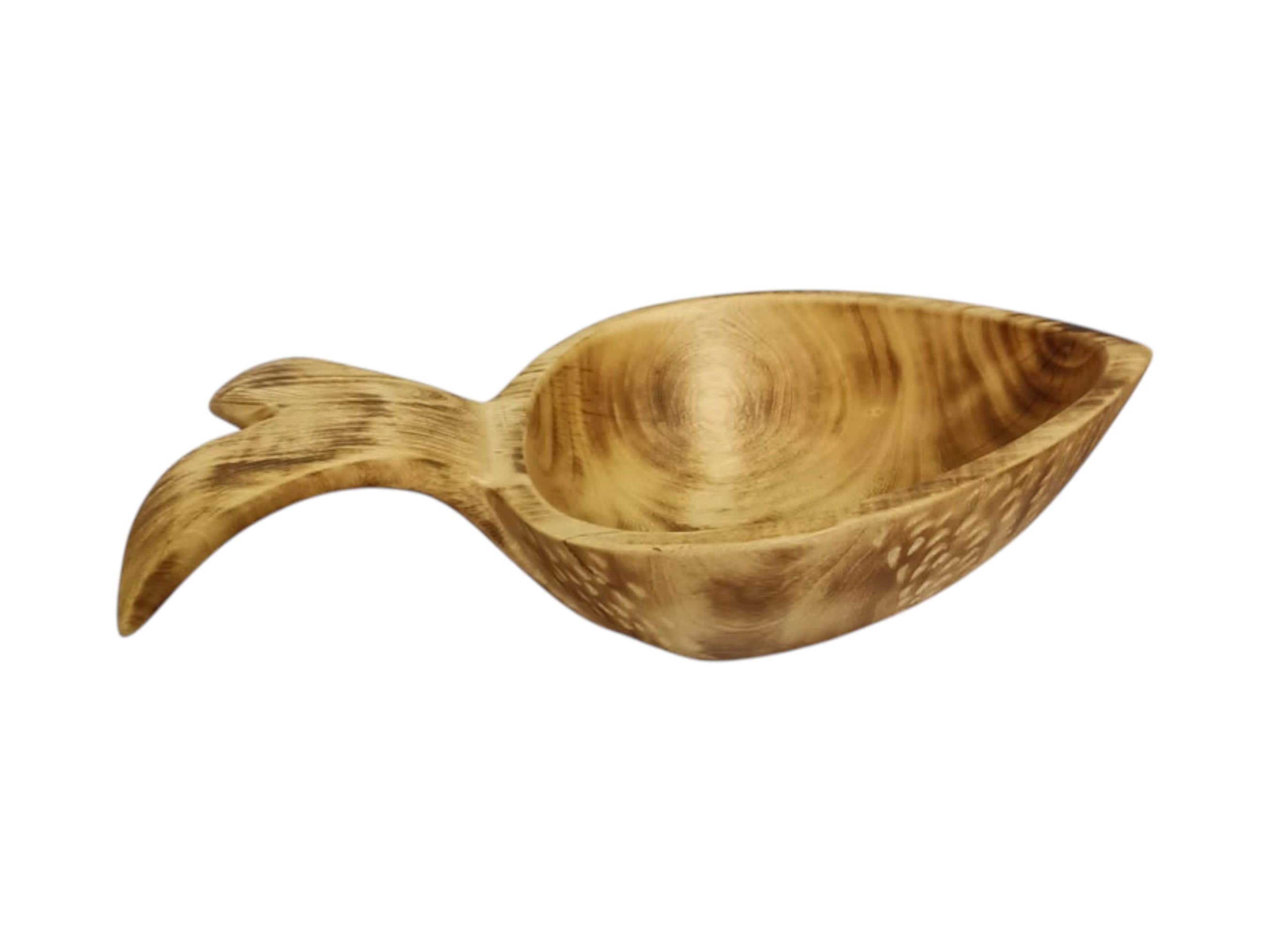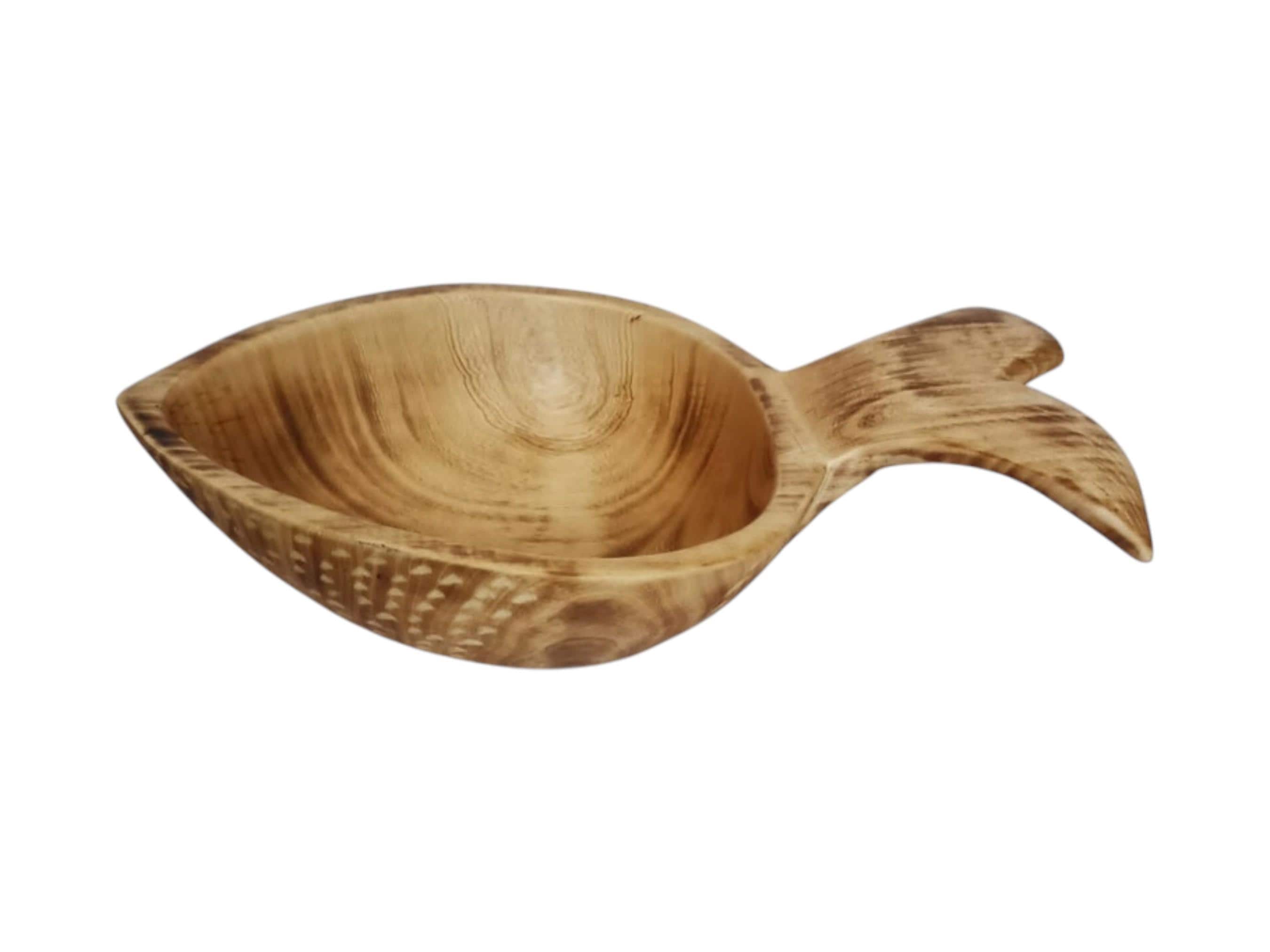 This delightful hand-carved wooden bowl is shaped like a whimsical, stylized fish, making it a unique and charming addition to any home. The bowl is meticulously sculpted from a single piece of hardwood, featuring a beautifully natural grain and a smooth, rustic finish. Its functional tail-shaped handle makes it easy to hold and serve, adding to its handcrafted charm. This unique dish is perfectly sized for serving individual portions of nuts, candy, sauces, or small appetizers for a nautical-themed gathering. Its distinctive shape makes it an excellent decorative accent for coastal, lake house, or rustic kitchen decor when not in use. As a quality piece of functional folk art, it’s a wonderful conversation starter on a dining table or kitchen island. Searching for a truly unique host or housewarming gift? This fish-shaped wood bowl is a creative and thoughtful choice. This beautiful piece of wooden servingware is ready to use and instantly brings an organic, playful feel to your space.