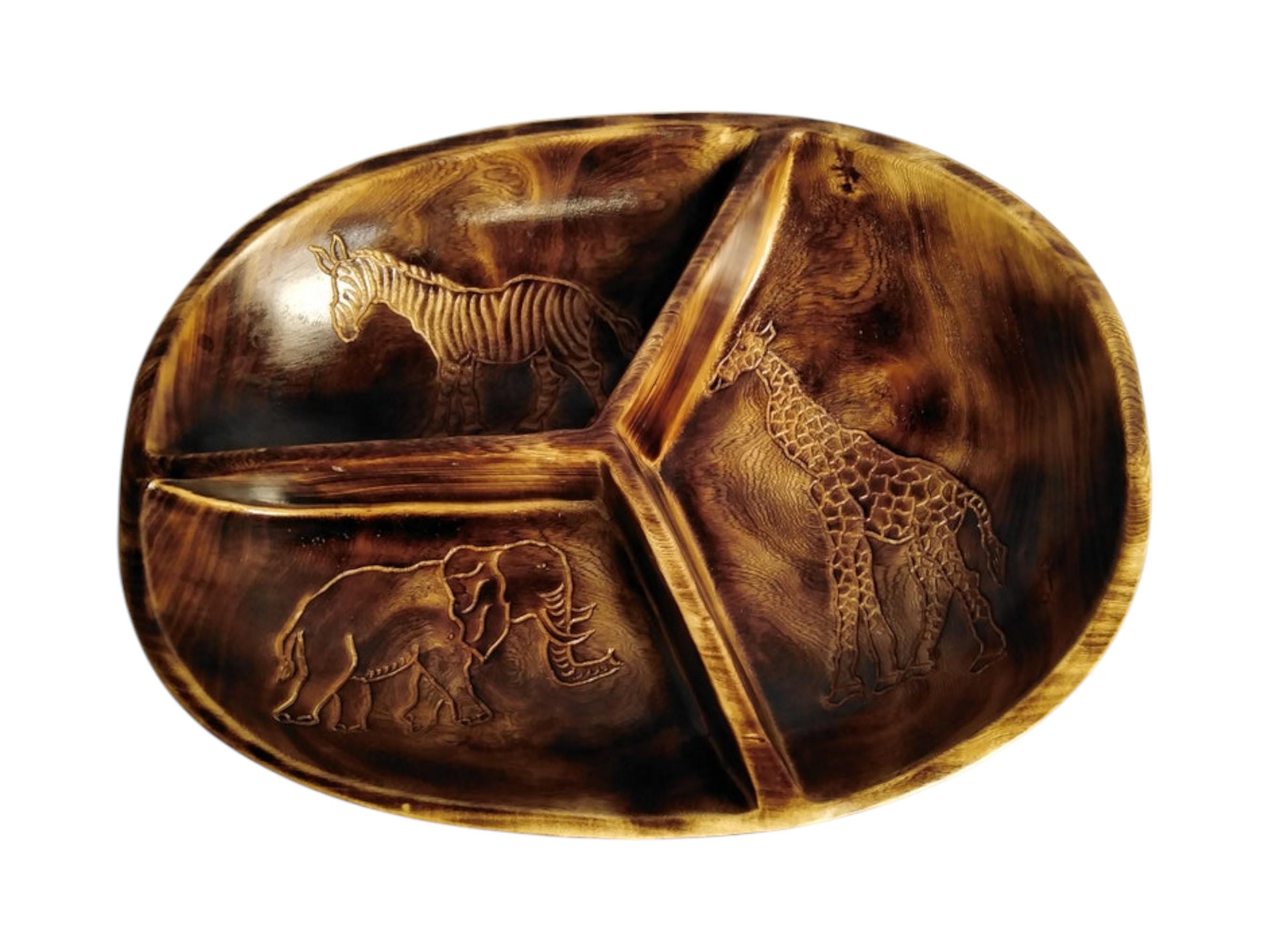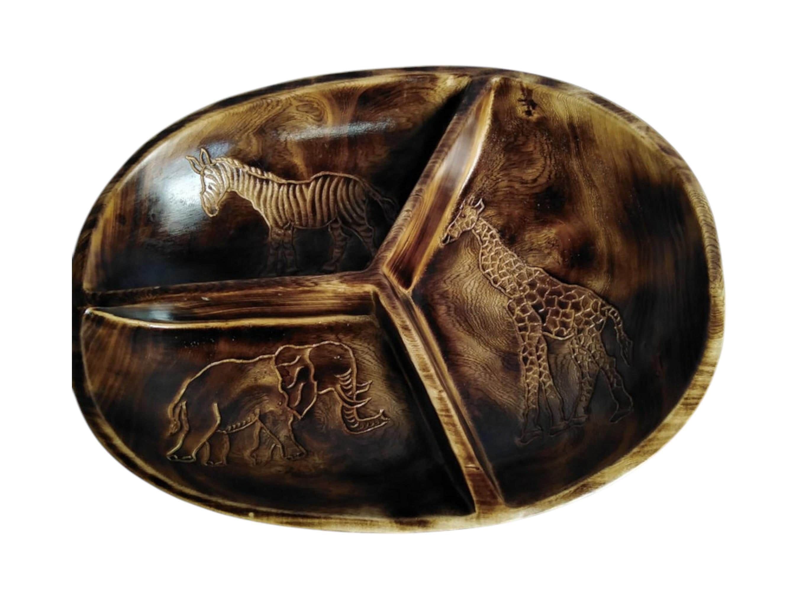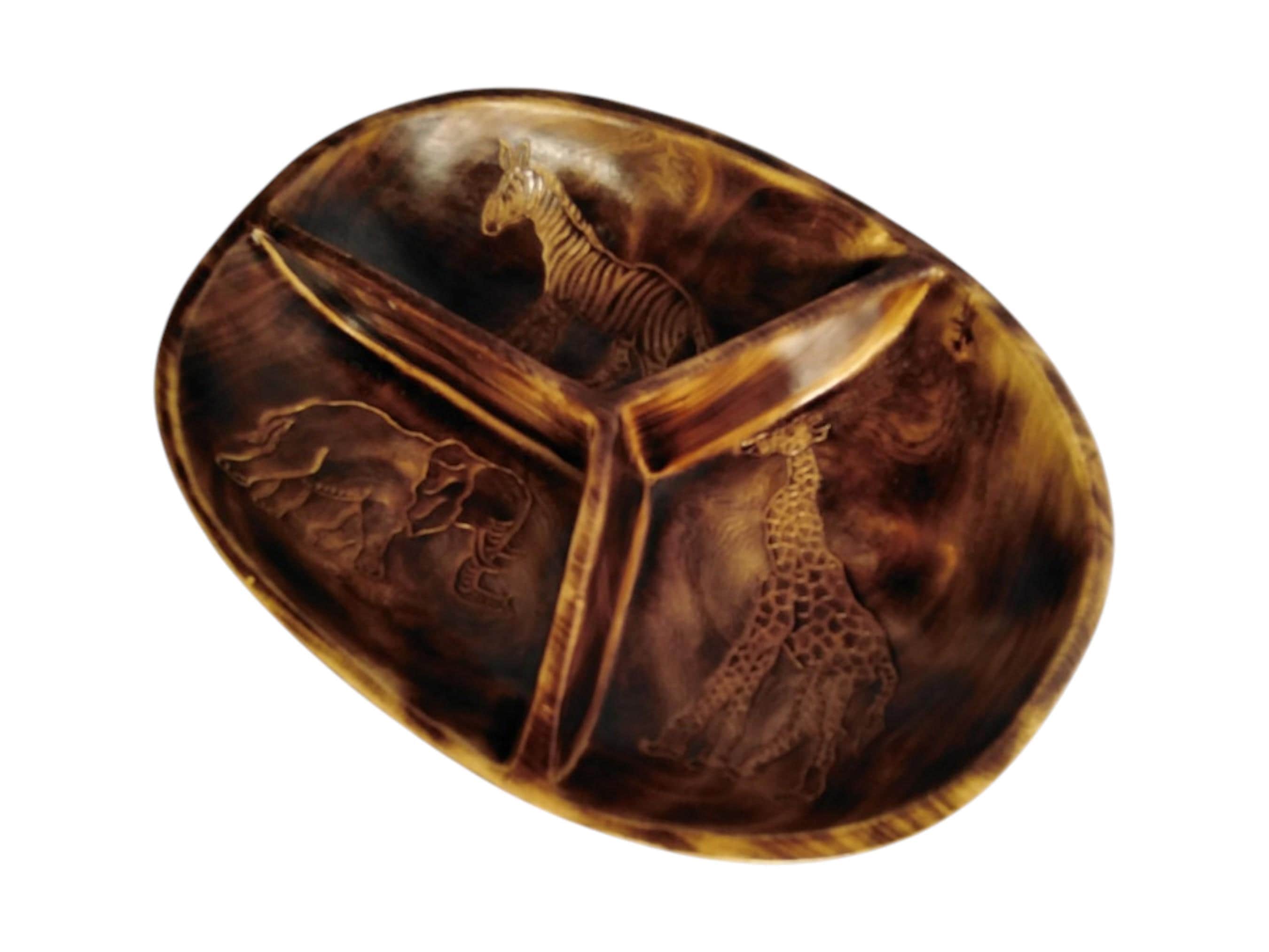 This impressive hand-carved wooden serving bowl is a remarkable piece of functional African-themed art, perfect for entertaining. The large, round bowl is expertly divided into three separate compartments by deep internal dividers. Each of the three sections features a beautifully engraved safari animal—an elephant, a giraffe, and a zebra—adding incredible detail and character. The rich, dark wood grain and the glossy finish enhance the engraved wildlife figures, making them stand out beautifully. This sectional design is ideal for serving a variety of appetizers, dips, snacks, or candies without any mixing. It serves as a stunning centerpiece on a dining table or buffet, adding an ethnic or bohemian touch to your decor. Searching for a truly distinctive housewarming or host gift? This safari sectional bowl is a thoughtful and memorable choice for any wildlife enthusiast. This unique handcrafted serving piece is ready to use and instantly brings the spirit of the African plains into your home.