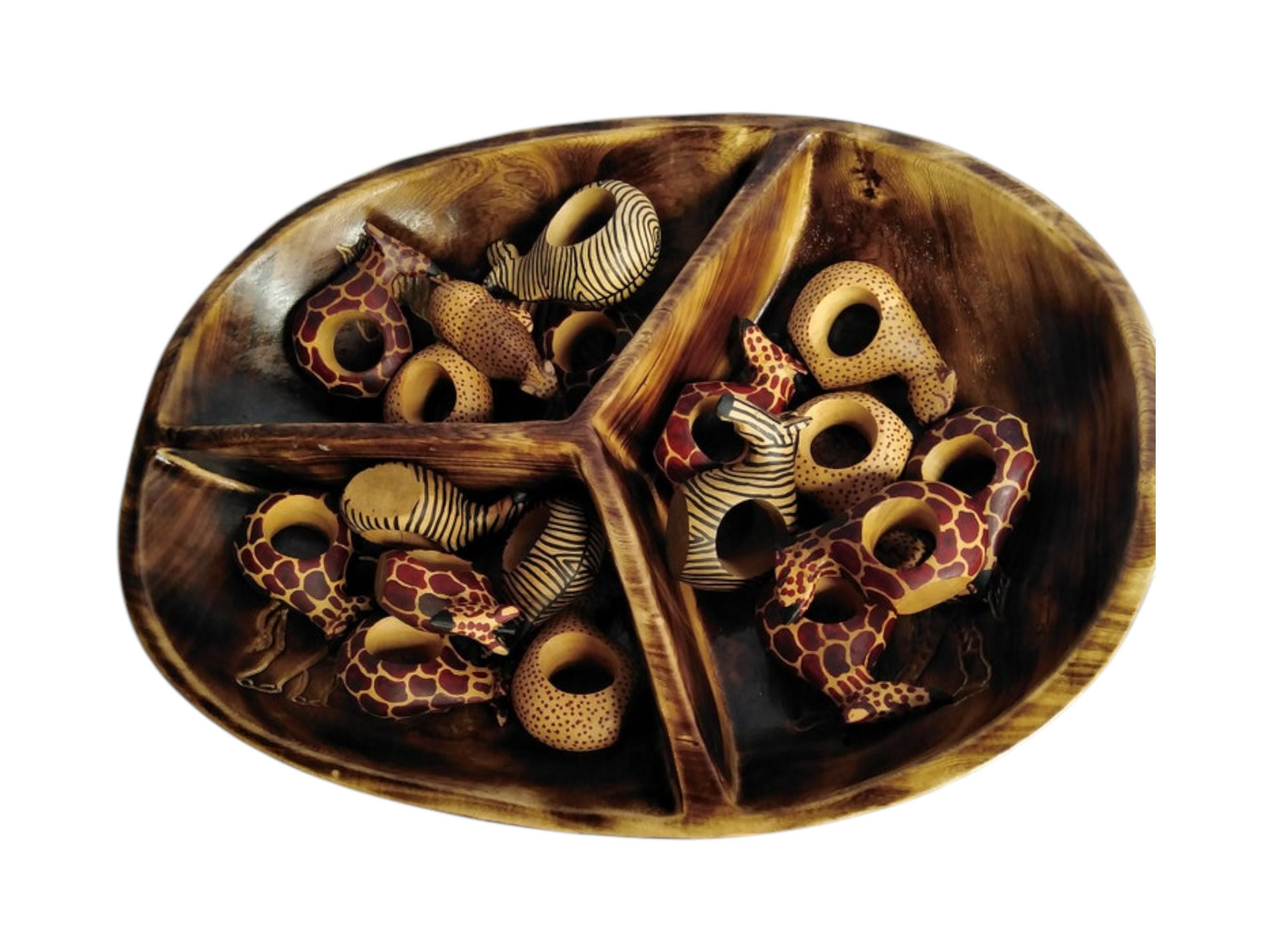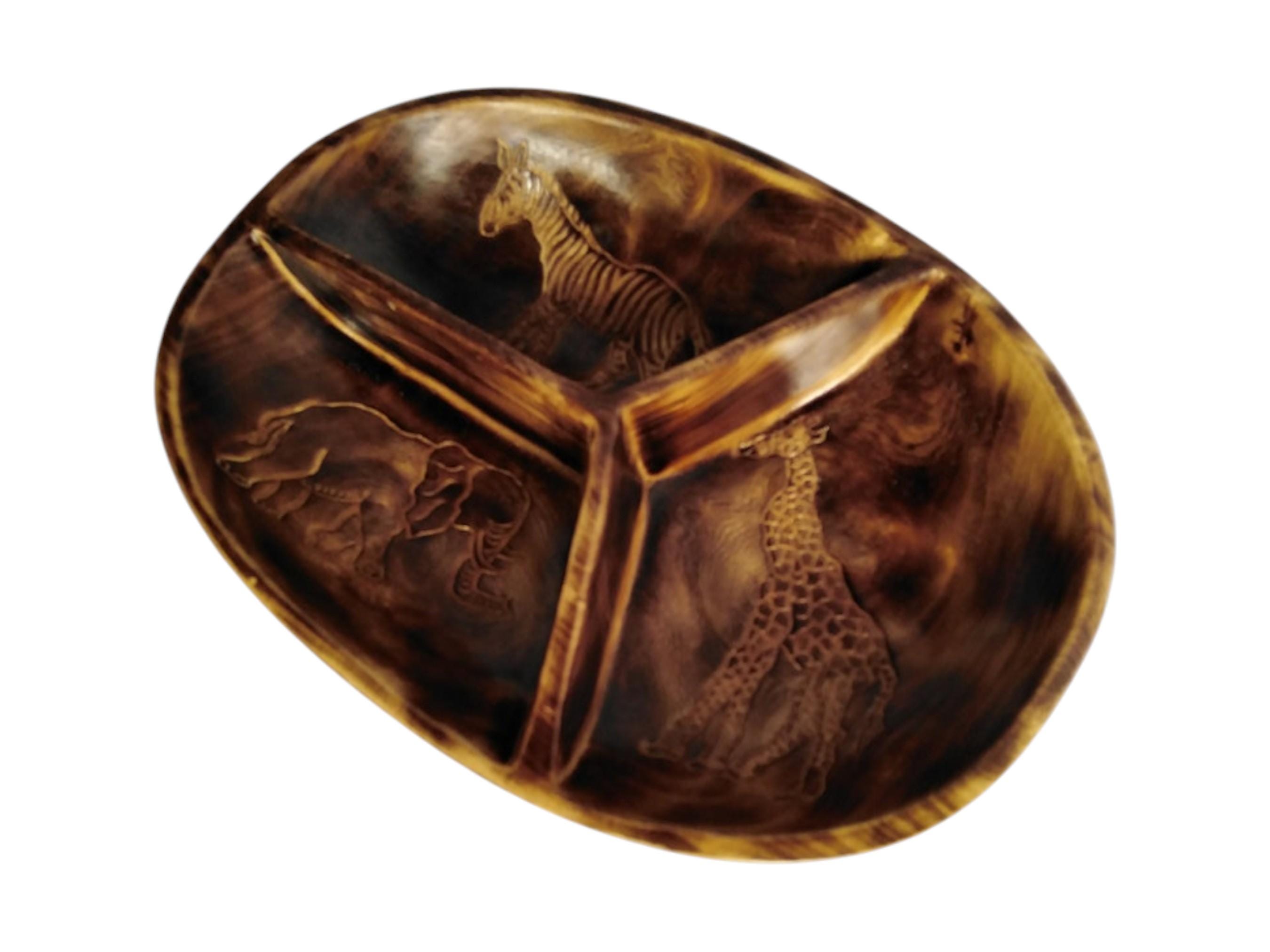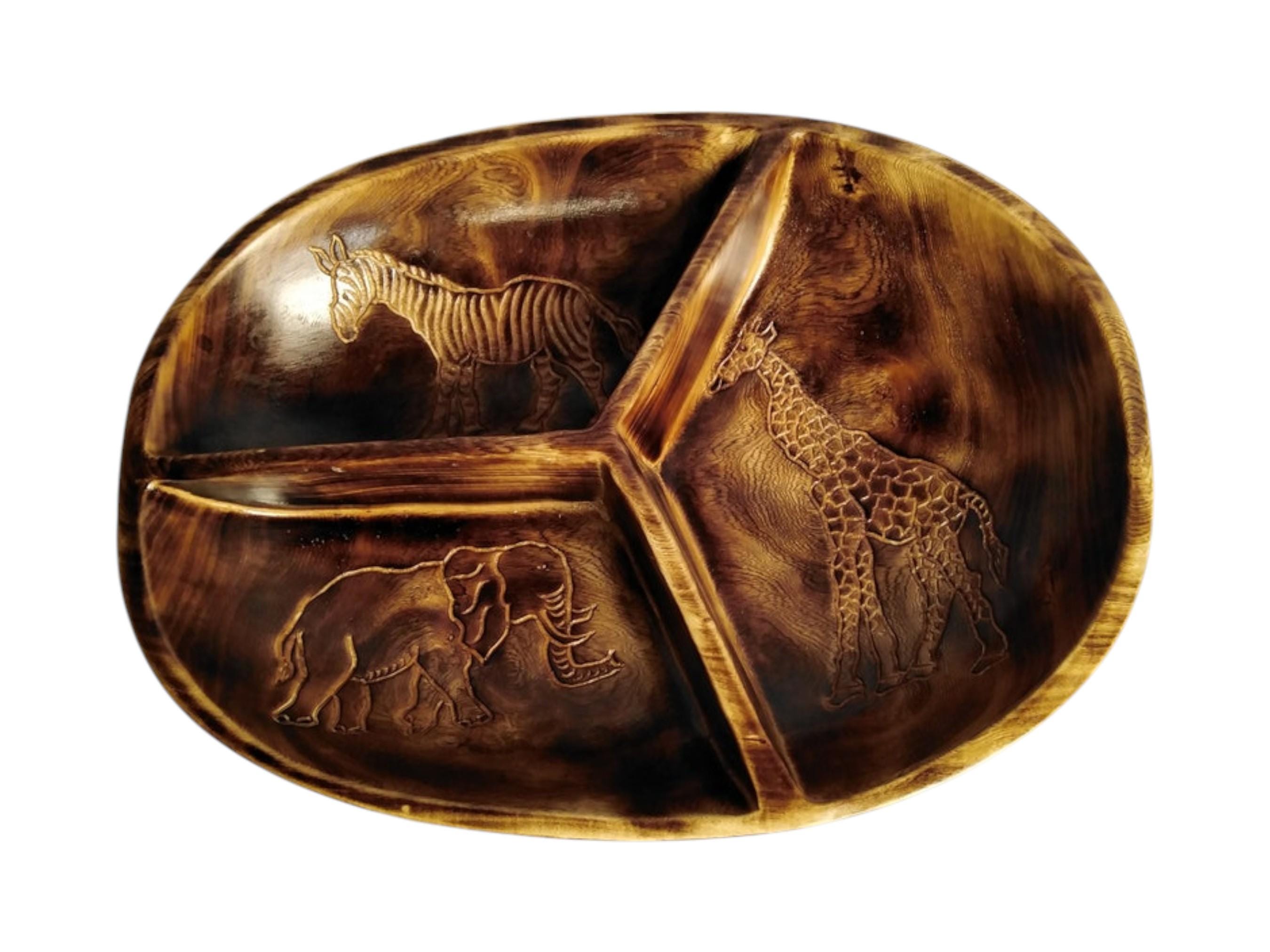 This impressive hand-carved wooden serving bowl is a remarkable piece of functional African-themed art, perfect for entertaining. The large, round bowl is expertly divided into three separate compartments by deep internal dividers. Each of the three sections features a beautifully engraved safari animal—an elephant, a giraffe, and a zebra—adding incredible detail and character. The rich, dark wood grain and the glossy finish enhance the engraved wildlife figures, making them stand out beautifully. This sectional design is ideal for serving a variety of appetizers, dips, snacks, or candies without any mixing. It serves as a stunning centerpiece on a dining table or buffet, adding an ethnic or bohemian touch to your decor. Searching for a truly distinctive housewarming or host gift? This safari sectional bowl is a thoughtful and memorable choice for any wildlife enthusiast. This unique handcrafted serving piece is ready to use and instantly brings the spirit of the African plains into your home.