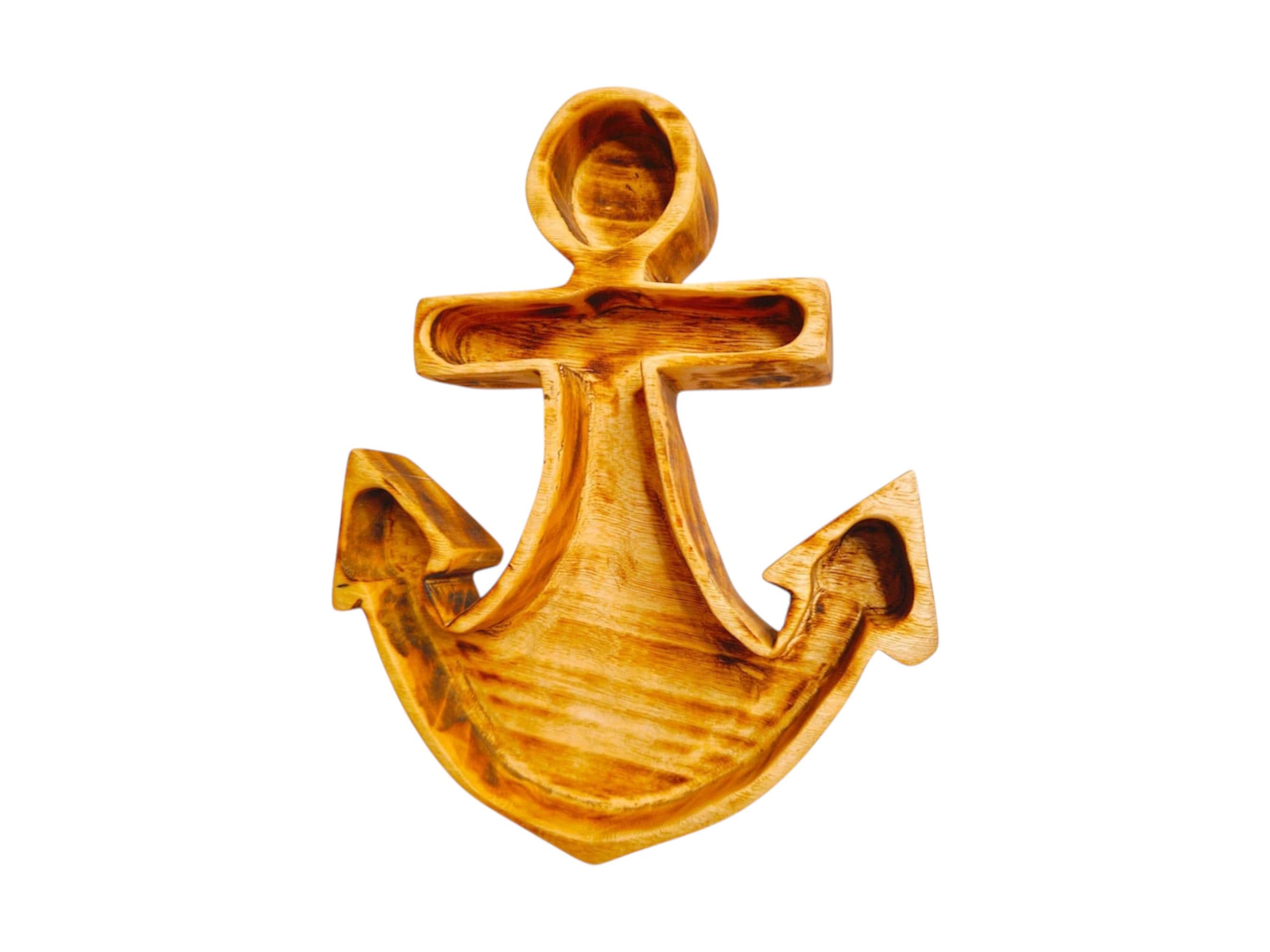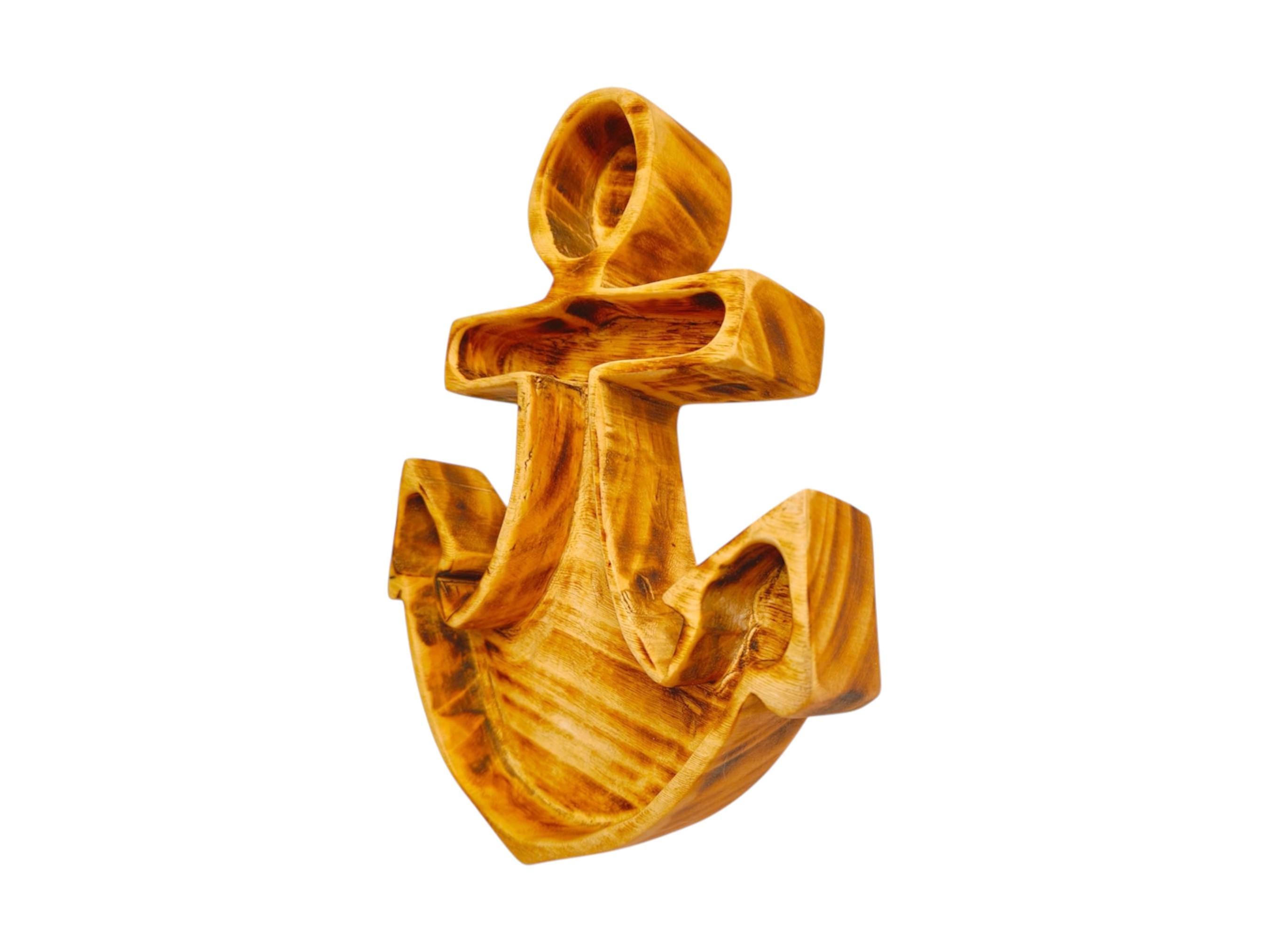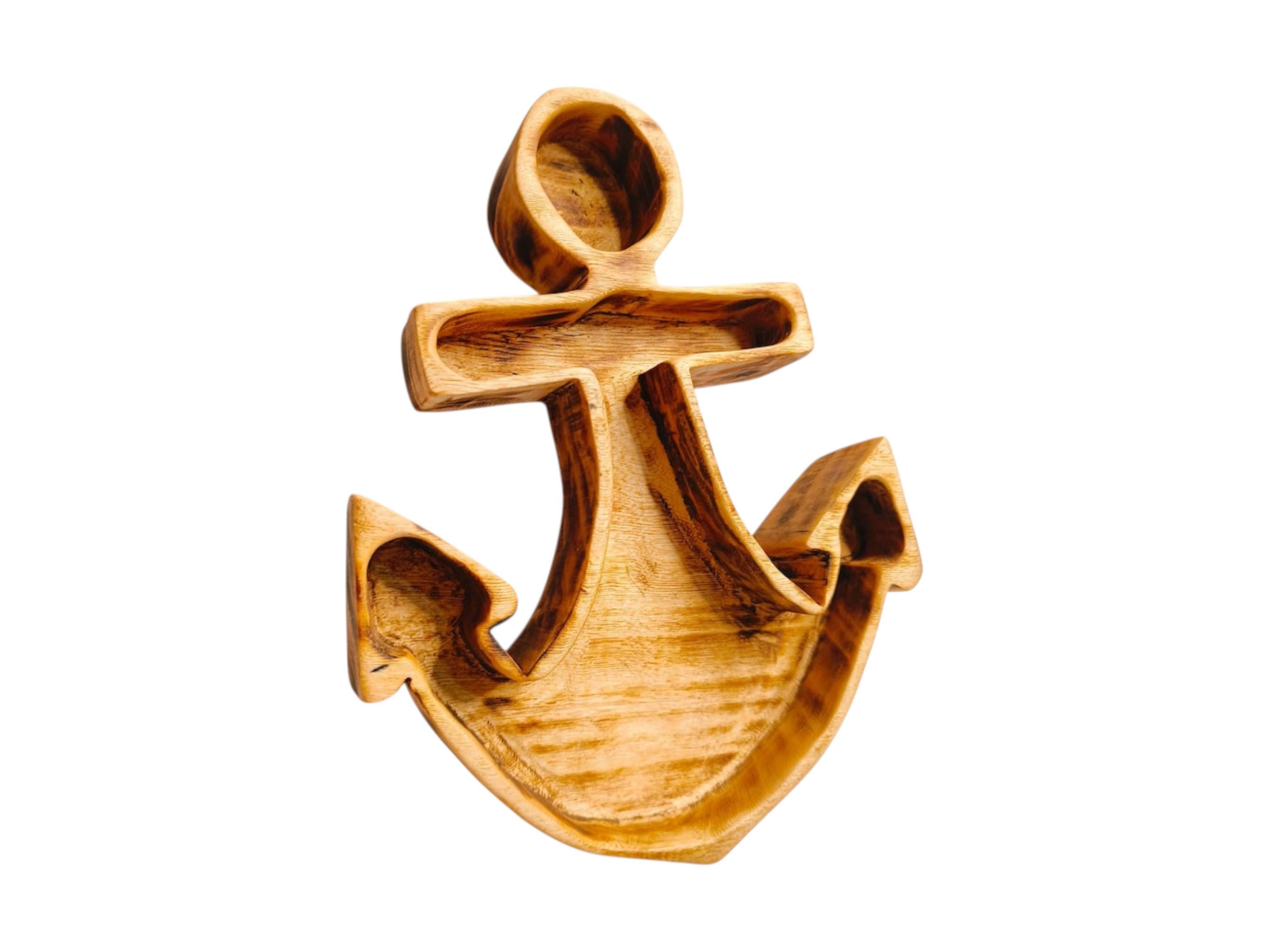 This charming hand-carved wooden anchor bowl is a perfect accent piece for any coastal, nautical, or rustic-themed home. The bowl is meticulously sculpted from a single piece of hardwood, featuring a beautifully natural wood grain and a warm, rustic finish. Its distinctive anchor shape includes multiple scooped cavities in the shank and flukes, allowing for diverse serving or organizing. This unique dish is ideally sized for use on a coffee table, entry console, or bar cart to hold keys, candies, or small treasures. It works beautifully as a decorative nautical centerpiece or can be used as a vessel for creating a custom beach-themed multi-wick candle. The durable construction and organic material make it a lasting and stylish addition to your beach house or lake cottage decor. Searching for a thoughtful, sea-inspired housewarming or captain's gift? This anchor bowl is a durable and unique present. This beautiful piece of coastal servingware is ready to use and instantly brings a sense of the sea into your space.