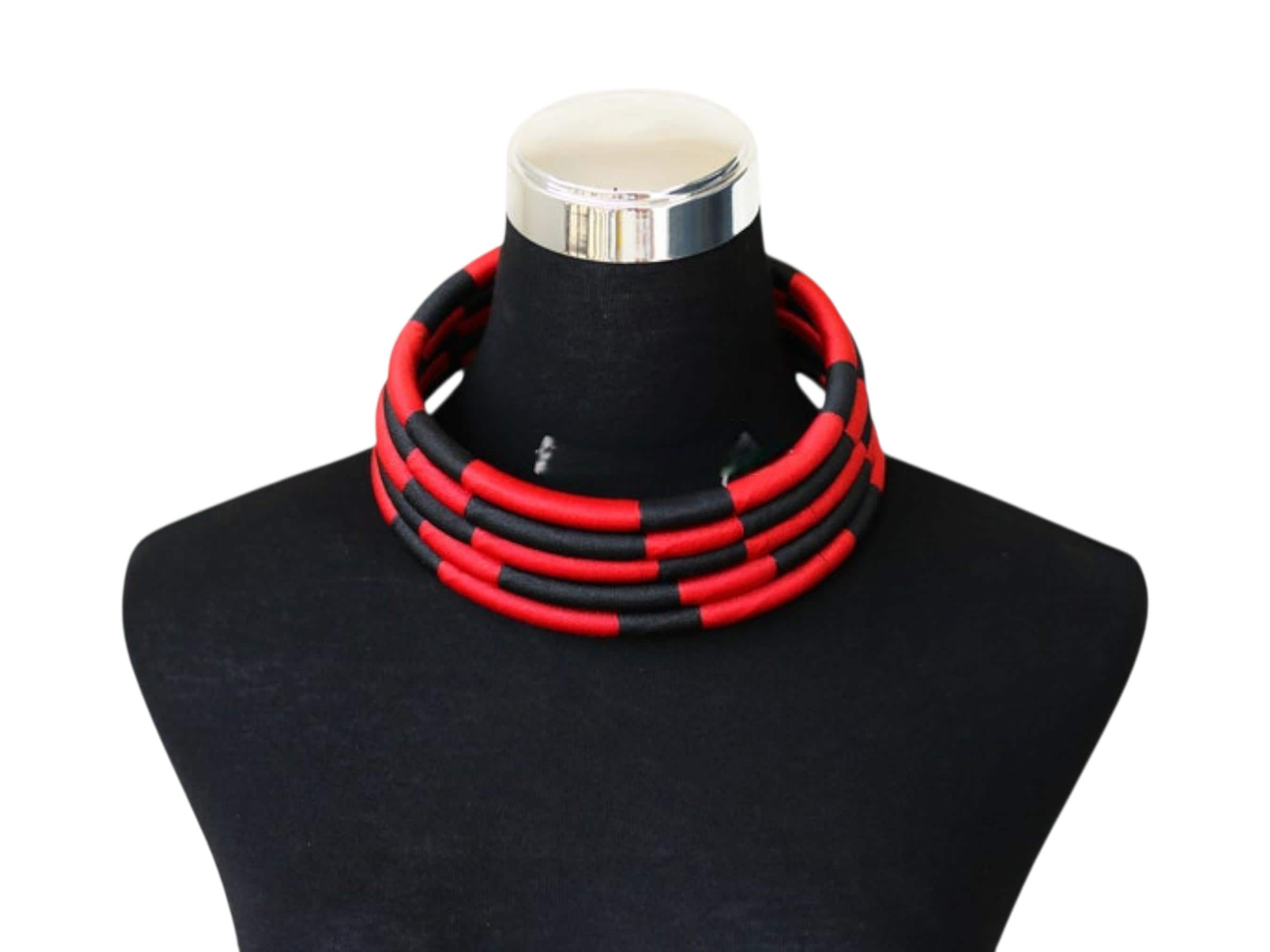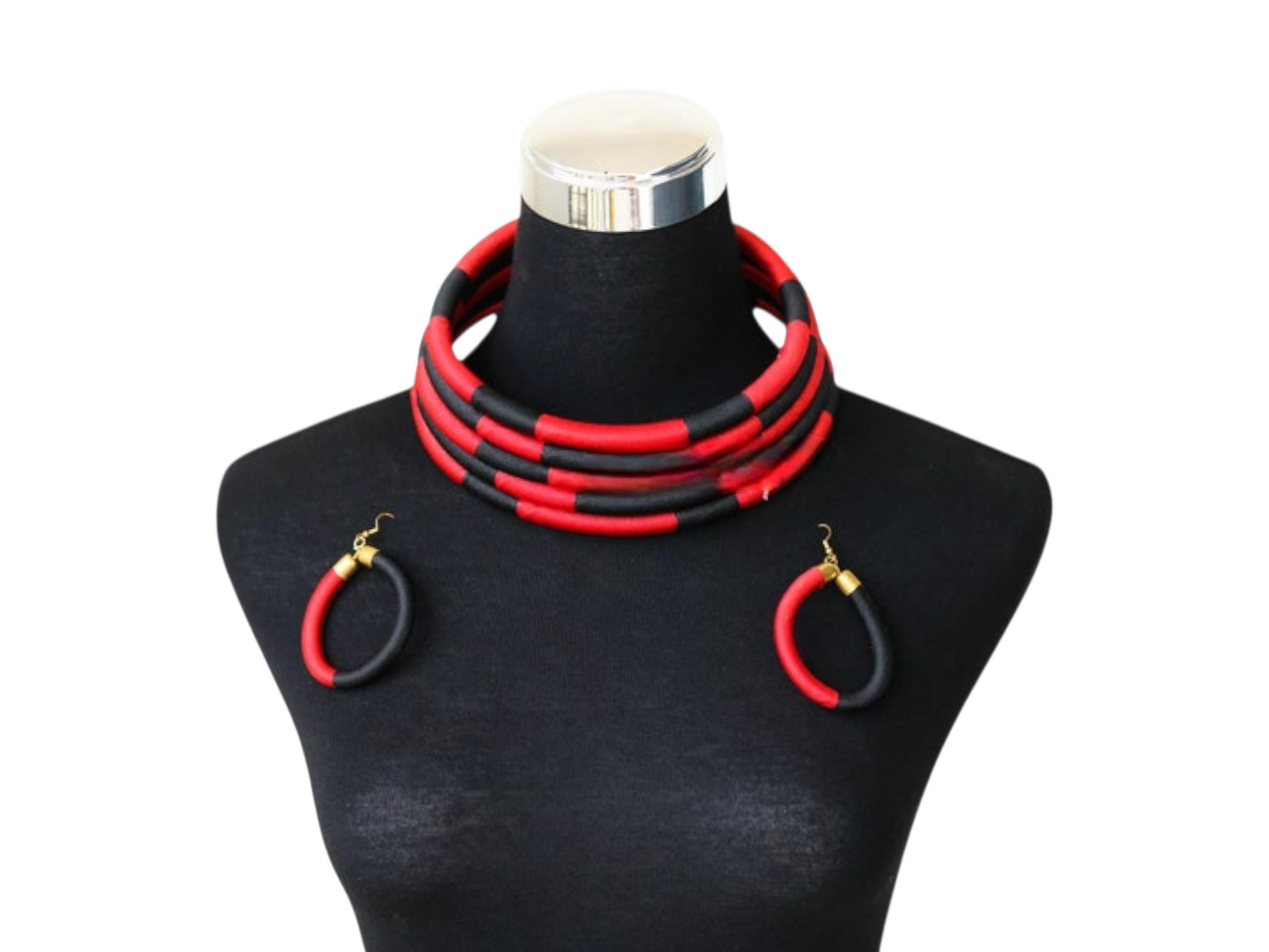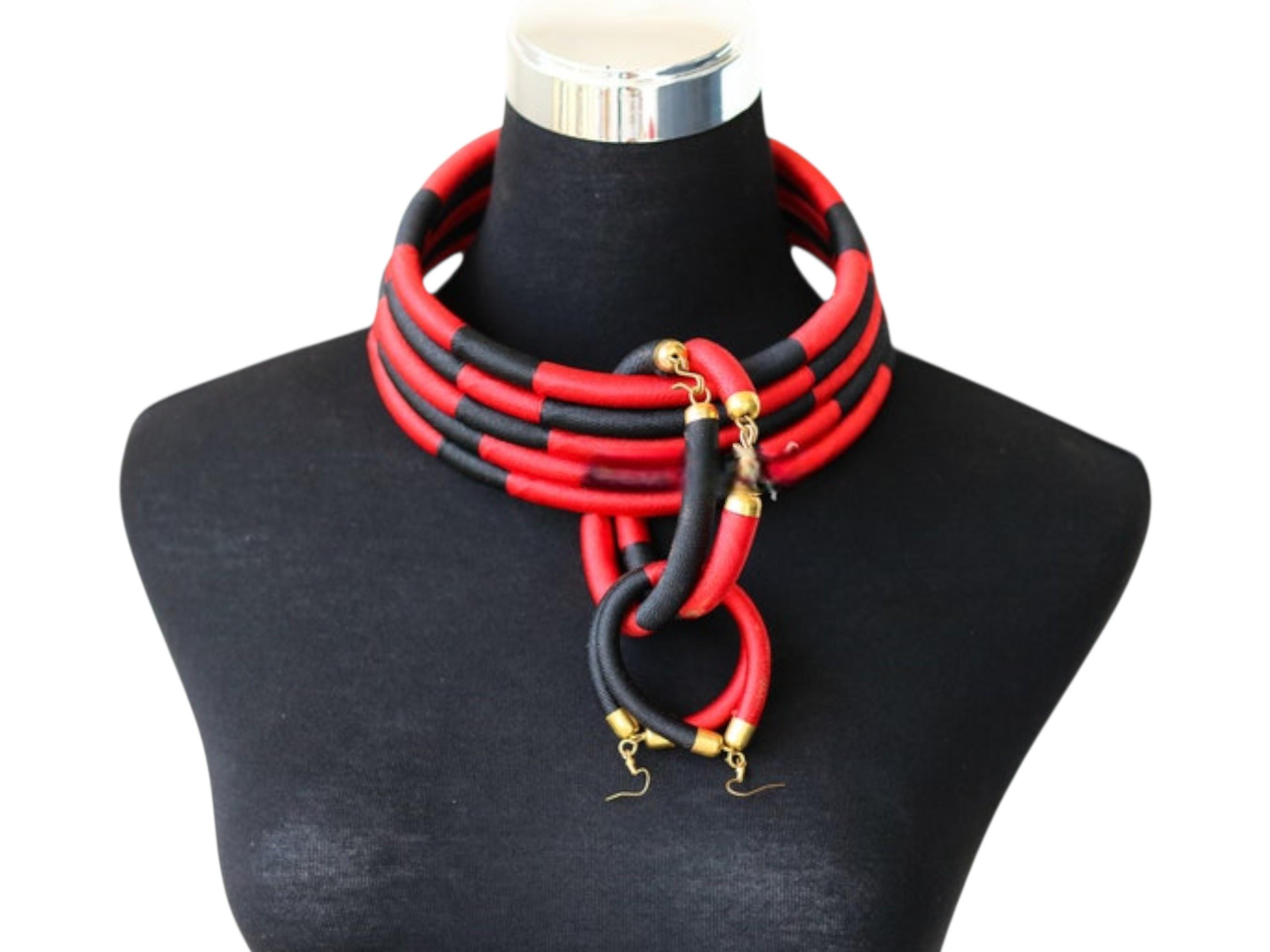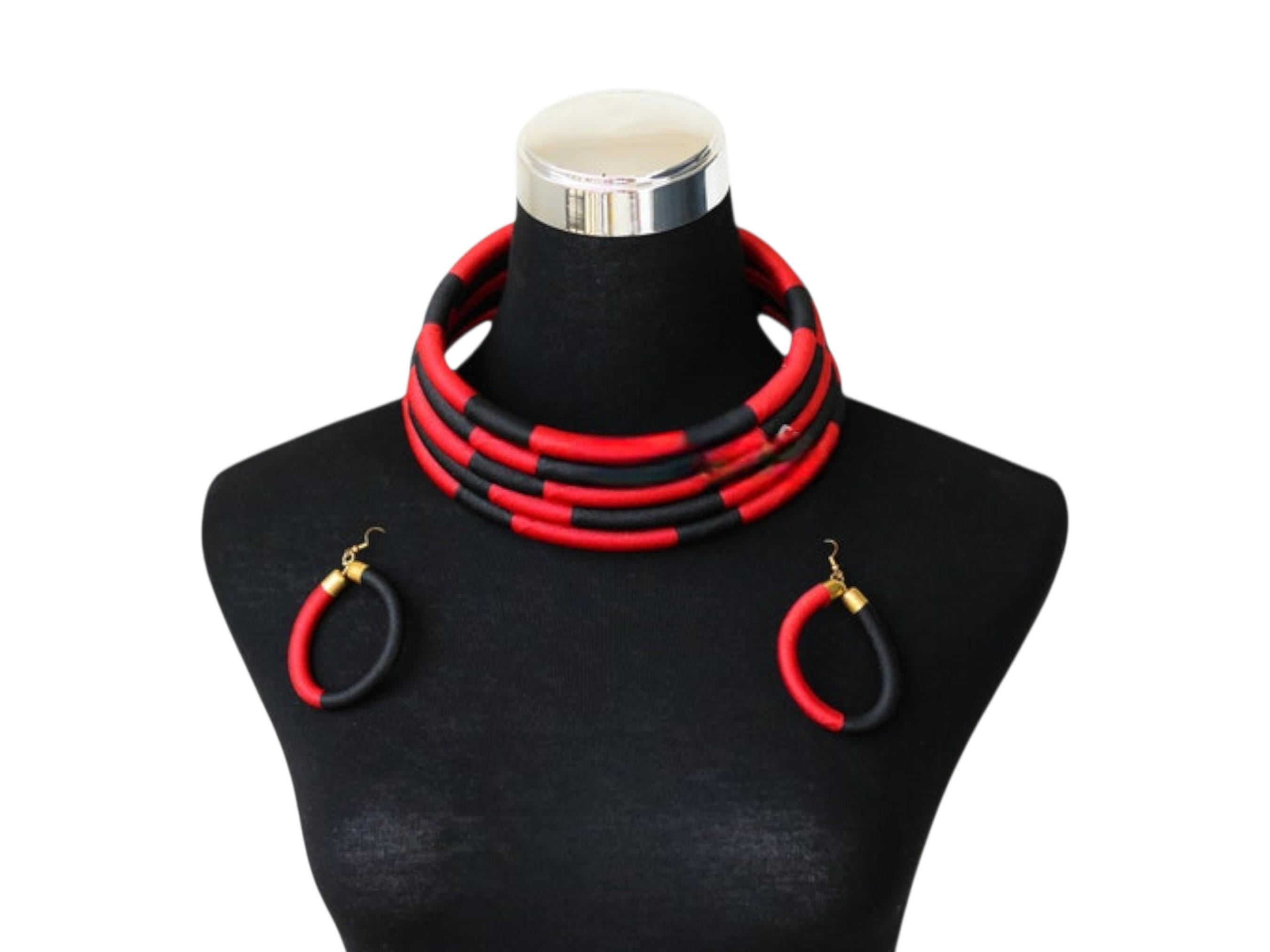 This spectacular African red and black choker set is a modern, structural pairing designed for a bold, graphic statement. The choker sits high on the neck, composed of multiple individual wire or rope bands. These bands are tightly wrapped in a material (likely fabric or thread) that alternates in eye-catching blocks of vibrant red and deep black. The stacked, segmented bands form a thick, solid collar, creating a powerful color-blocked effect that is reminiscent of traditional Maasai or Ndebele neck rings, but with a modern twist. The set includes matching circular hoop earrings crafted from the same red and black segments, completing the high-impact look. This accessory set is perfect for injecting drama and graphic elegance into monochrome or simple outfits. Searching for a truly unique, structural jewelry set or a signature accessory that provides bold contrast and modern tribal flair? This red & black segmented choker set is an unforgettable choice. This complete set is ready to wear and instantly brings powerful color, elegant structure, and contemporary African artistry to your ensemble.
