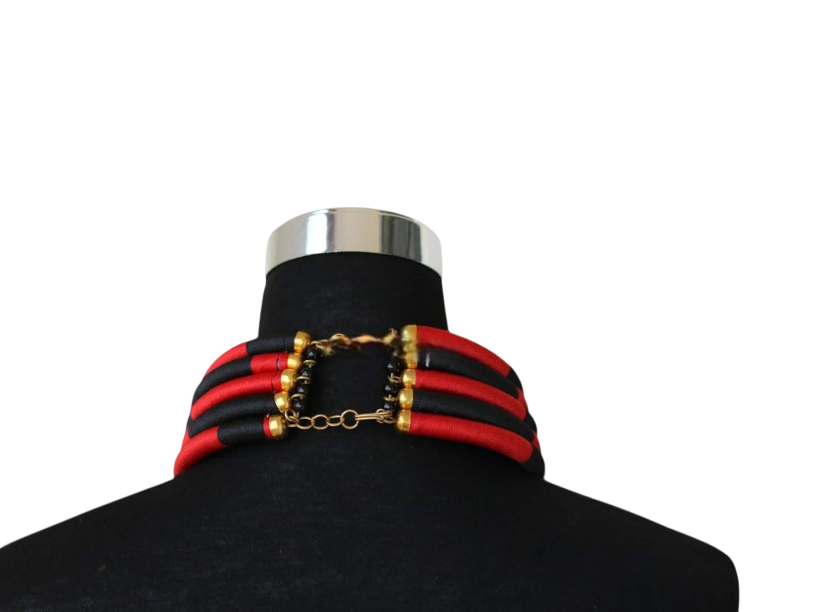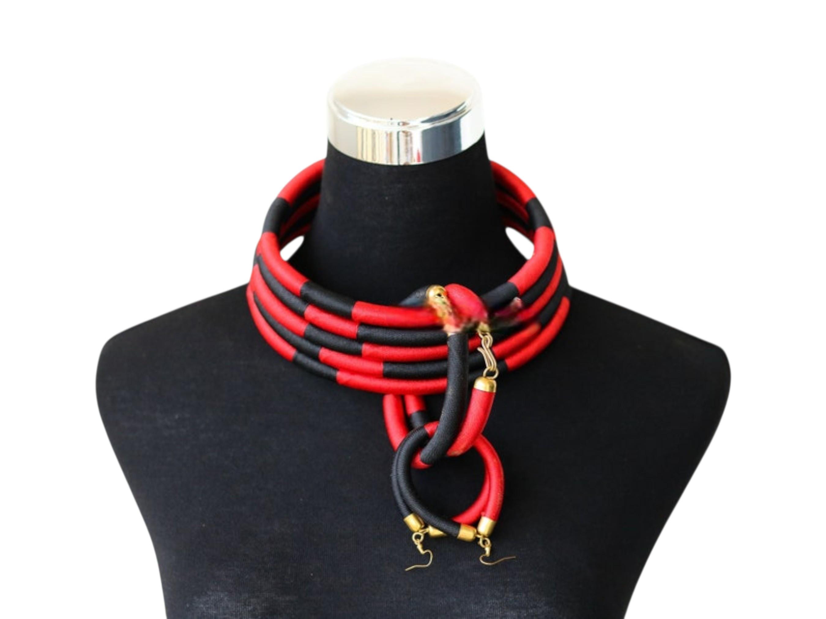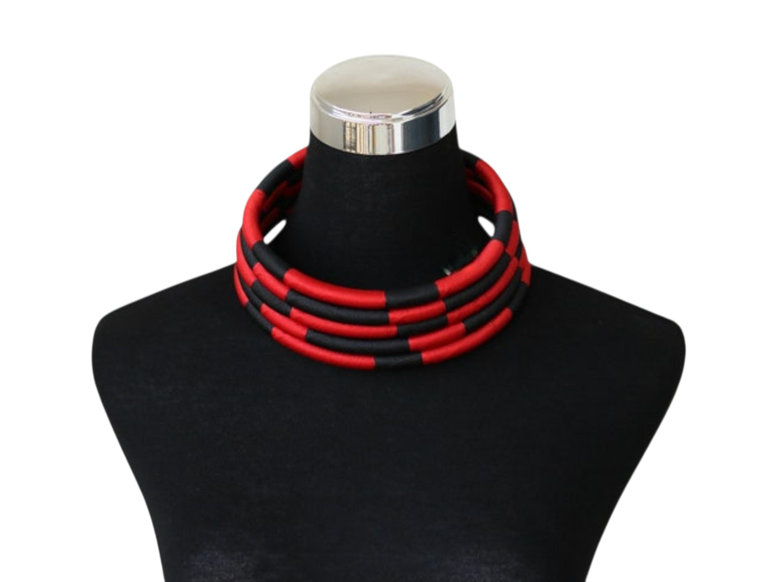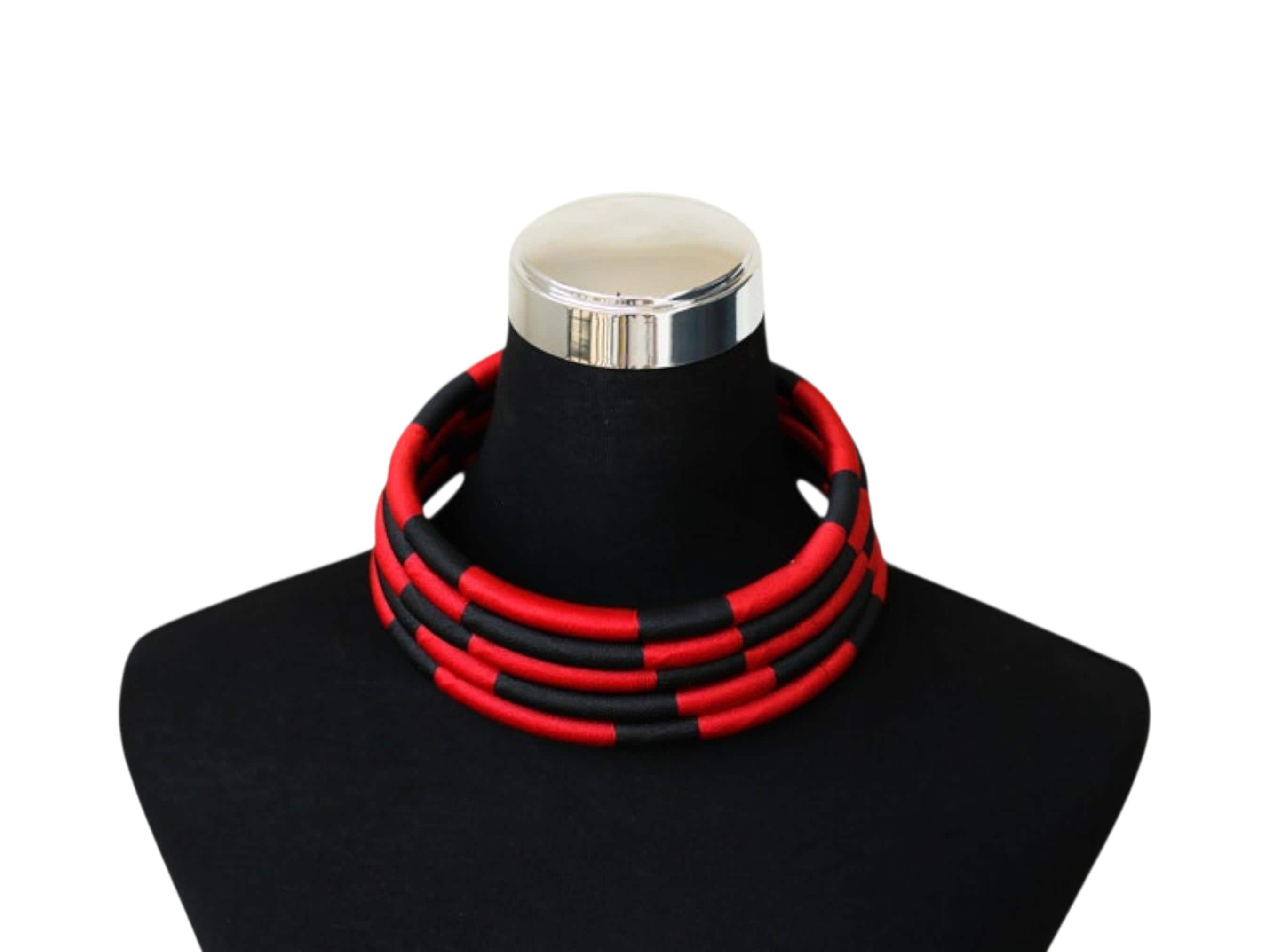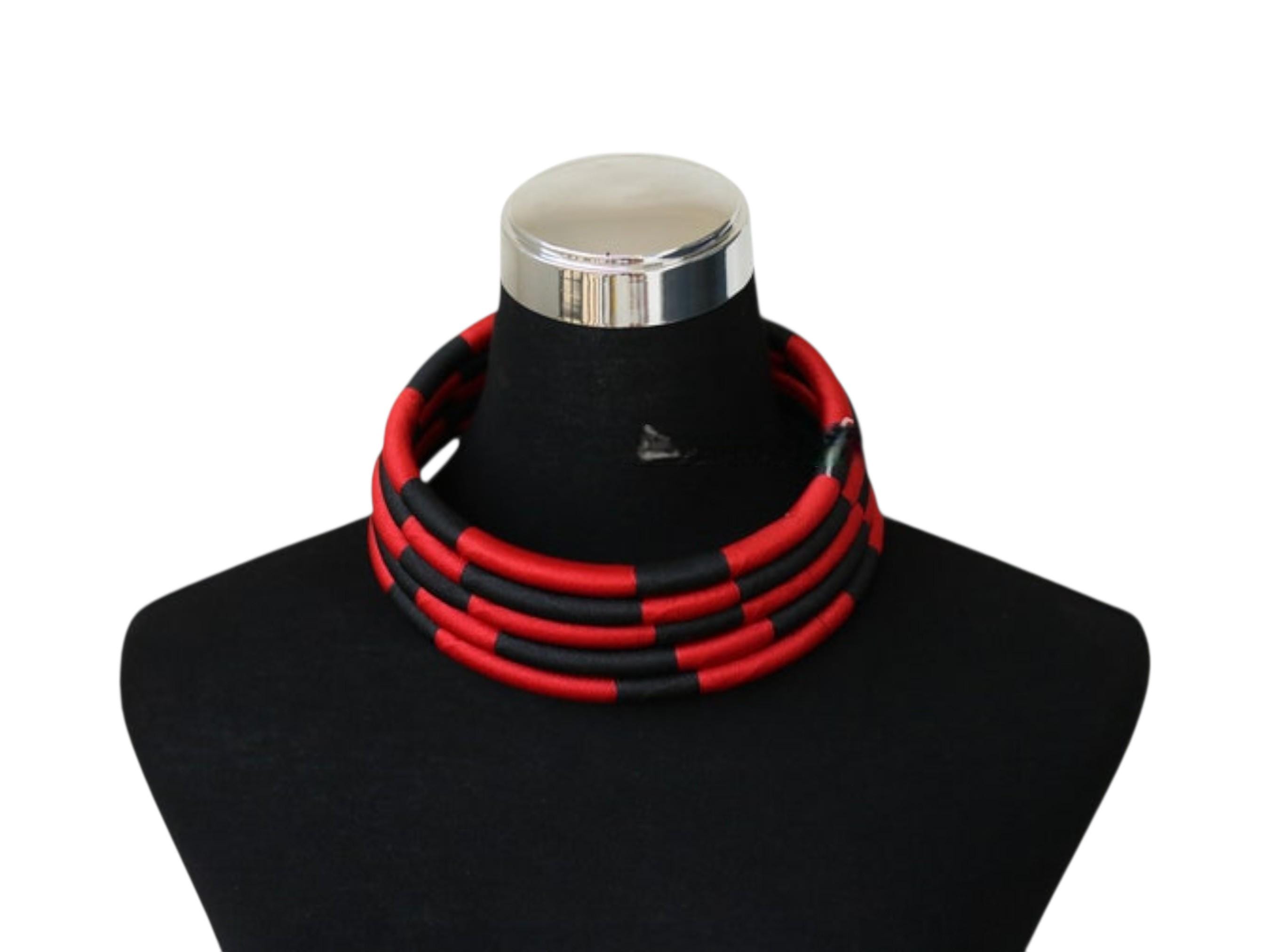 This spectacular African red and black choker set is a modern, structural pairing designed for a bold, graphic statement. The choker sits high on the neck, composed of multiple individual wire or rope bands. These bands are tightly wrapped in a material (likely fabric or thread) that alternates in eye-catching blocks of vibrant red and deep black. The stacked, segmented bands form a thick, solid collar, creating a powerful color-blocked effect that is reminiscent of traditional Maasai or Ndebele neck rings, but with a modern twist. The set includes matching circular hoop earrings crafted from the same red and black segments, completing the high-impact look. This accessory set is perfect for injecting drama and graphic elegance into monochrome or simple outfits. Searching for a truly unique, structural jewelry set or a signature accessory that provides bold contrast and modern tribal flair? This red & black segmented choker set is an unforgettable choice. This complete set is ready to wear and instantly brings powerful color, elegant structure, and contemporary African artistry to your ensemble.