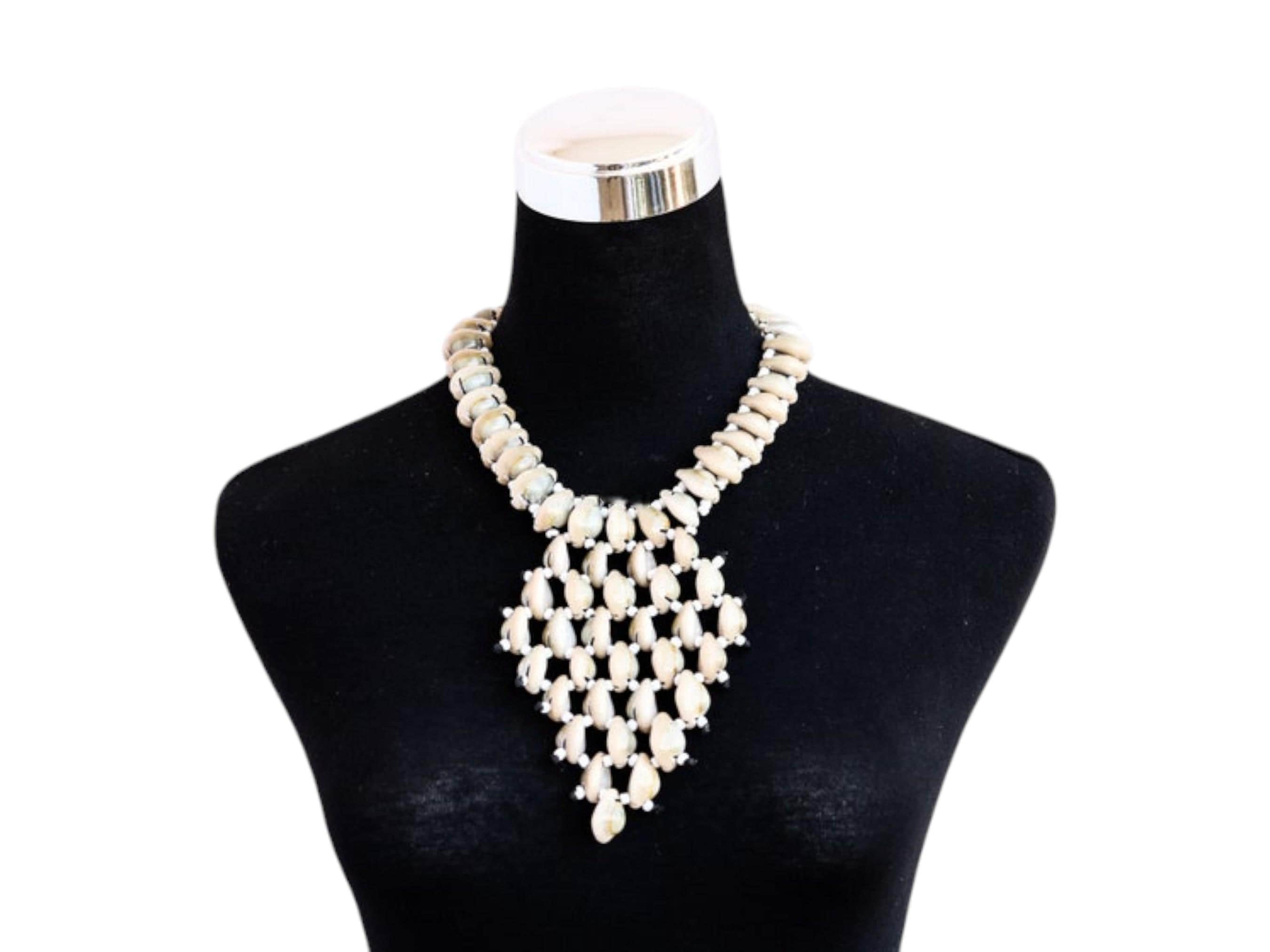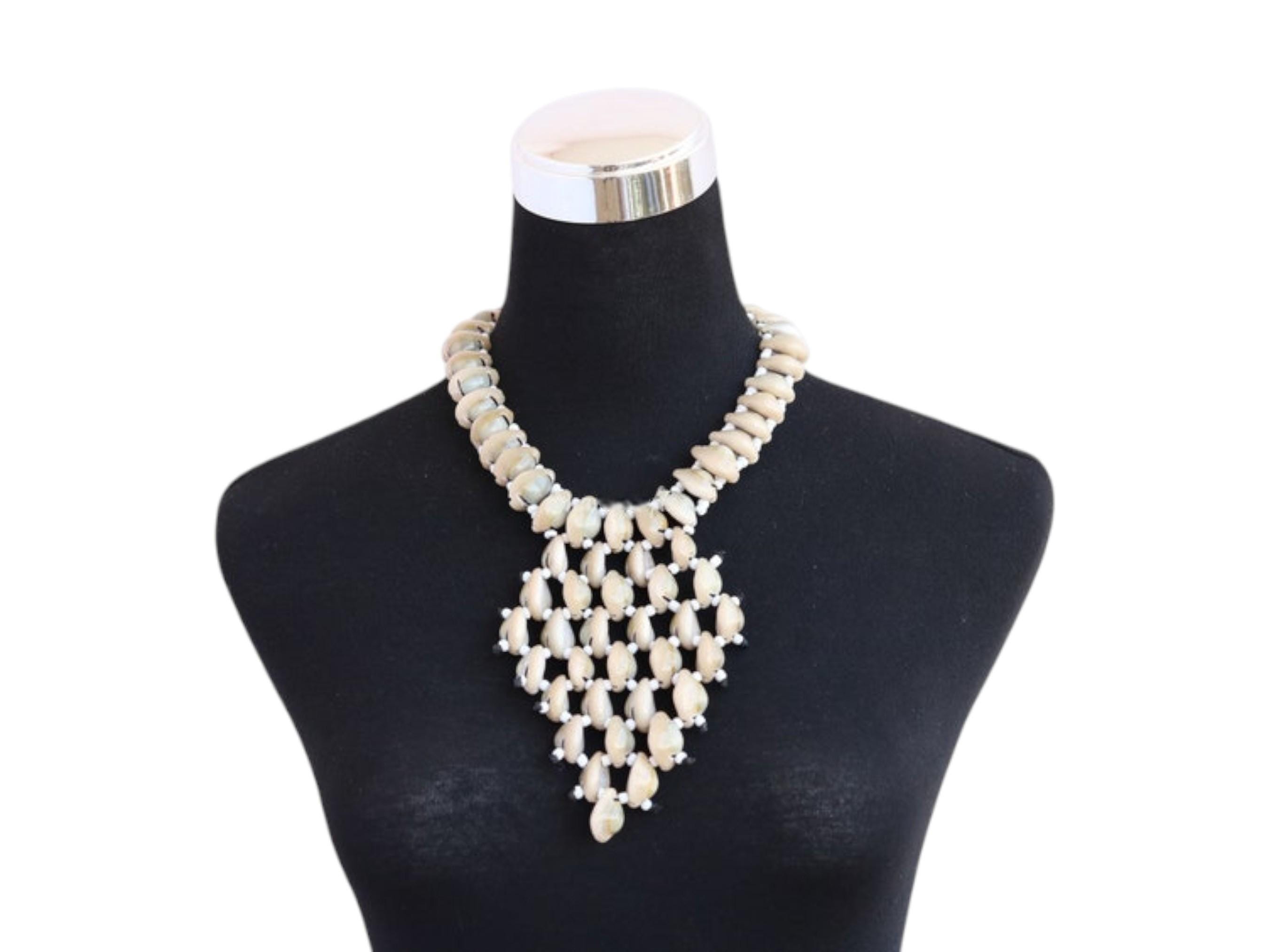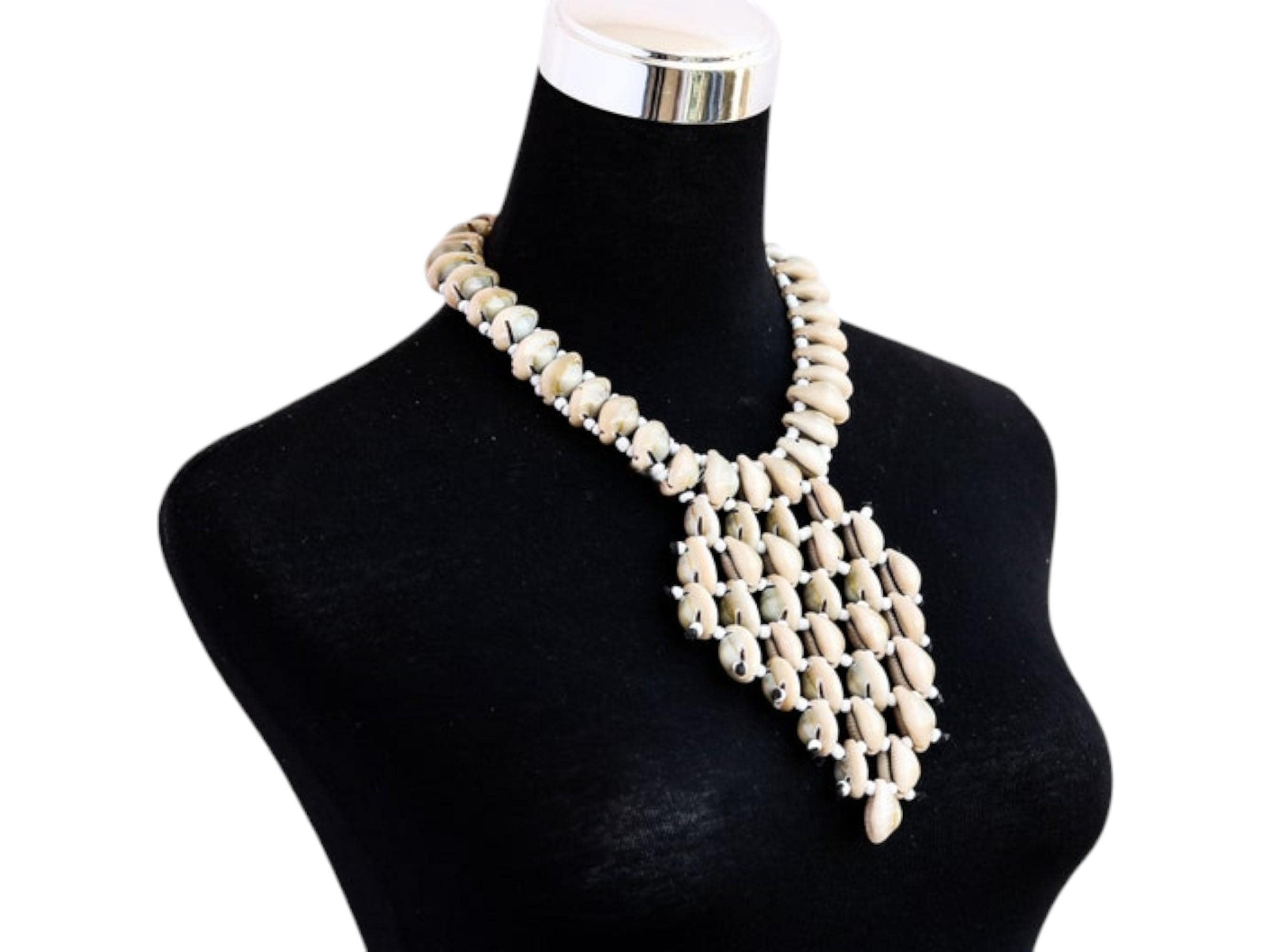 This spectacular handcrafted Cowrie Shell Mesh Capelet Necklace is a piece of exquisite natural artistry and high-impact tribal style. The necklace is structured as a wide collar that sits high on the neck and drapes dramatically over the shoulders like a capelet. It is meticulously crafted from hundreds of natural, cream-colored cowrie shells. The shells are linked together using small white seed beads to form an open, airy, yet structural mesh network. This woven shell and bead design showcases superb craftsmanship and a contemporary interpretation of traditional African adornment. Cowrie shells are historically rich symbols of prosperity, status, and connection to the sea. Searching for a truly unique, structural boho accessory or a signature necklace that provides natural texture and dramatic structure? This Cowrie Shell Mesh Capelet is an unforgettable choice. This piece is ready to wear and instantly brings organic elegance, rich texture, and authentic African artistry to your ensemble.