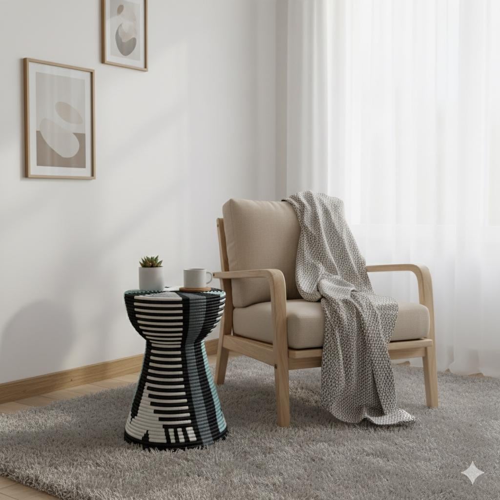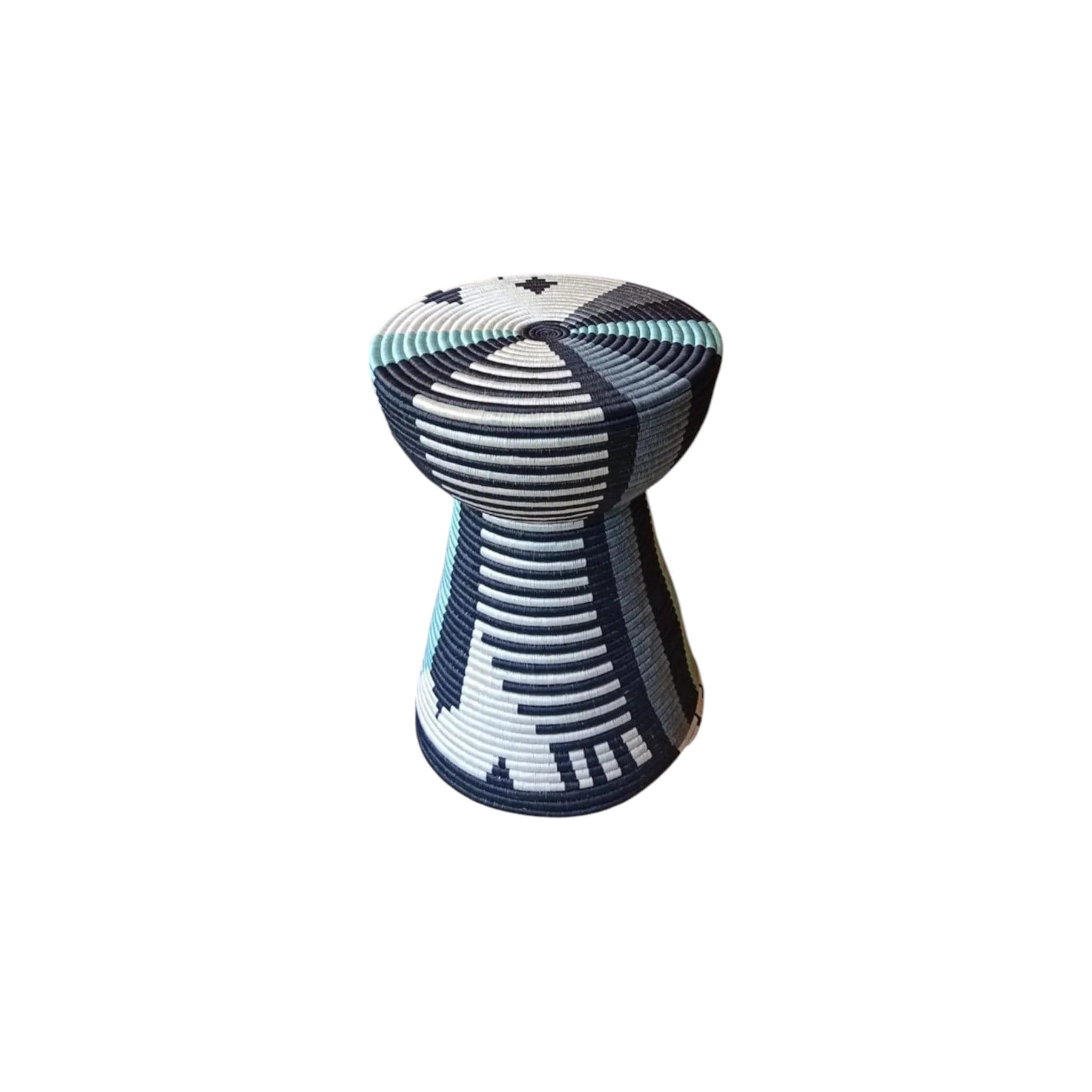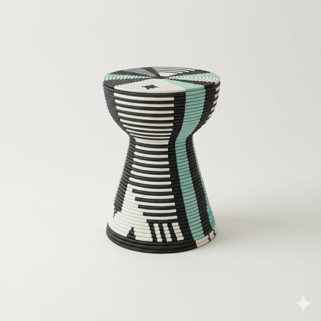Introduce bold texture and modern geometric design with this striking Handwoven Natural Fiber Stool or Side Table. Crafted in a sturdy hourglass shape, this piece features an intricate, abstract circular pattern created by blending black, white, grey, and subtle teal/blue dyed fibers. The graphic top design flows seamlessly into the rhythmic bands of the base, creating a dynamic, eye-catching visual. This versatile, artisan-made piece works perfectly as an accent stool, a unique bedside table, or a contemporary plant stand. It effortlessly bridges the gap between Bohemian, Eclectic, and Modern design, making it a powerful, unique statement that supports global craftsmanship and sustainable materials.