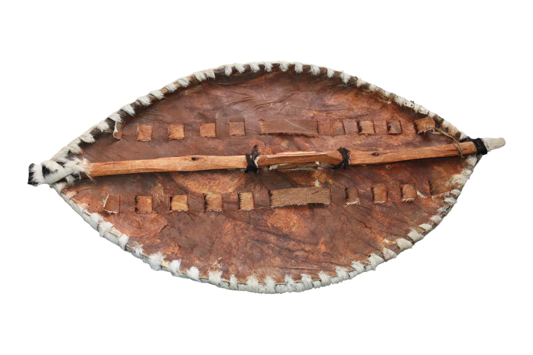 Make a dramatic statement with this striking decorative shield, inspired by the iconic, minimalist artifacts of the Zulu/Nguni warrior cultures. This shield is defined by the sharp, natural divide between the black and white sections of the hide. The hair-on-hide boasts an incredibly graphic, natural split, resulting in a bold, modern aesthetic. Crafted from genuine animal hide with a natural fur trim, it offers a rich, tactile, and rustic feel. It features the classic, contrasting small square markings that are traditionally stitched onto the hide. This shield is an ideal centerpiece for lodge, rustic, or minimalist tribal aesthetics, bringing powerful African art into your space. Finished with authentic, visible stitching, it underscores its traditional, handmade craftsmanship. It is ready to hang with a loop on the side for simple, immediate display as wall decor.