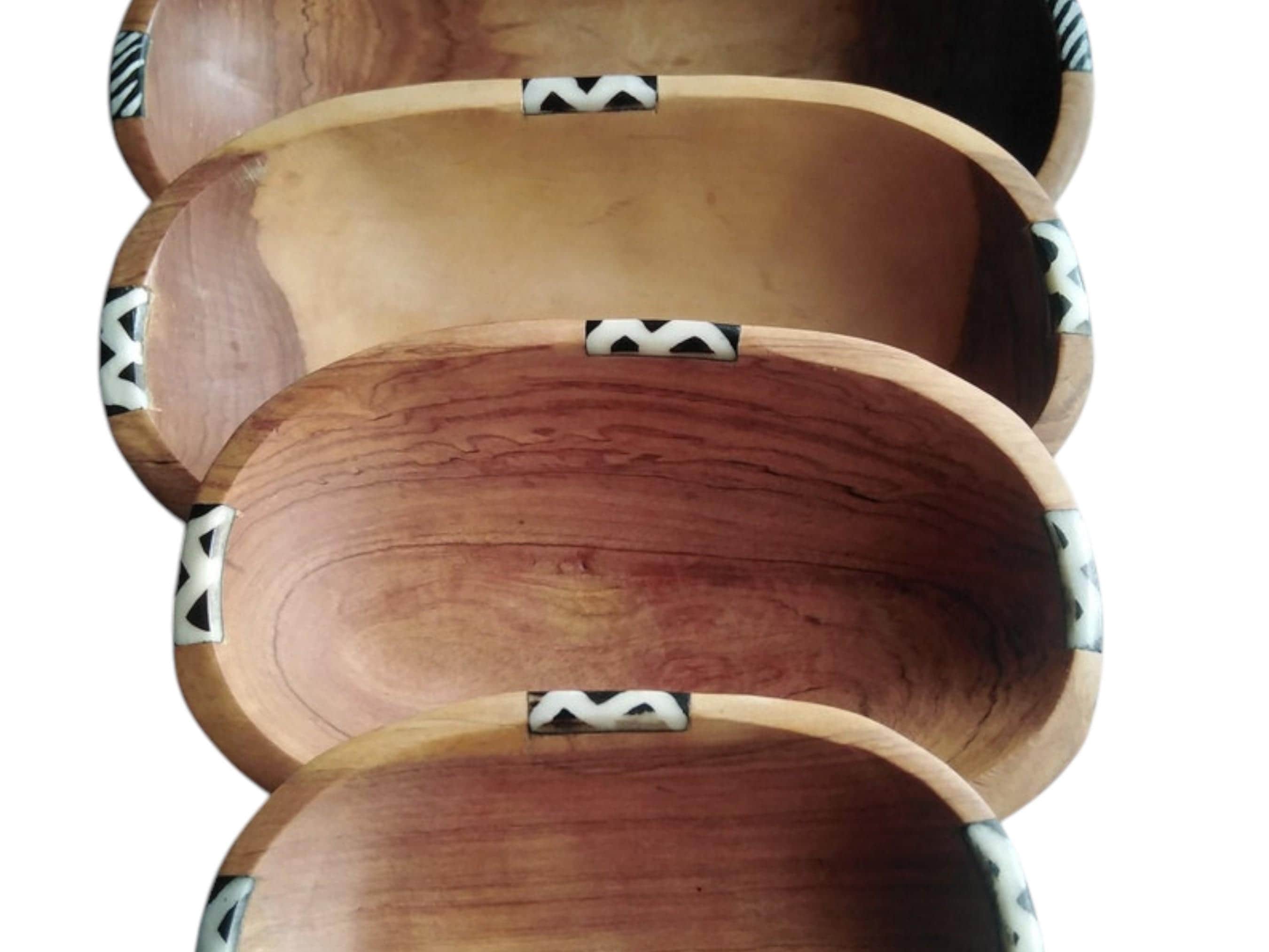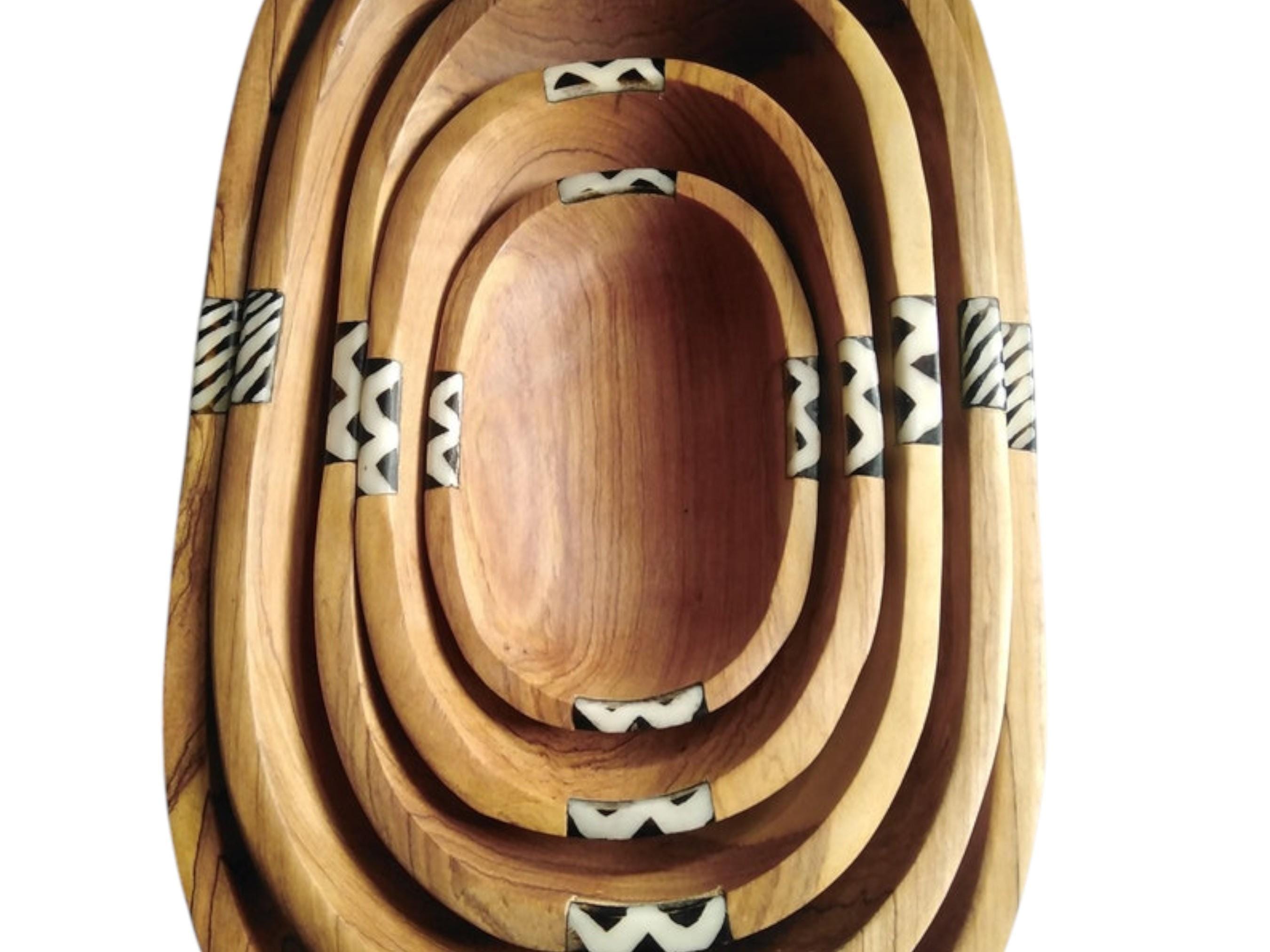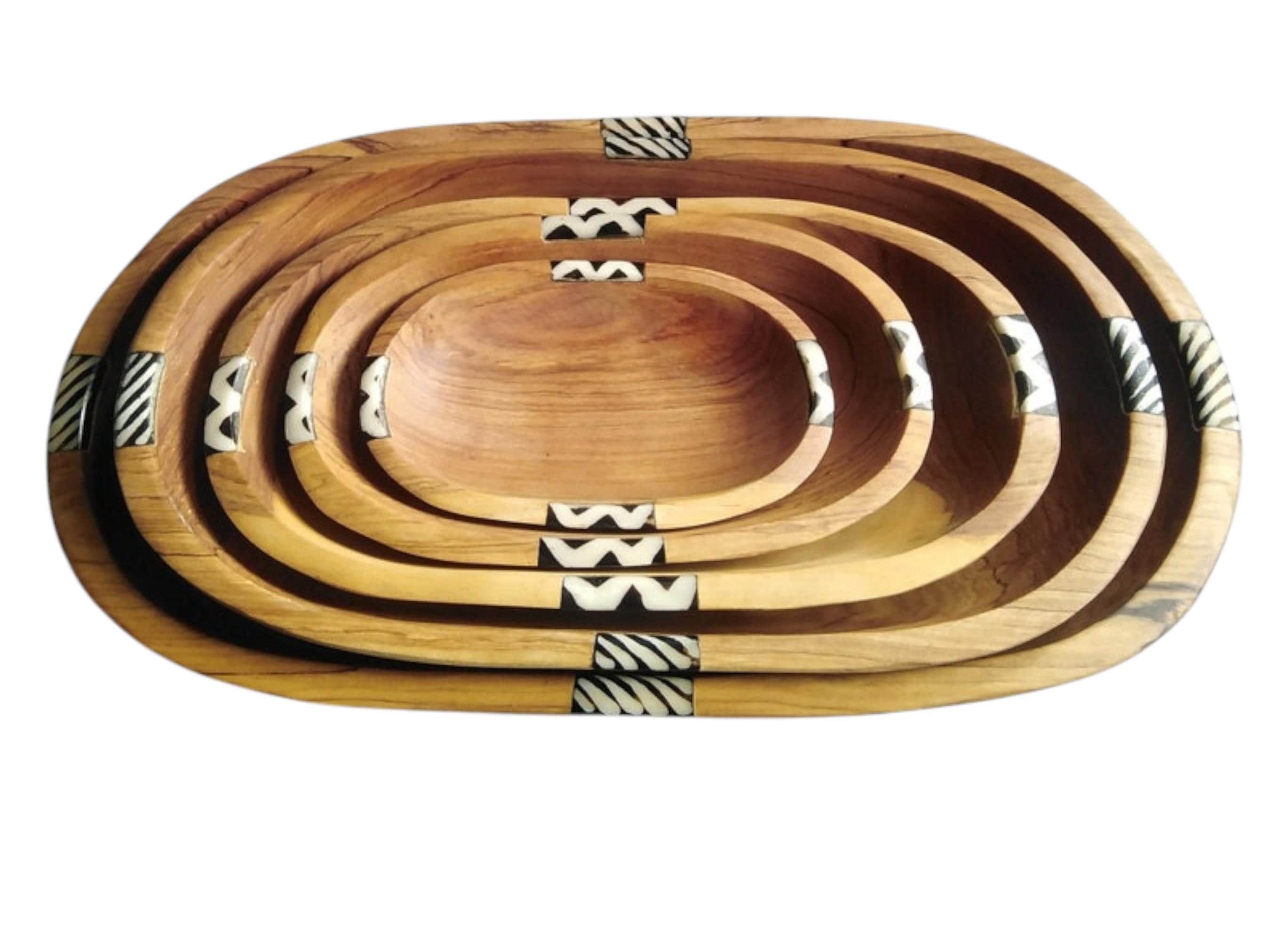 Elevate your serving collection with this beautiful set of four nested oval bowls, hand-carved by skilled artisans in East Africa. Crafted from durable, beautiful natural wood (often olive wood), the set features rich grain patterns and a warm tone. Each bowl is accented with a band of hand-cut bone inlay featuring a classic zebra stripe design. This zebra stripe design provides a sharp, tribal contrast and enhances the African art aesthetic. The four bowls stack neatly inside the largest one for easy storage and space-saving kitchen decor. This set is ideal for serving salads, fruits, and snacks or displaying as an elegant Bohemian (Boho) centerpiece. Each bowl is uniquely shaped and carved, underscoring its traditional, handmade quality. This set makes a wonderful, unique housewarming gift or wedding present.
