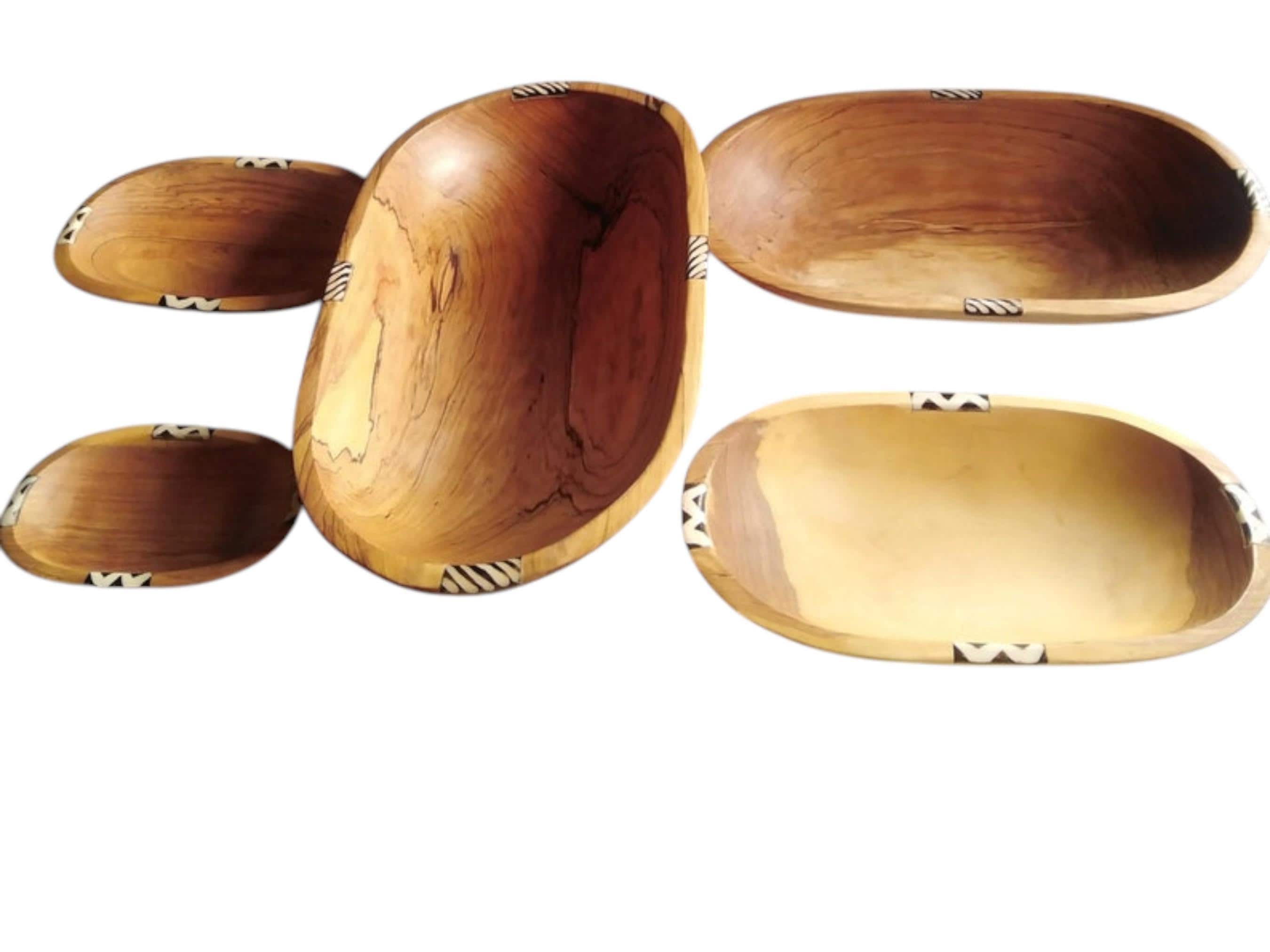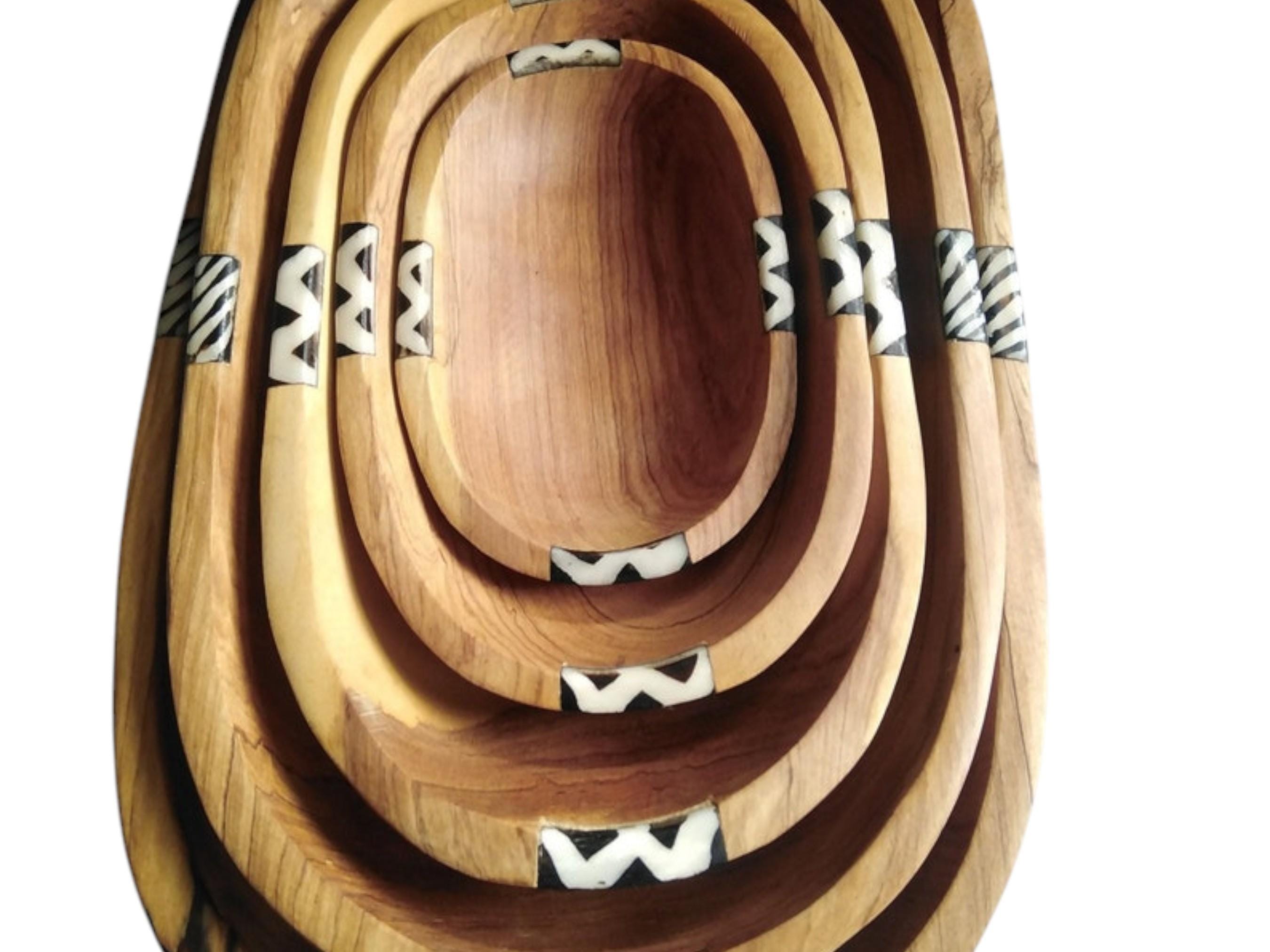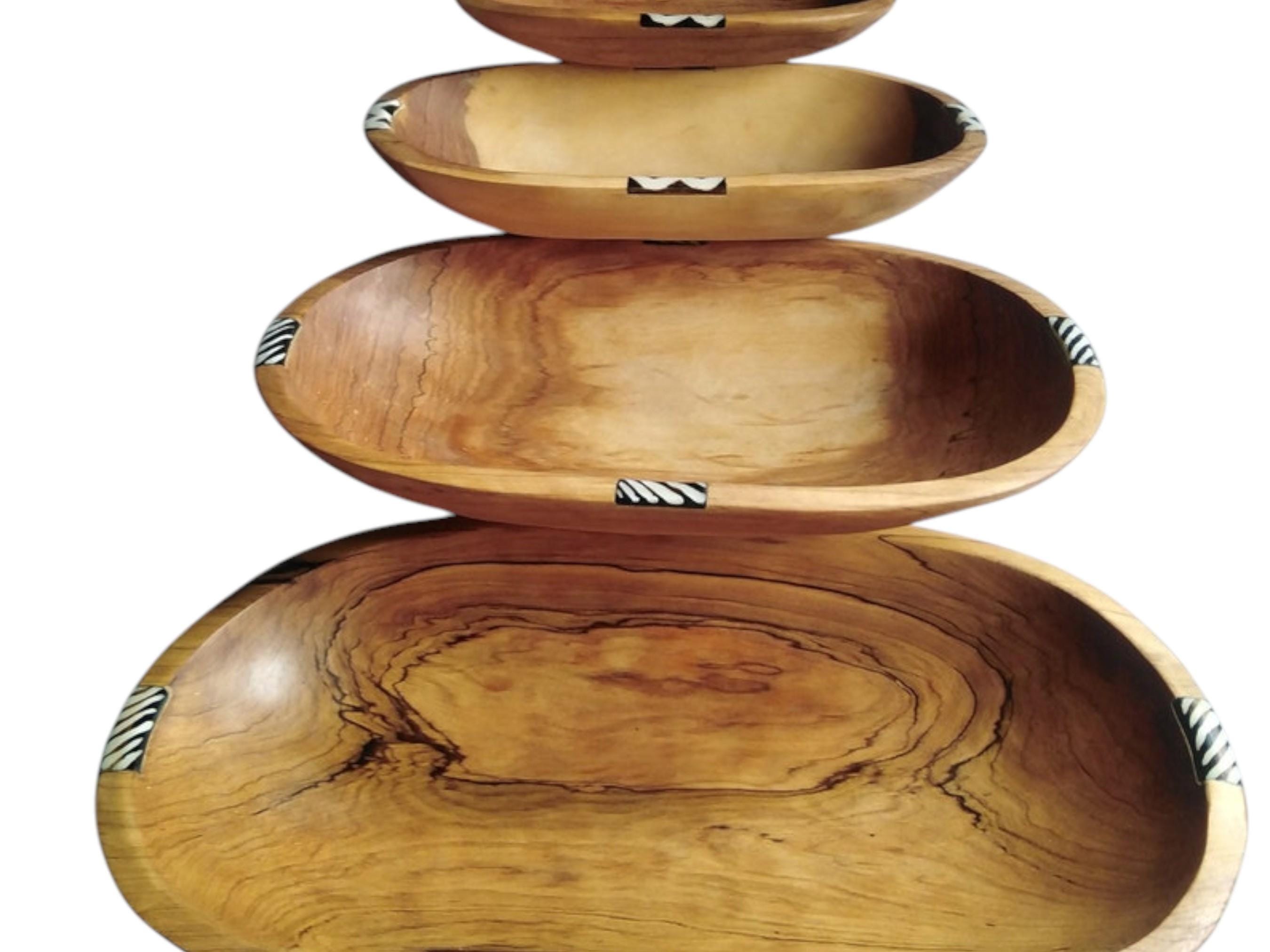 Elevate your serving collection with this beautiful set of four nested oval bowls, hand-carved by skilled artisans in East Africa. Crafted from durable, beautiful natural wood (often olive wood), the set features rich grain patterns and a warm tone. Each bowl is accented with a band of hand-cut bone inlay featuring a classic zebra stripe design. This zebra stripe design provides a sharp, tribal contrast and enhances the African art aesthetic. The four bowls stack neatly inside the largest one for easy storage and space-saving kitchen decor. This set is ideal for serving salads, fruits, and snacks or displaying as an elegant Bohemian (Boho) centerpiece. Each bowl is uniquely shaped and carved, underscoring its traditional, handmade quality. This set makes a wonderful, unique housewarming gift or wedding present.