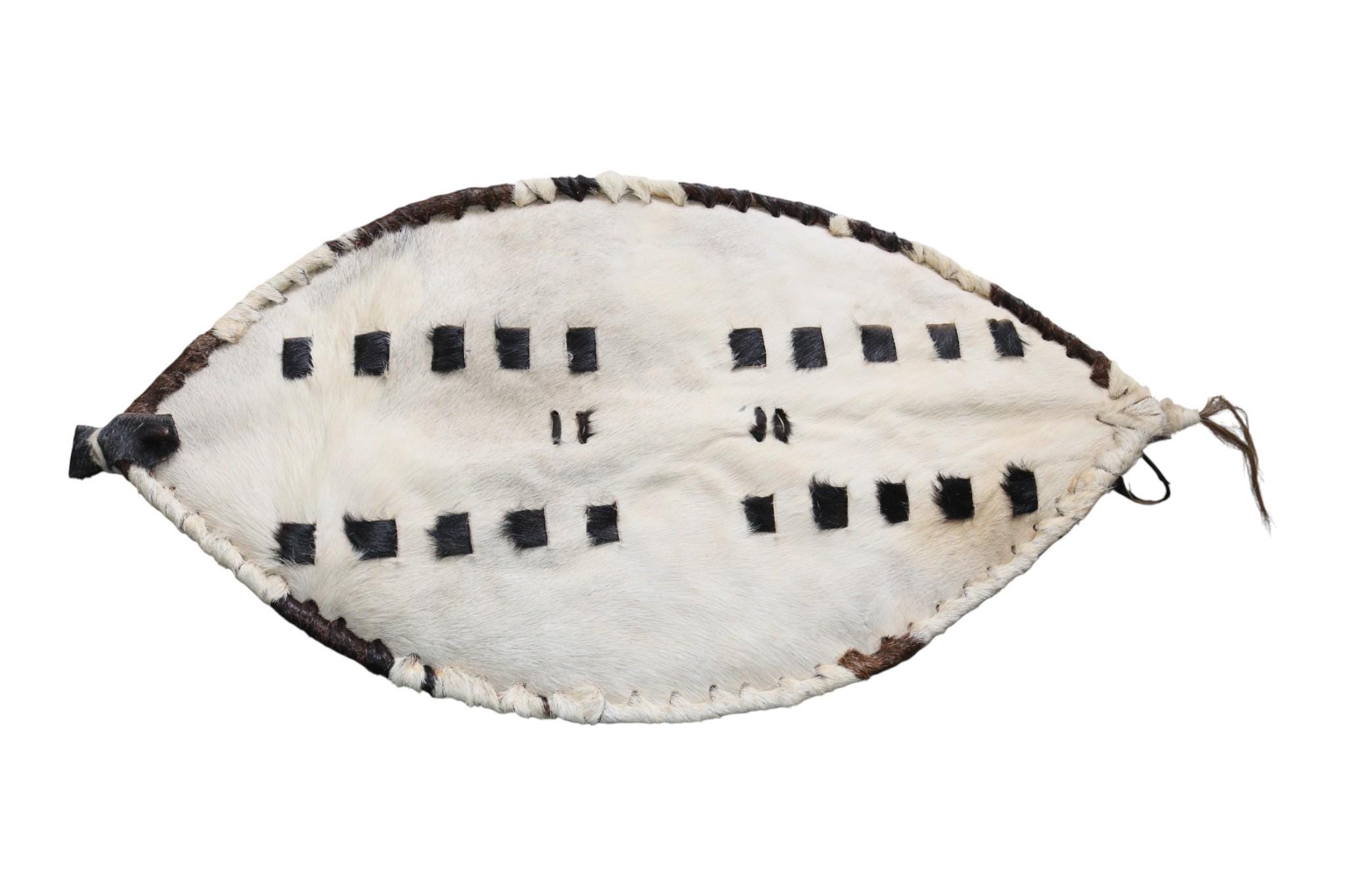 Bring a powerful yet clean aesthetic to your space with this stunning decorative shield, inspired by the iconic artifacts of the Zulu/Nguni cultures. This piece is defined by its predominantly white hair-on-hide surface, providing a bright, high-contrast backdrop. The minimalist design makes it versatile for contemporary, minimalist, or Scandinavian styles while retaining its tribal character. Crafted from genuine animal hide with a natural fur trim, it offers a rich, tactile, and rustic feel. It features the classic, contrasting small black square markings that are traditionally stitched onto the hide. This shield is an ideal centerpiece for lodge, rustic, or Bohemian (Boho) aesthetics, bringing powerful African art into your space. Finished with durable, visible stitching, it underscores its traditional, handmade craftsmanship. It is ready to hang with a loop on the side for simple, immediate display as wall decor.
