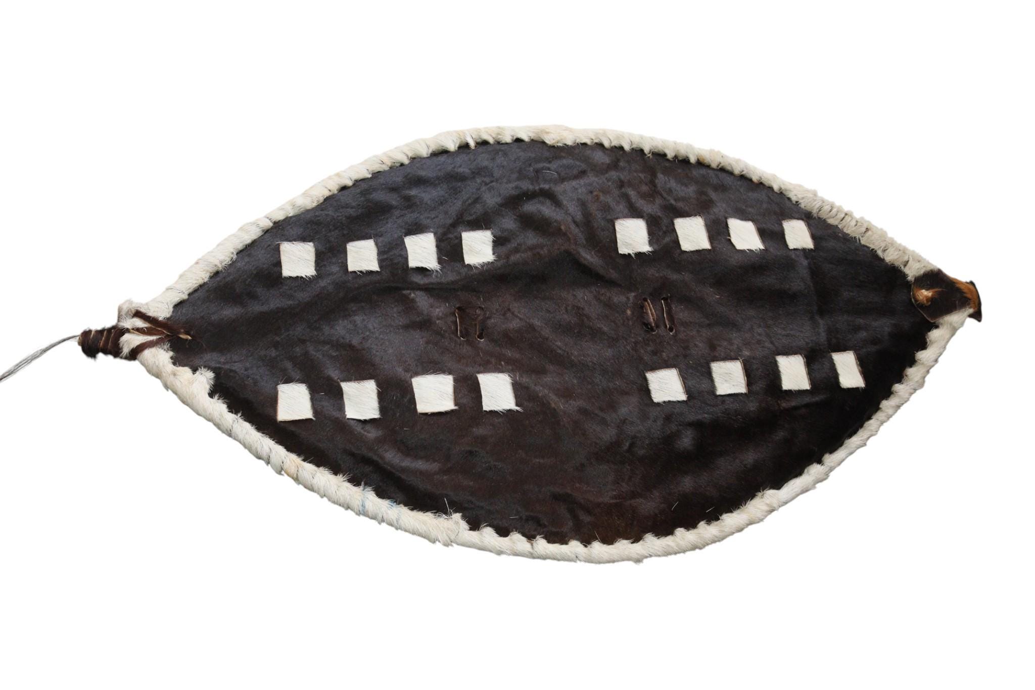 Command presence with this powerful and authentic decorative shield, inspired by the iconic artifacts of the Zulu/Nguni cultures. This shield is distinguished by its rich, nearly uniform dark brown/black hide, providing a dramatic backdrop for the traditional white markings. The classic small white square markings stand out dramatically against the dark hide, drawing the eye to the tribal structure. Crafted from genuine animal hide with a natural fur trim, it offers a rich, tactile, and rustic feel. The dark tone is perfect for a lodge or sophisticated, moody interiors. This shield is an ideal centerpiece for minimalist tribal or Bohemian (Boho) aesthetics, bringing powerful African art into your space. Finished with durable, visible stitching, it underscores its traditional, handmade craftsmanship. It is ready to hang with a loop on the side for simple, immediate display as wall decor.