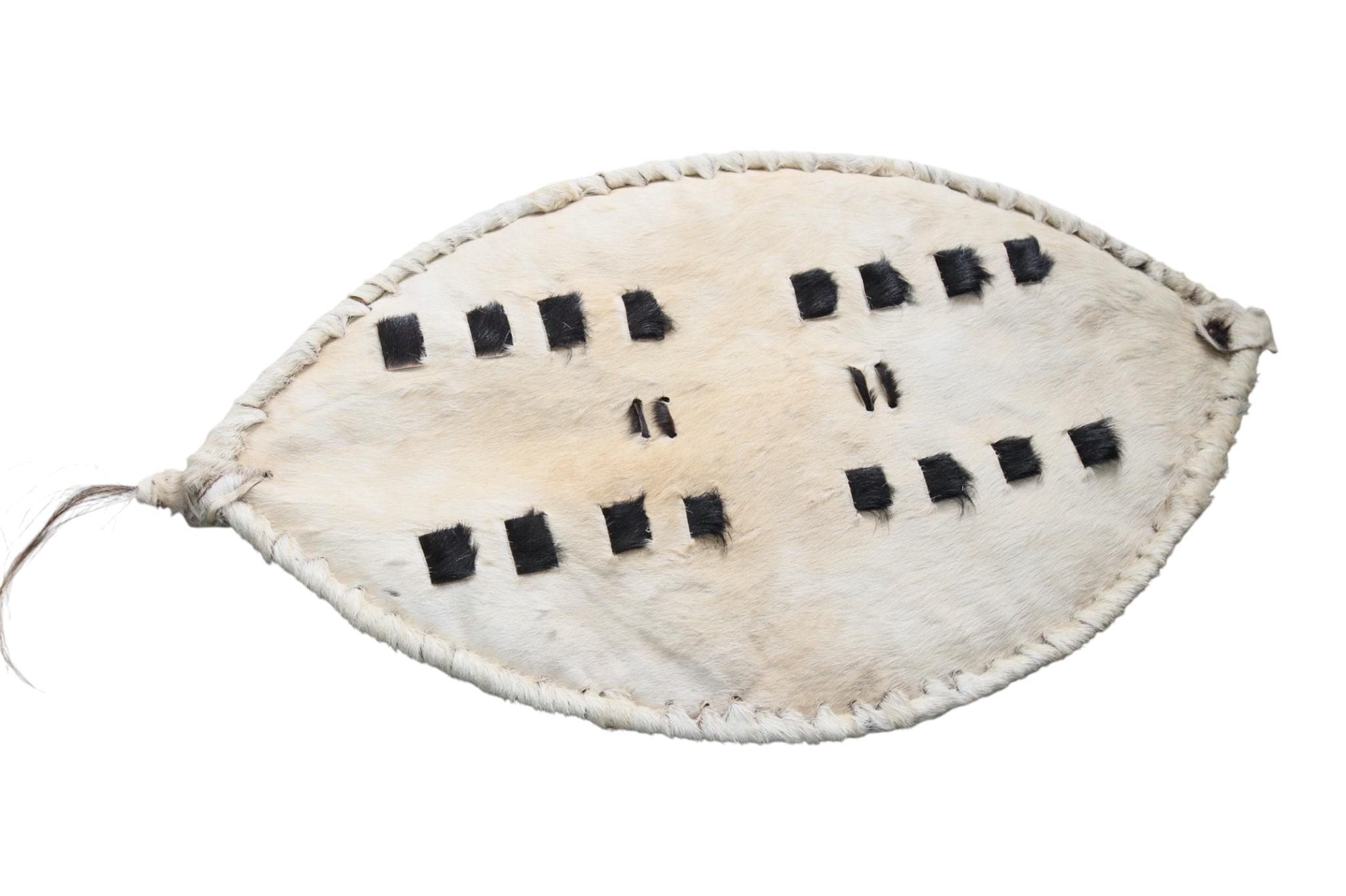Bring a powerful yet clean aesthetic to your space with this stunning decorative shield, inspired by the iconic artifacts of the Zulu/Nguni cultures. This piece is defined by its predominantly cream/white hair-on-hide surface, providing a bright, high-contrast backdrop. The minimalist design makes it versatile for contemporary, minimalist, or Scandinavian styles while retaining its tribal character. Crafted from genuine animal hide with a natural fur trim, it offers a rich, tactile, and rustic feel. It features the classic, contrasting small black hair square markings that are integrated into the hide. This shield is an ideal centerpiece for lodge, rustic, or Bohemian (Boho) aesthetics, bringing powerful African art into your space. Finished with durable, visible stitching, it underscores its traditional, handmade craftsmanship. It is ready to hang with a loop on the side for simple, immediate display as wall decor.