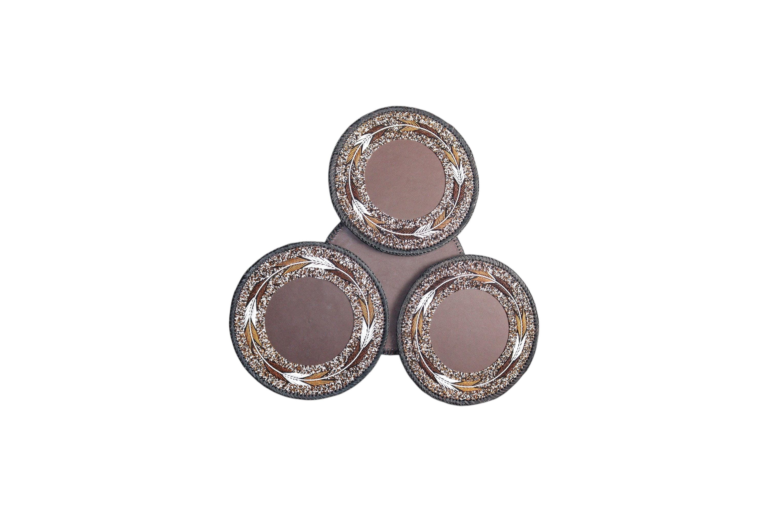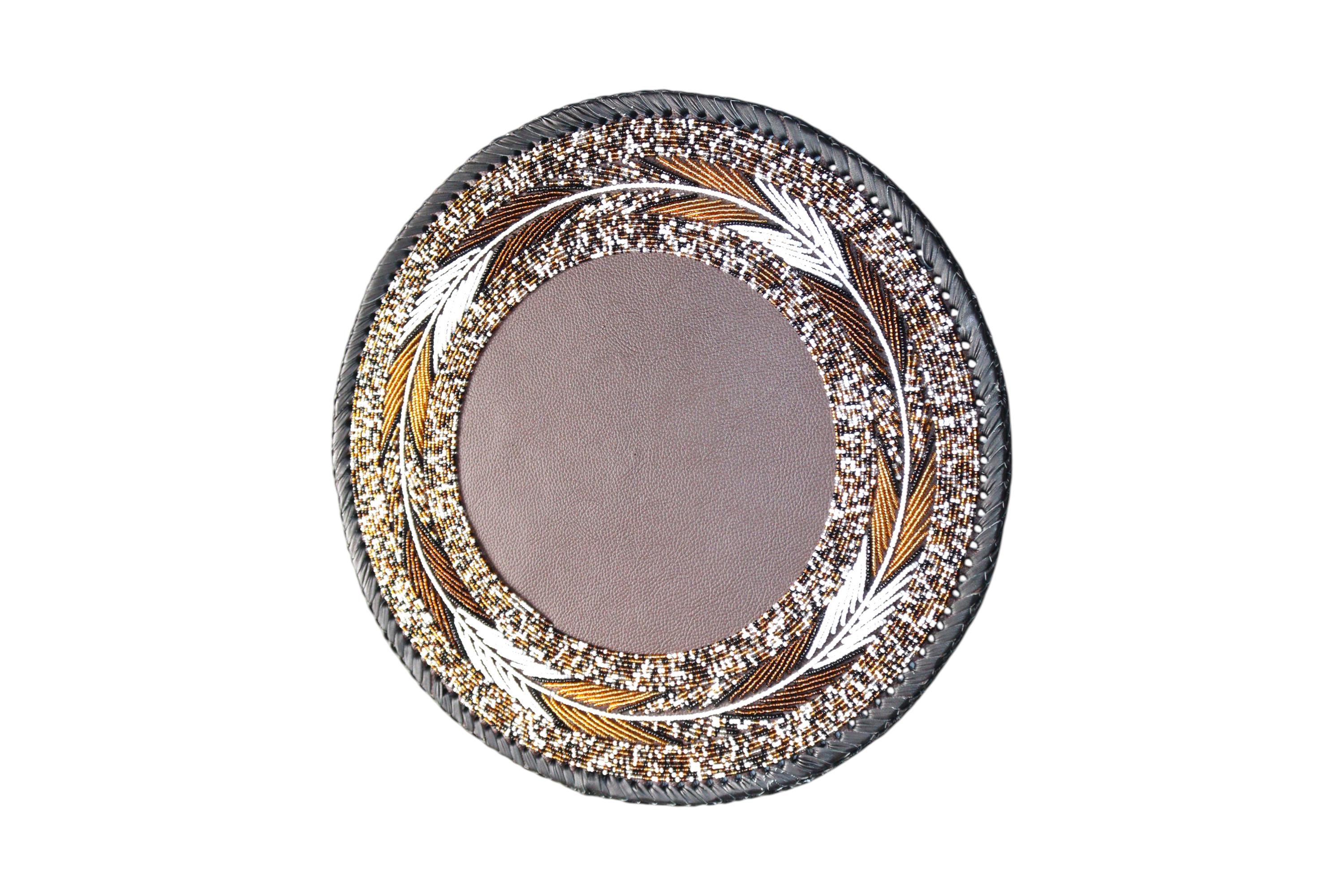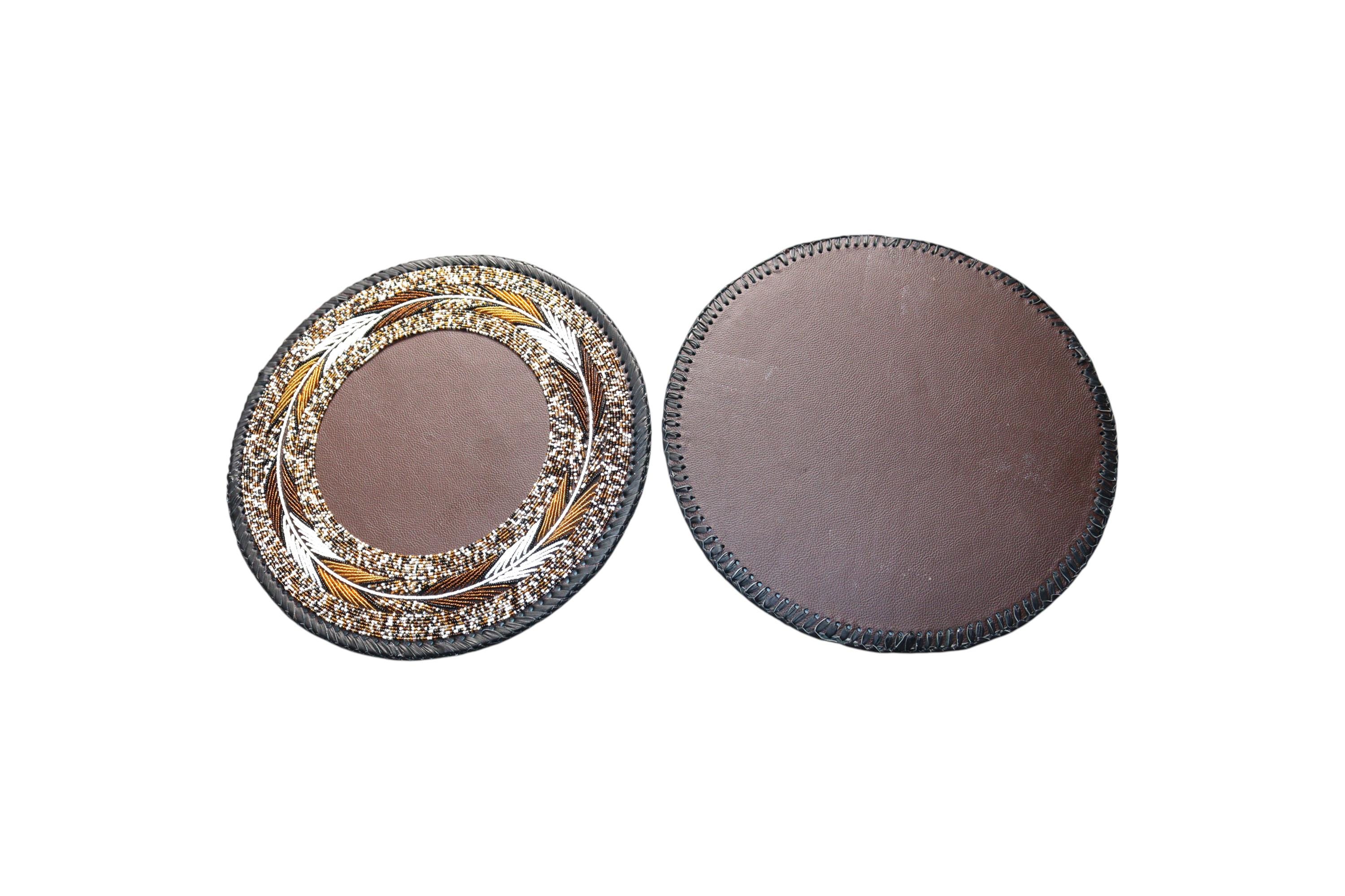 Bring an exquisite touch of African craftsmanship and luxury to your table setting with this stunning set of two beaded placemats (or large coasters). Each piece is meticulously hand-beaded by skilled artisans, creating a beautiful work of functional art. Features a complex pattern of gold, white, and bronze beads, arranged in a delicate leaf or feather motif. The tight, precise beading and sturdy woven rope edge ensure both durability and a refined finish. The rich blend of metallic and neutral tones is perfect for adding a glamorous, Bohemian (Boho), or Global Luxe accent. This set is ideal for use as decorative placemats, large coasters, or unique plate chargers. This unique item makes a fantastic housewarming gift or hostess present for collectors of ethnic decor. This listing includes a matching pair, ready to instantly elevate your home decor.