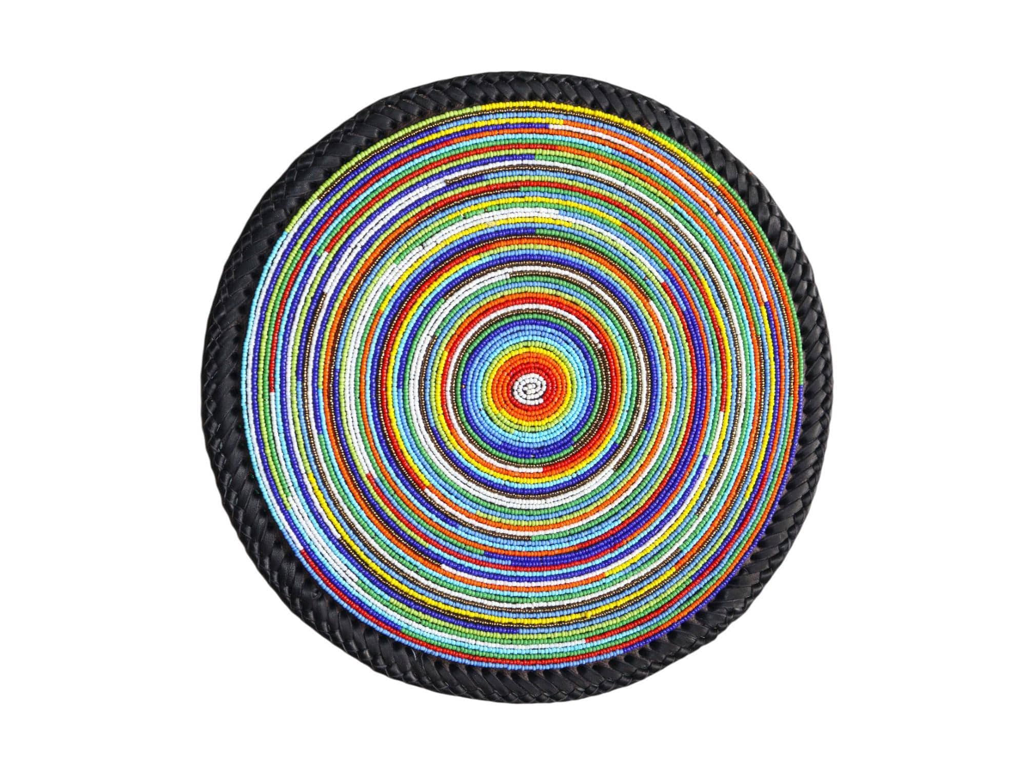 Add a pop of vibrant color and intricate craftsmanship with this stunning round beaded mat. Each piece is meticulously hand-beaded by skilled artisans, creating a captivating spiral pattern of rainbow colors. Features a dense arrangement of multi-colored beads that radiate outwards from the center in a hypnotic concentric spiral. The bold, rich colors are perfect for adding a bright Bohemian (Boho) or Global Eclectic accent. The tight, precise beading is complemented by a sturdy, contrasting dark woven edge. This mat is ideal as a decorative placemat, a large coaster, or a unique centerpiece. It showcases traditional African beadwork craftsmanship, making it an authentic, handmade piece of African decor. This mat is ready to instantly elevate your table setting.