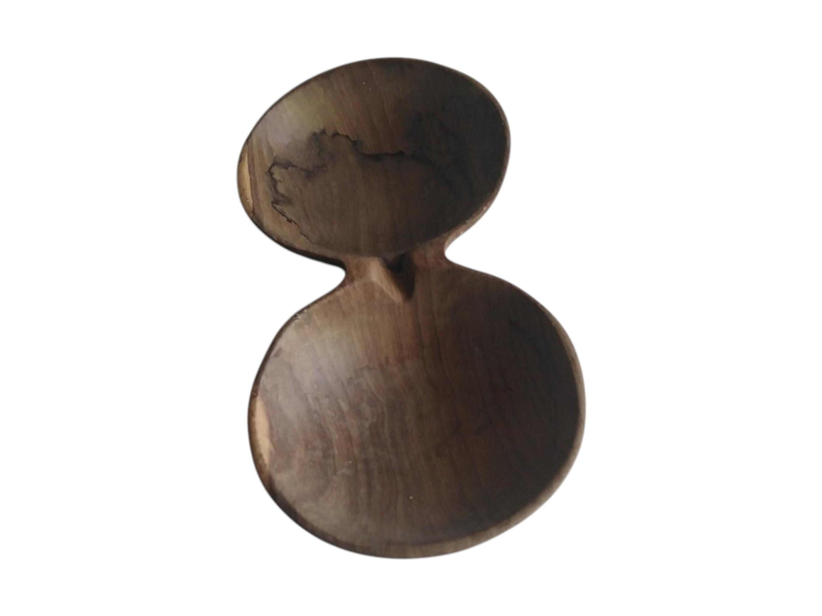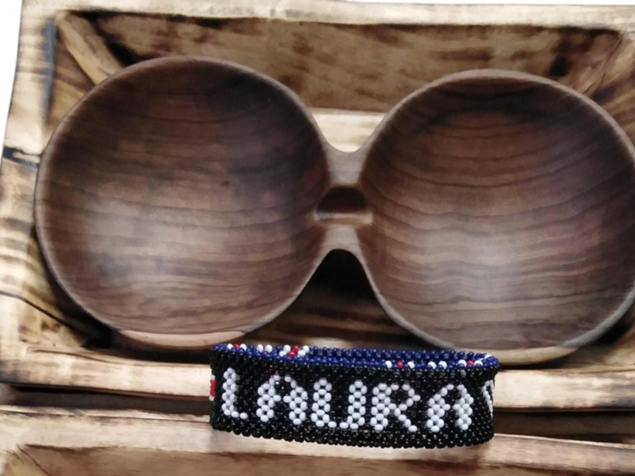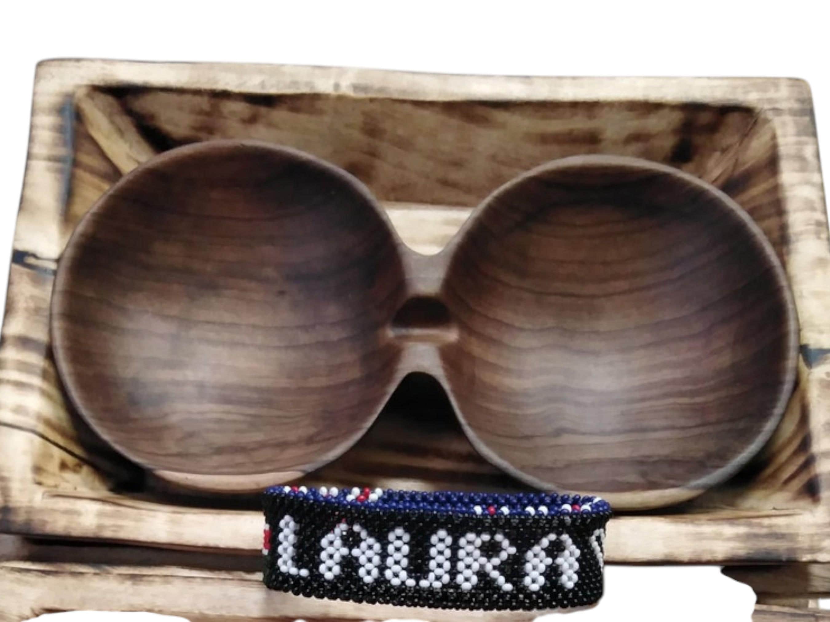 This unique set combines natural rustic decor with a touch of personalized flair, making it an excellent gift or a distinctive home accent. The centerpiece is a stylish, hand-carved wooden bowl featuring two joined compartments (nut bowl or double serving dish). It is made from a rich, dark-toned wood with a visible grain, resting on a lighter, square wooden base. The bowl is ideal for serving snacks, perfect for rustic or lodge kitchen decor. The second part is a beautiful handmade beaded cuff bracelet featuring the name of your choice spelled out in white beads. The bracelet showcases traditional tight beadwork in contrasting colors (black, white, red, and blue). This set is a wonderful, personalized African artisan gift. The items can be sold together or listed separately as high-quality, handmade decor.