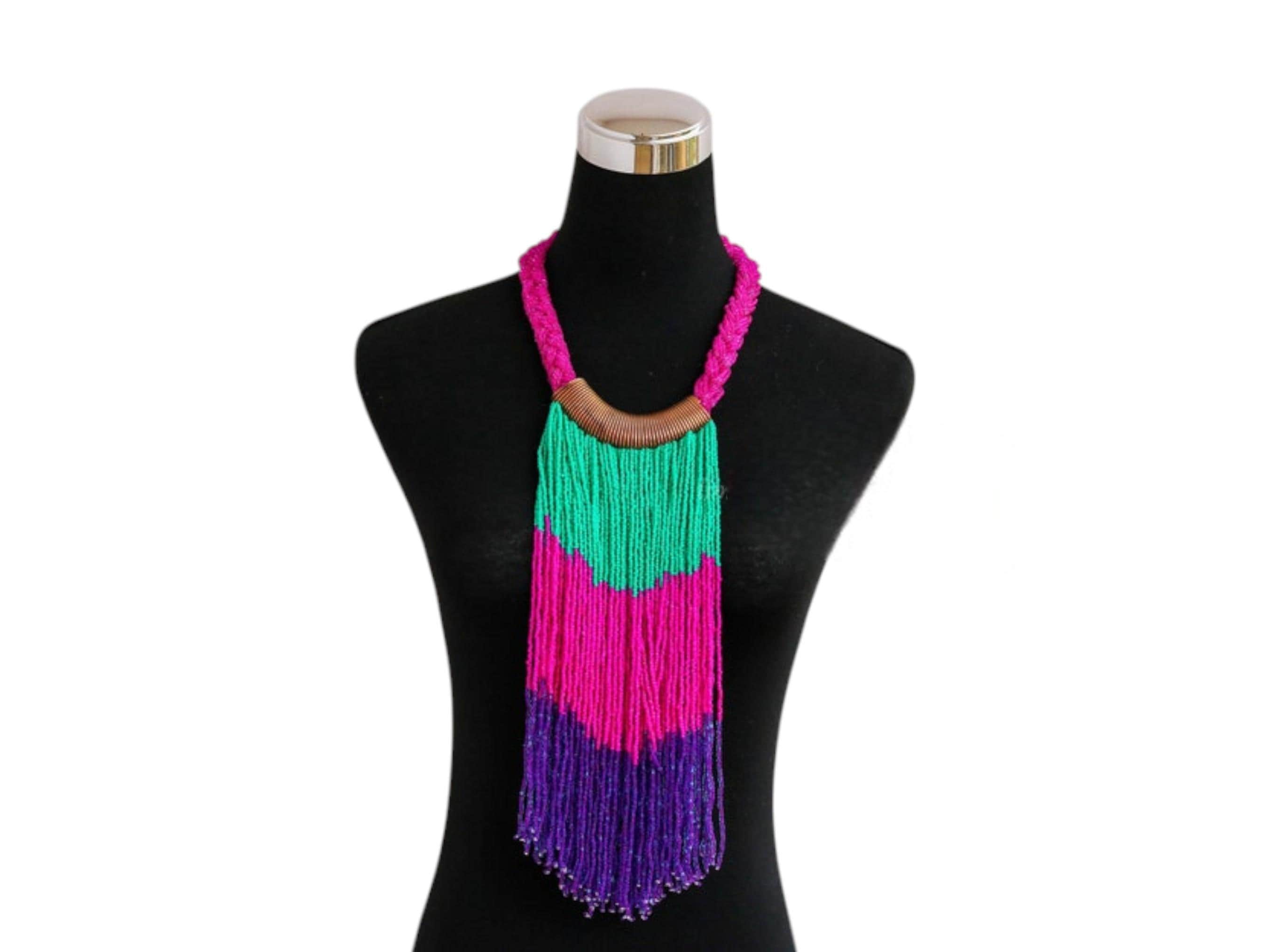 Make a striking statement with this dramatic tiered beaded fringe necklace. This piece showcases exceptional African artistry, featuring dense layers of seed beads that create a captivating cascading effect. The long fringe is arranged in three distinct color blocks: a vibrant green layer, a bold hot pink layer, and a rich purple layer. It is supported by a thick, braided, or rolled pink upper portion. A smooth, curved metallic accent piece holds the fringe sections together. Designed to be a showstopper, this necklace is perfect for festivals or special occasions. This piece of African tribal jewelry fits seamlessly into boho and global fashion trends. Each section is meticulously hand-beaded, ensuring a high-quality, wearable piece of art.
