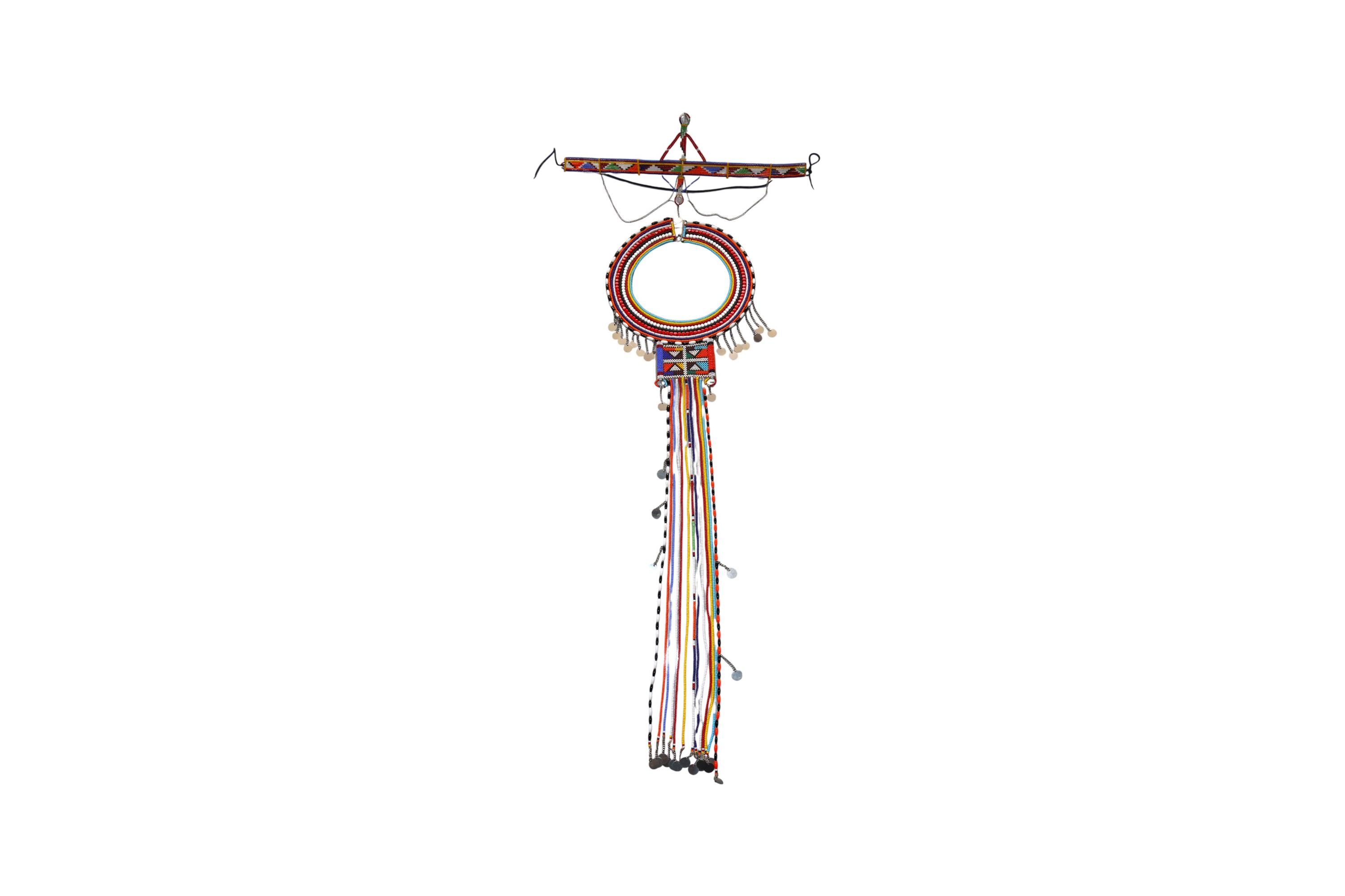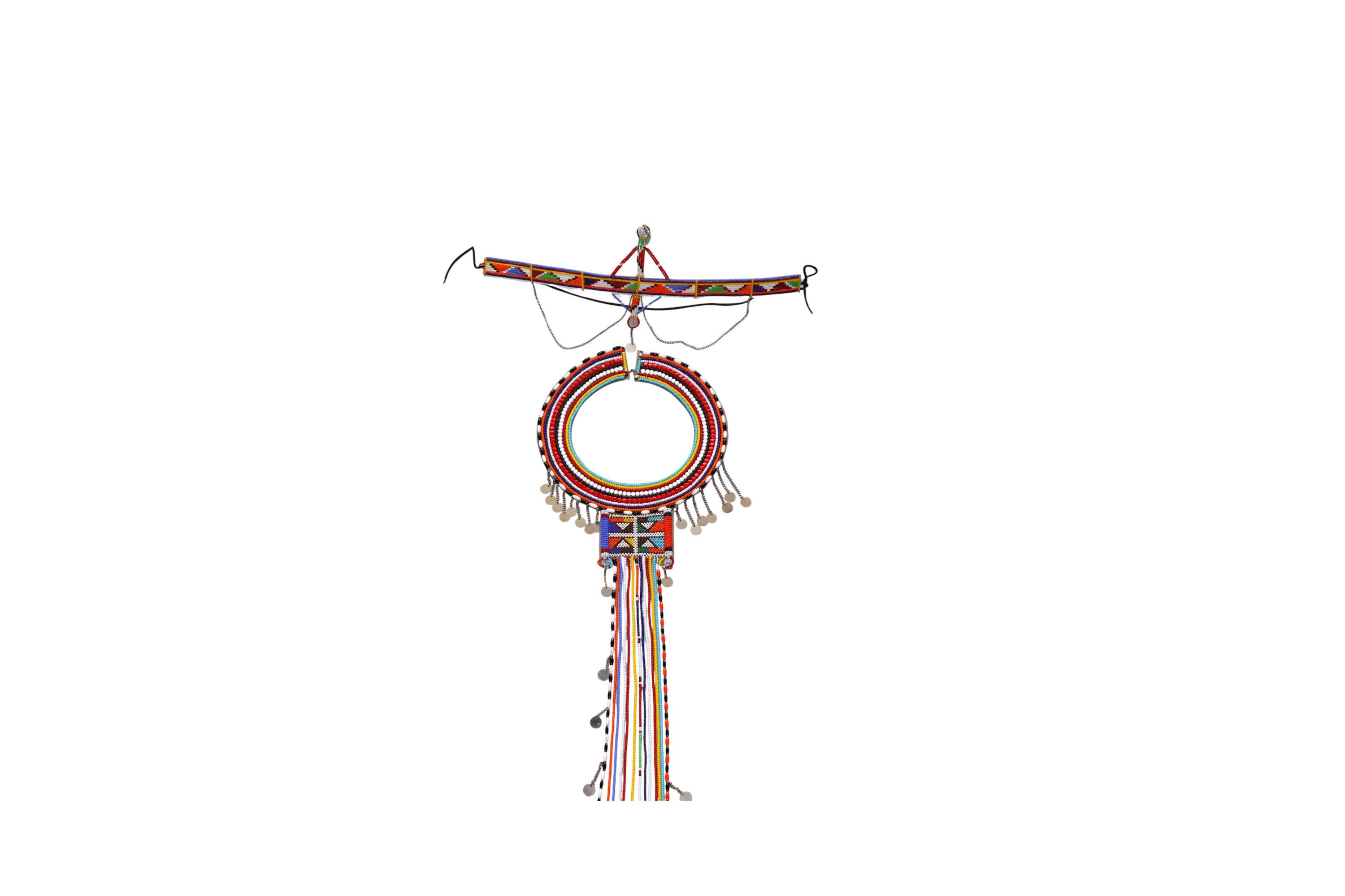Command attention with this magnificent XXL African statement necklace. This piece reflects the grandeur of traditional East African ceremonial wear. It features a beaded upper neckband, a very large, brightly colored circular beaded pendant, and numerous strands of long, layered beaded tassels. It utilizes traditional Maasai seed bead techniques in striking multi-colored patterns. The circular pendant is embellished with small metallic discs or bells for added movement. The long tassels add dramatic length, perfect for festival or maximalist style. Its impressive size makes it a stunning piece of wall art or global eclectic home decor. This necklace is truly a wearable piece of African art.