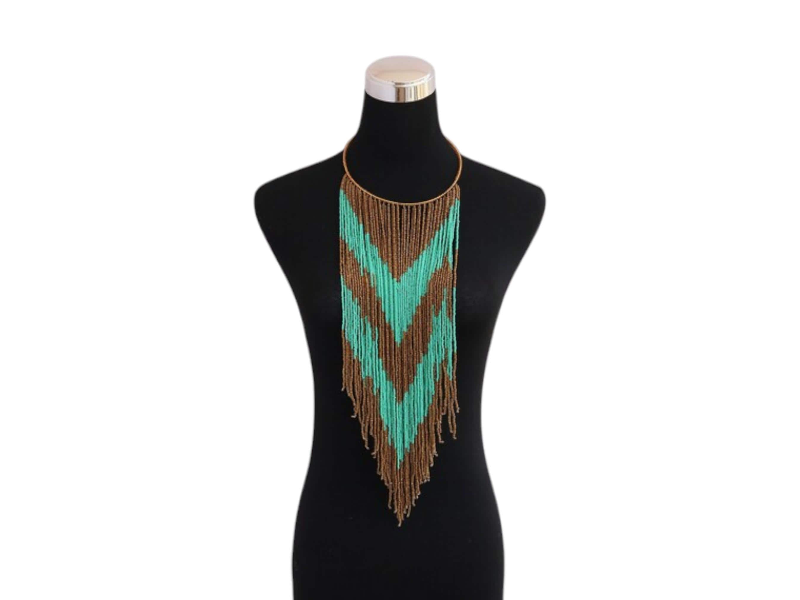 Elevate your style with this sleek and dramatic long beaded fringe necklace. This piece showcases a modern design based on traditional seed bead artistry. The fringe drops in a deep V-shape, featuring bold chevron blocks of color. It features a striking combination of shimmering metallic bronze/brown beads and cool, crisp mint green/turquoise beads. The necklace is supported by a simple, elegant metallic gold/bronze neck wire or collar. The impressive length and pattern make this a true statement accessory. This piece of African tribal-inspired jewelry fits seamlessly into Boho and Global Luxe fashion. It is perfect for enhancing V-necklines or simple tops.