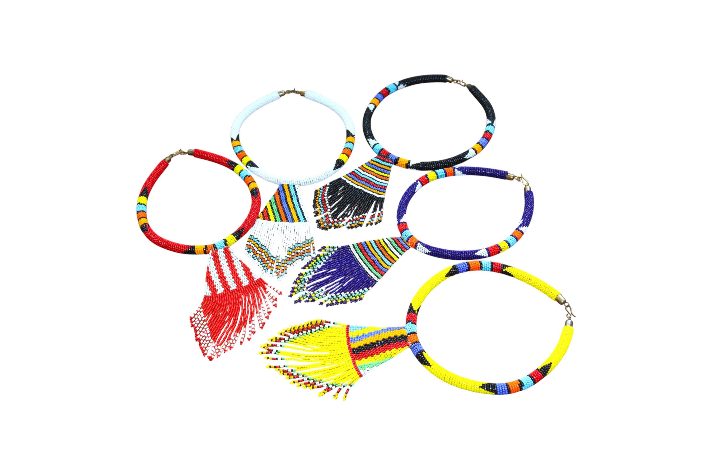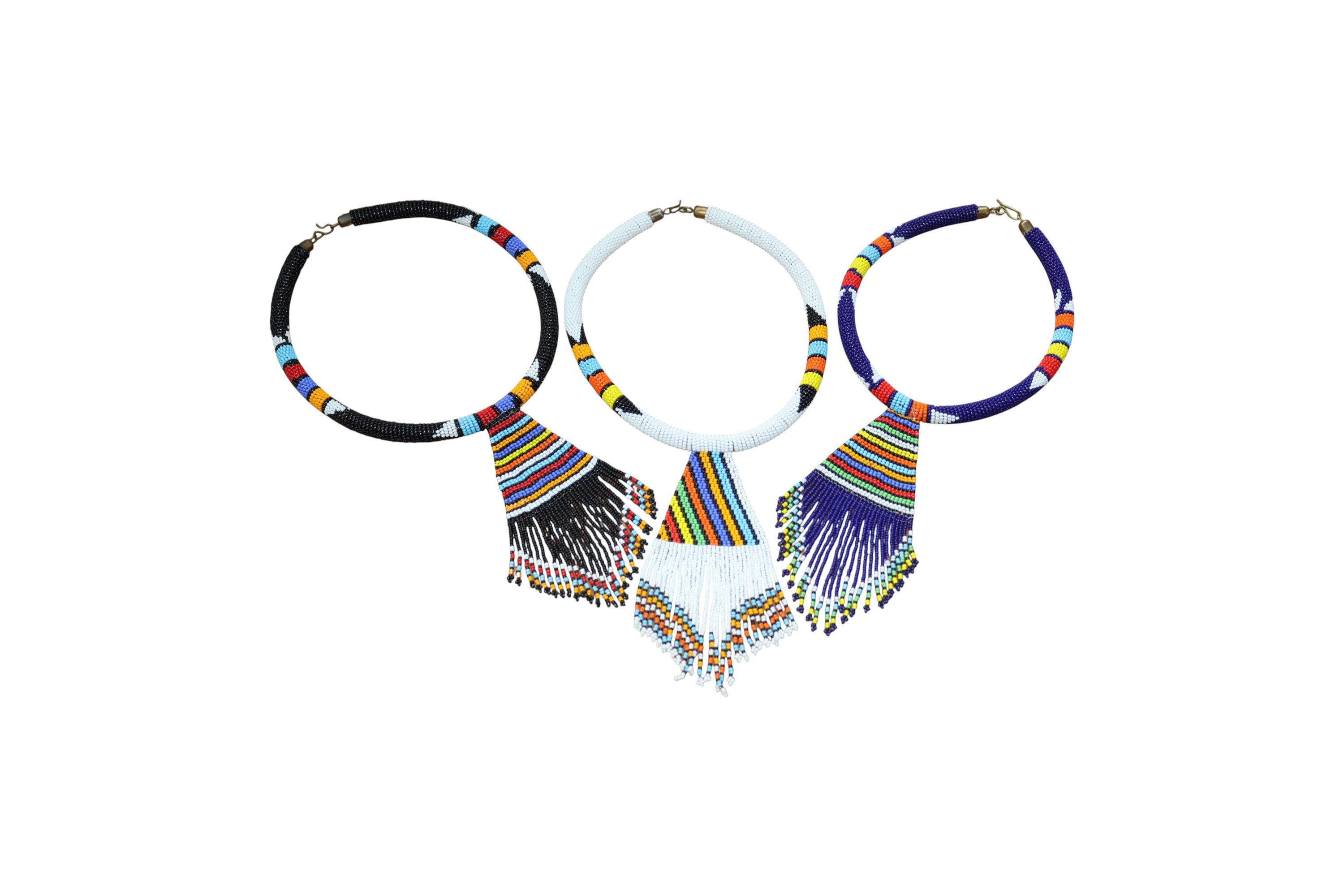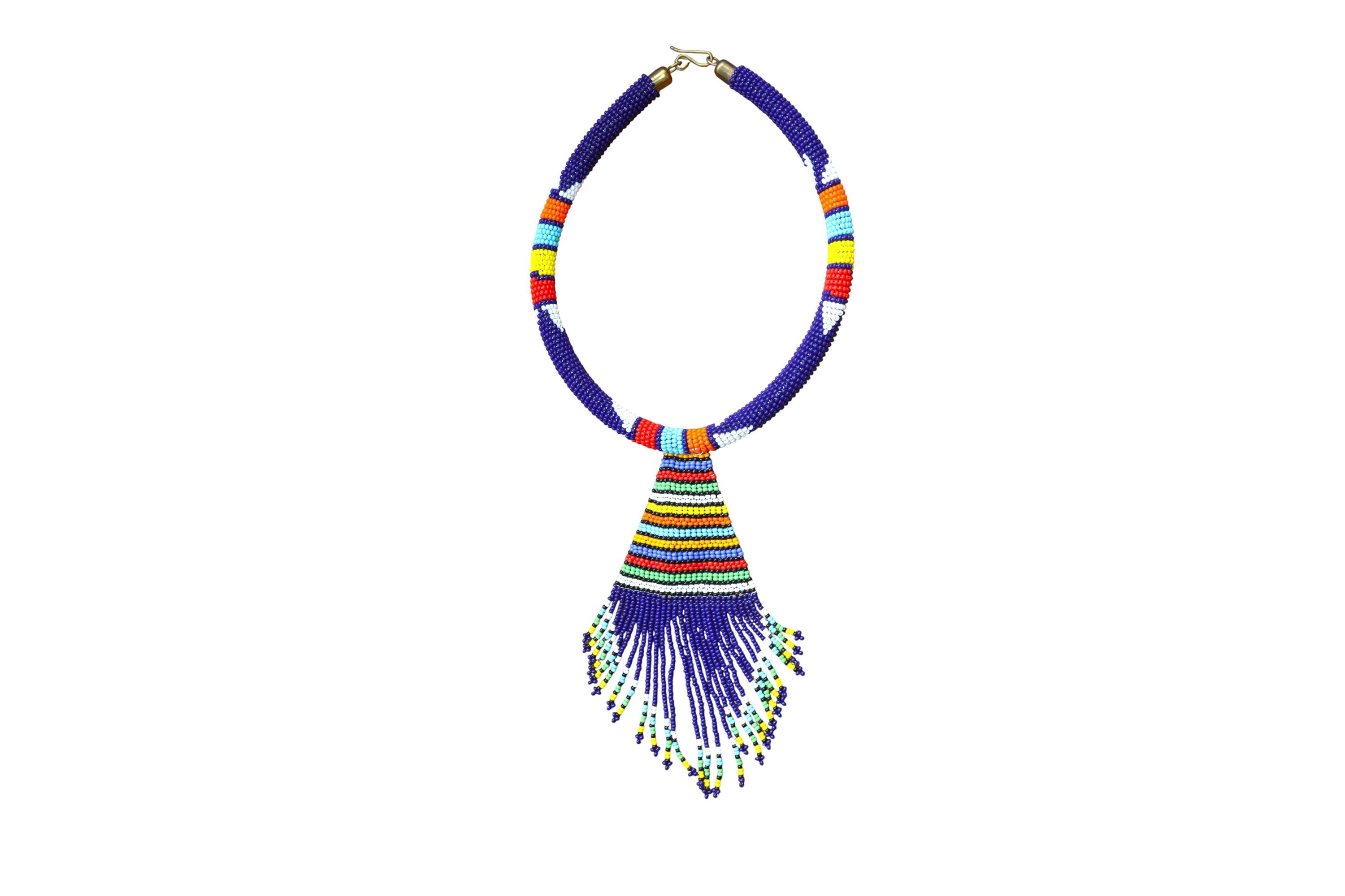 Add a touch of deep, vibrant color to your collection with this striking African beaded choker necklace. This piece showcases traditional Maasai seed bead techniques in a stunning statement design. It features a thick, rolled deep blue beaded band that acts as the choker collar. A central, dense V-shaped fringe bib hangs from the collar, incorporating geometric beadwork. The bib features bold color blocks in black, red, blue, yellow, and white stripes. Long strands of deep blue seed bead fringe drop from the bib, adding movement and drama. This piece is a truly striking ethnic statement accessory. It is perfect for boho, festival, or global eclectic fashion.
