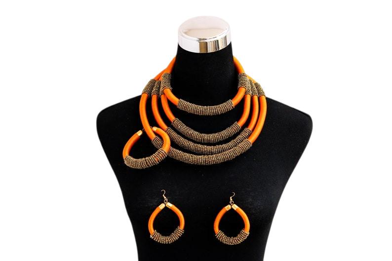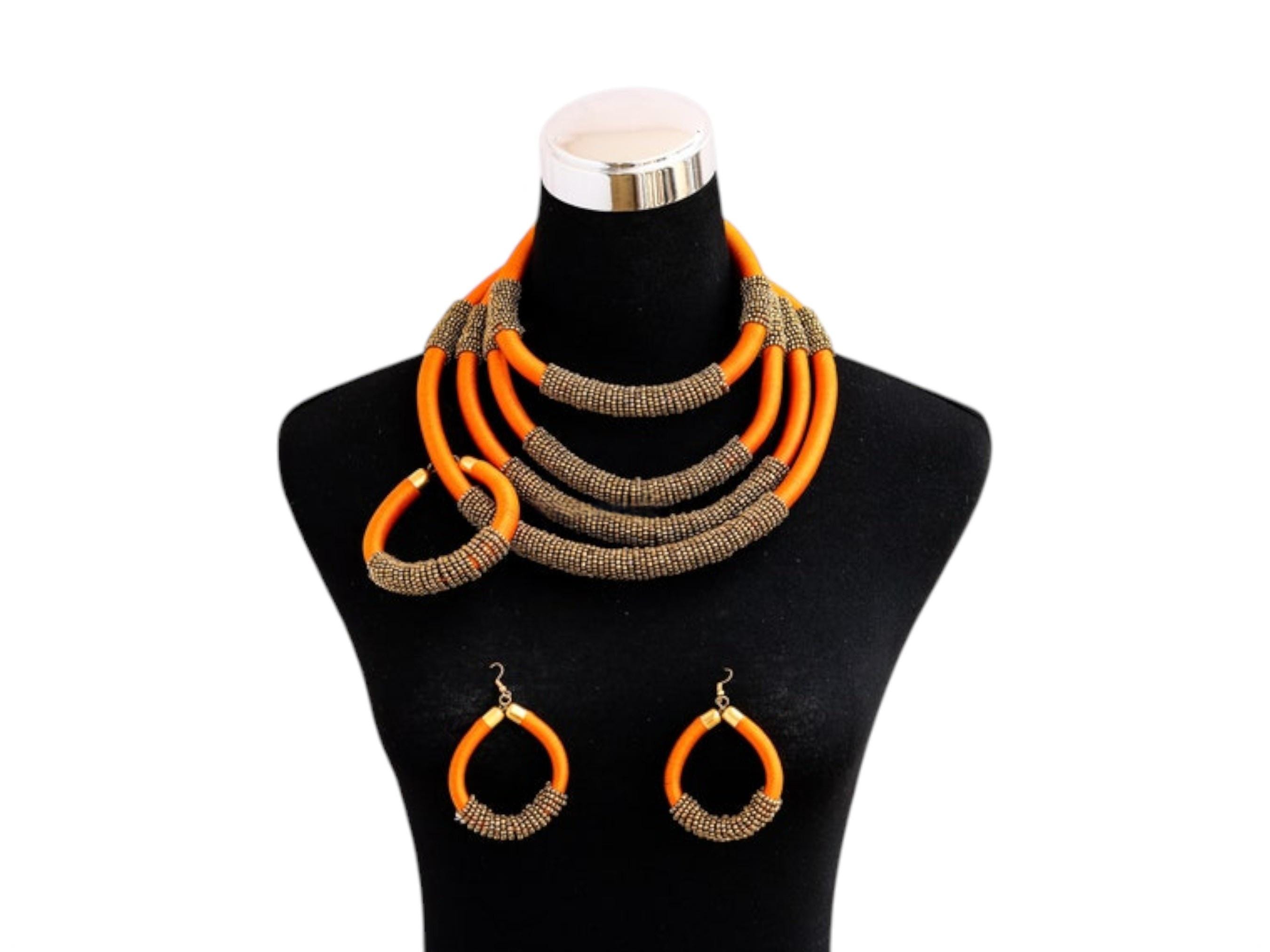 Command attention with this stunning Afrocentric statement jewelry set. The set includes a triple-layer collar necklace, a matching bracelet, and a pair of large hoop earrings. Each piece features bright orange tubing contrasted with sections of tight, coiled bronze-toned beadwork. The chunky, rigid design provides a structured and substantial feel. The vibrant electric orange and metallic bronze combination is bold and striking. This set is perfect for African bridal wear, cultural events, or special occasions. It creates a complete, high-fashion, tribal, chunky, luxe look. This handmade set makes an exceptional gift for collectors of global-style jewelry.