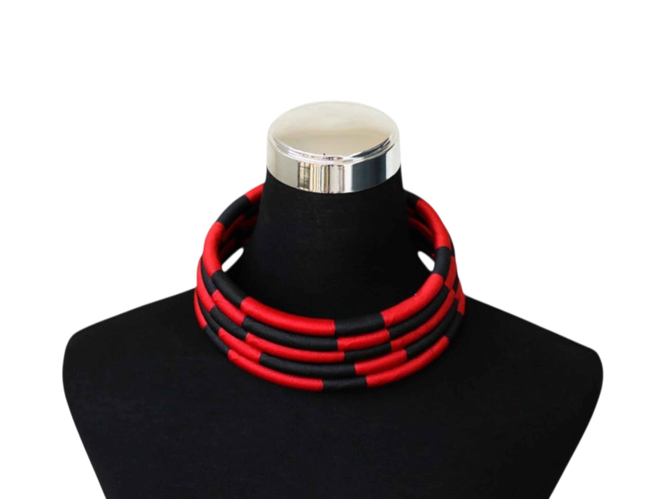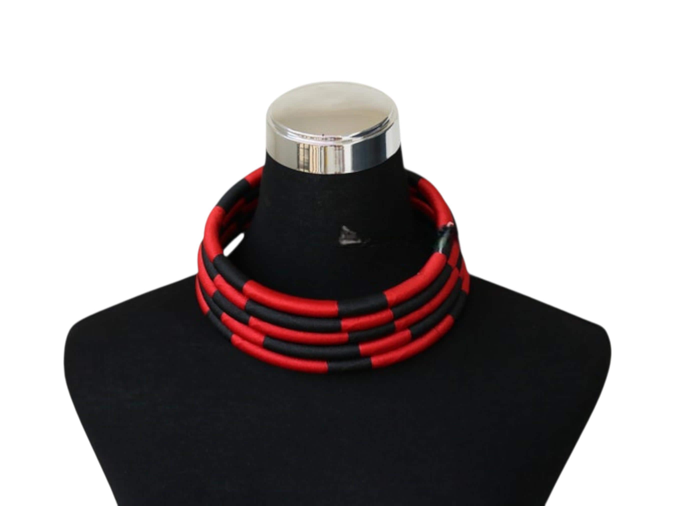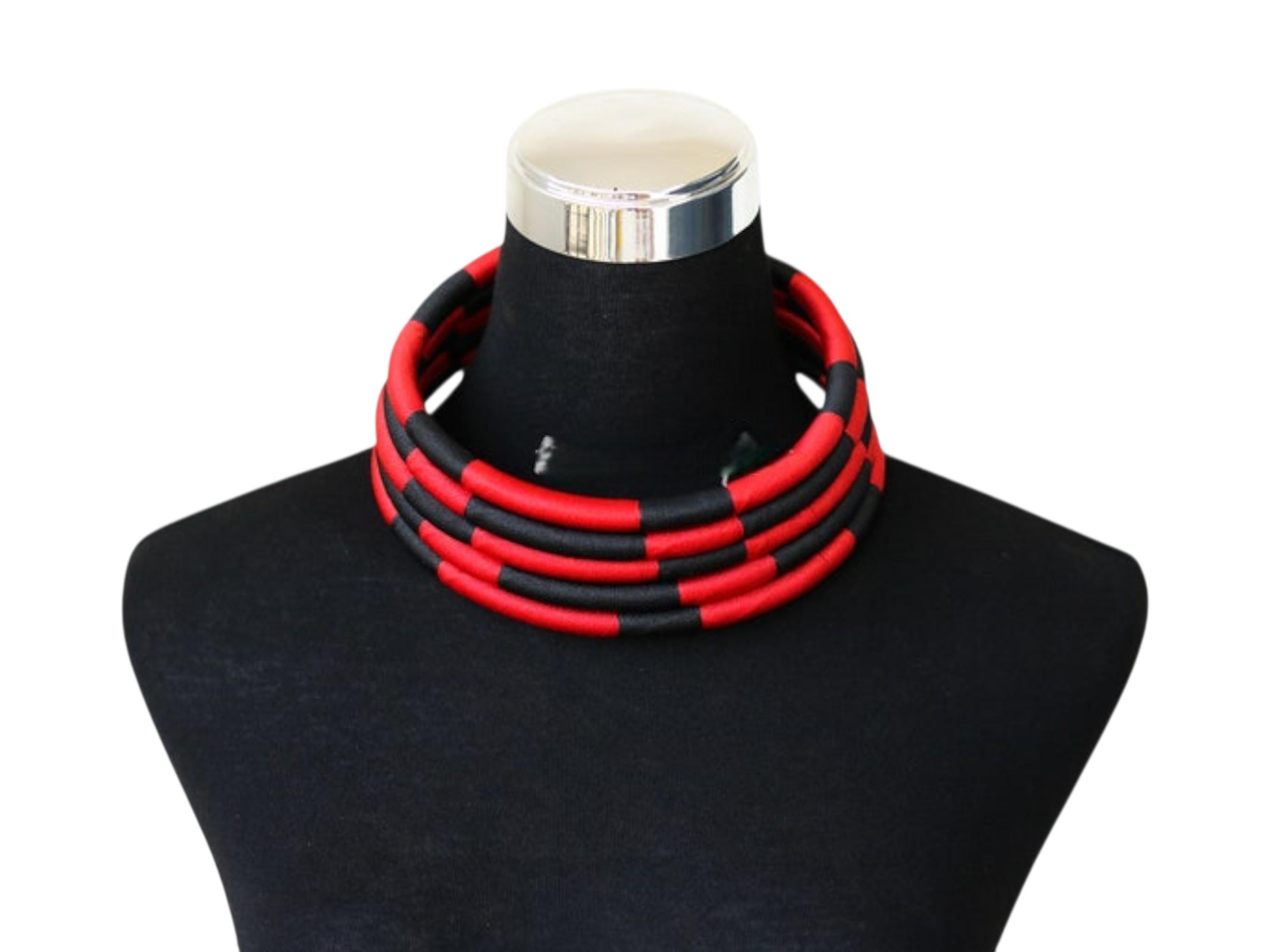 Make a powerful fashion statement with this dramatic Afrocentric jewelry set. The set includes a multi-strand chunky collar necklace and a pair of matching two-tone hoop earrings. The necklace features three separate layers of rope/tubing tightly wrapped in a striking pattern of red and black thread. The earrings are stylishly wrapped half in red and half in black. The design creates a voluminous, high-impact chunky collar statement. The high-contrast palette ensures this set is a visual showstopper. This set is perfect for special occasions, professional events, or adding a Tribal Luxe touch. This handmade set makes a unique and memorable gift.