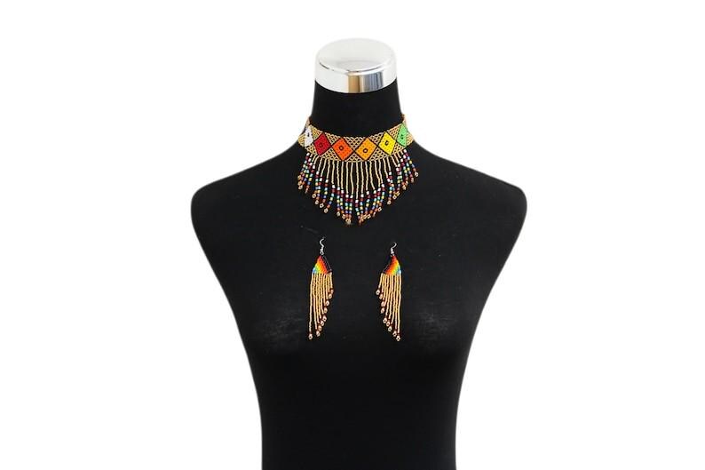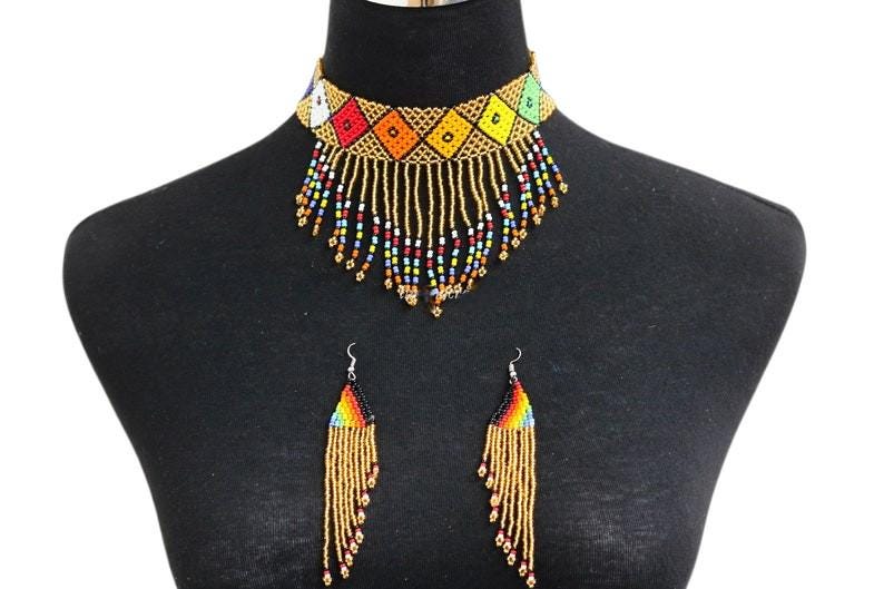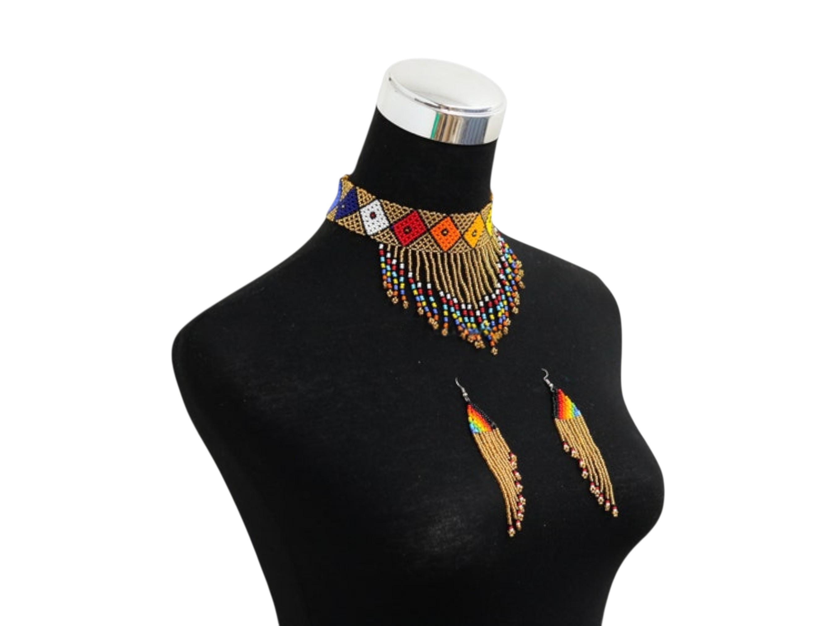 Celebrate radiant South African artistry with this stunning Zulu-style beaded jewelry set. This set includes a wide geometric choker and matching dangle earrings. The choker features beautiful diamond-shaped motifs in vibrant primary colors. These designs are set against a luxurious, shimmering gold-toned beaded base. A cascading fringe of multi-colored beads with flower-like tips adds movement and elegance. The coordinated earrings feature a triangular top and matching long fringe. This collection is a perfect example of high-quality African handmade craftsmanship. It is an ideal ethnic statement piece for special occasions or global style lovers.