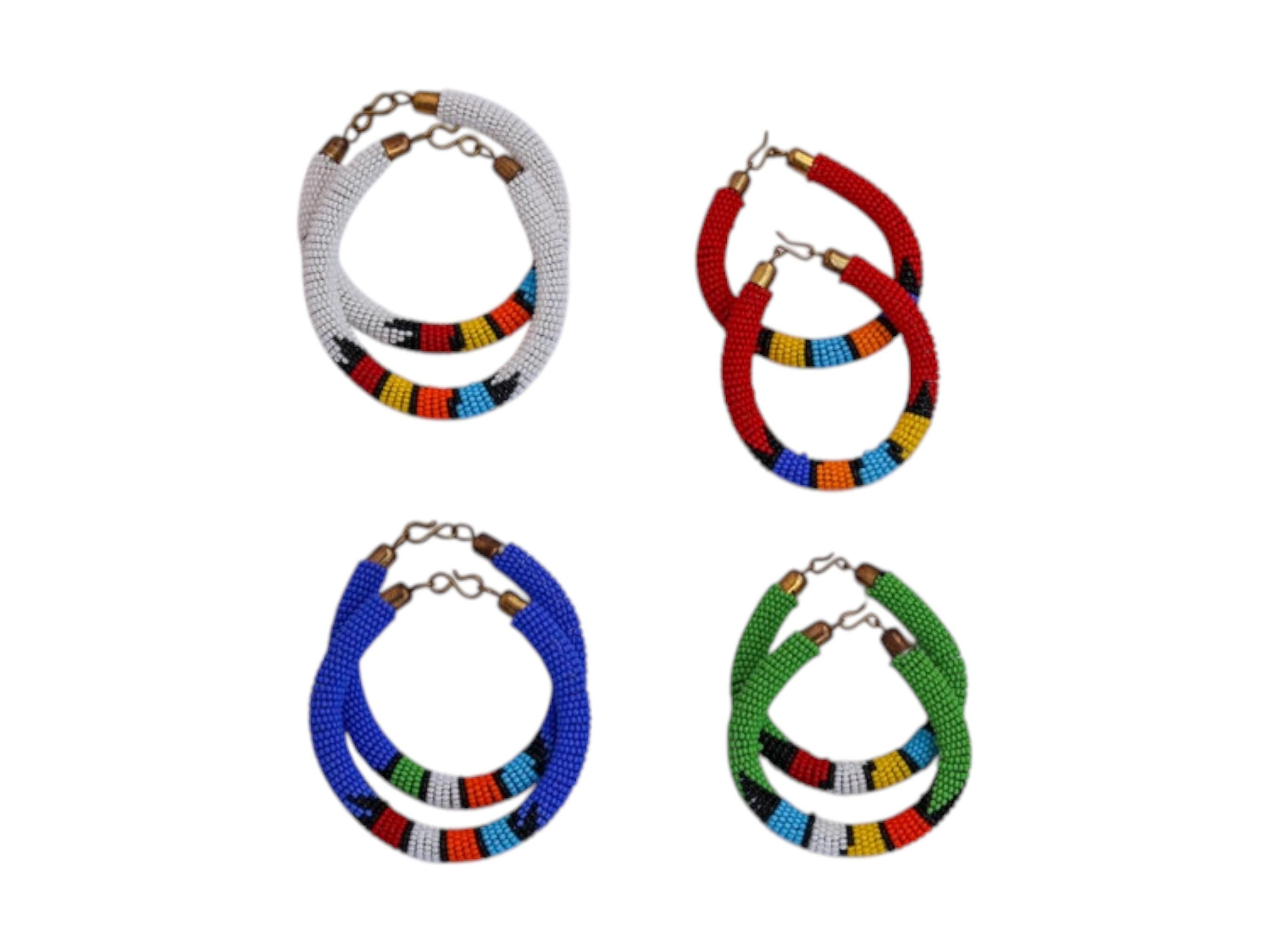 Add a pop of authentic color to your wrist with these stunning Zulu beaded hoop bracelets. These handmade bangles are available in four vibrant base colors: white, red, blue, and green. Each pair features unique geometric patterns inspired by traditional South African artistry. They are meticulously hand-beaded using high-quality seed beads. The lightweight, tubular design makes them comfortable for all-day wear. A simple hook closure ensures a secure and easy fit. These hoops are perfect for stacking or wearing as individual statement pieces. They make a fantastic boho-inspired gift or cultural accessory.