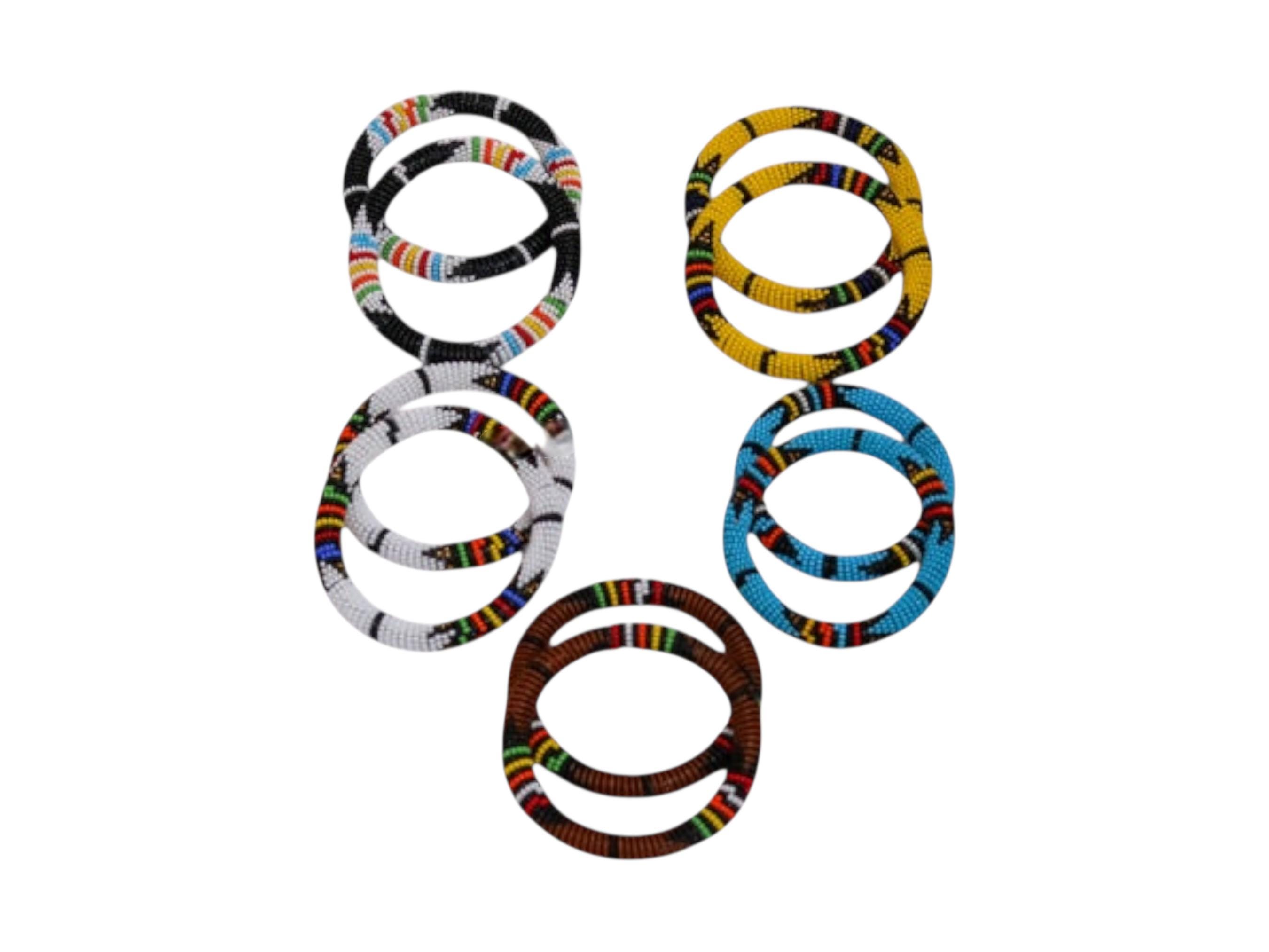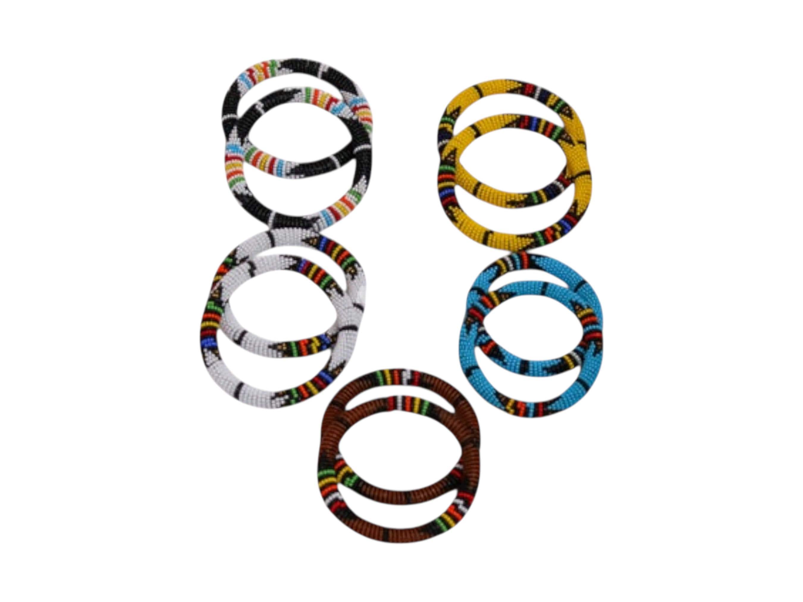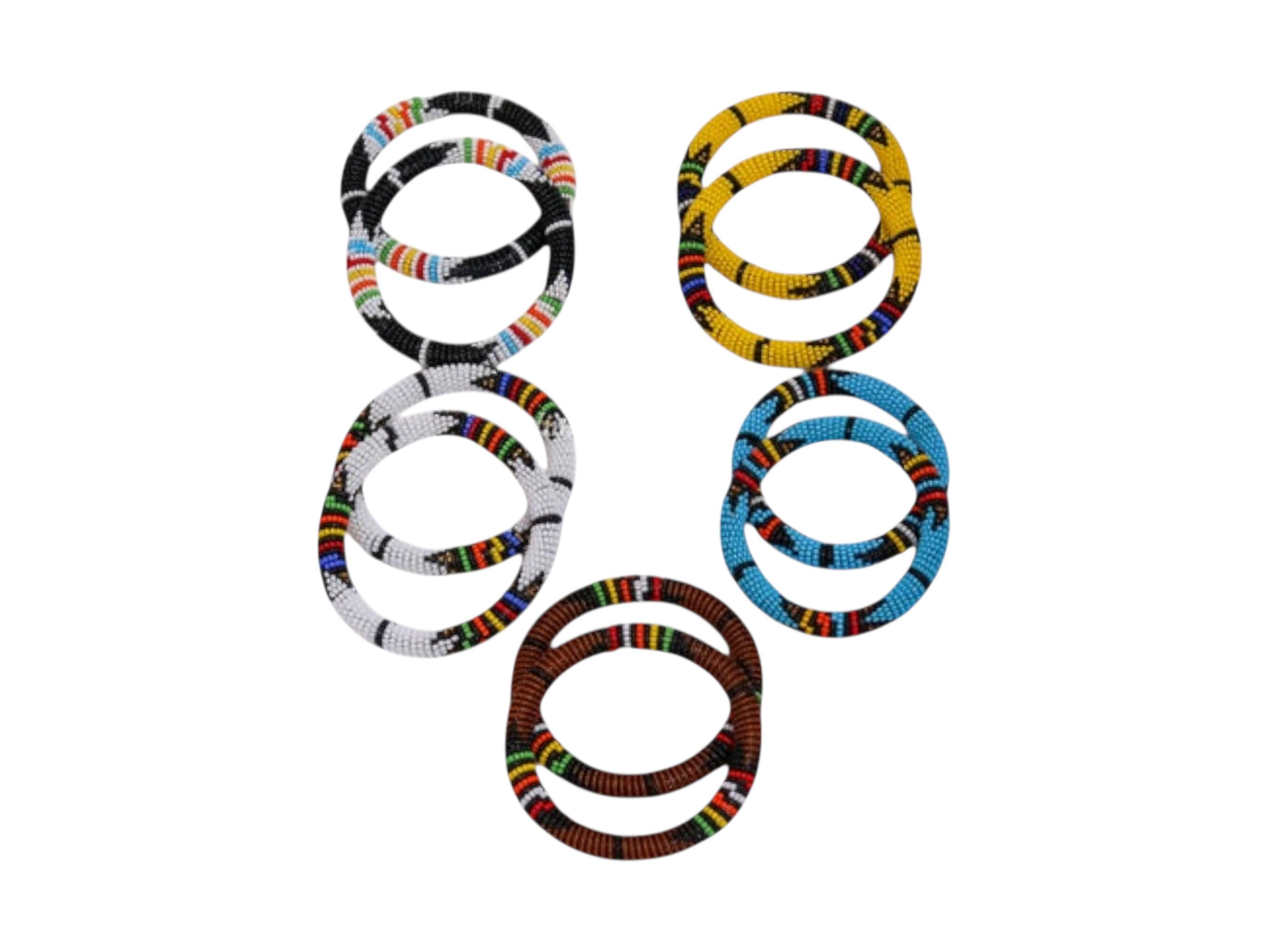 Bring the spirit of Africa to your jewelry collection with this set of five pairs of Zulu beaded bangles. This comprehensive collection includes ten bracelets in total, organized into five matching color pairs. The set features base colors of black, yellow, white, turquoise blue, and earthy brown. Each bangle is meticulously hand-beaded with vibrant geometric patterns, including stripes and triangles. Colors like red, green, and orange pop against the solid backgrounds for a striking visual effect. These lightweight, tubular hoops are designed for comfort and effortless stacking. They are the perfect accessory for adding a boho-chic or global eclectic touch to any outfit. This handmade set is an ideal gift for anyone who appreciates authentic tribal craftsmanship.