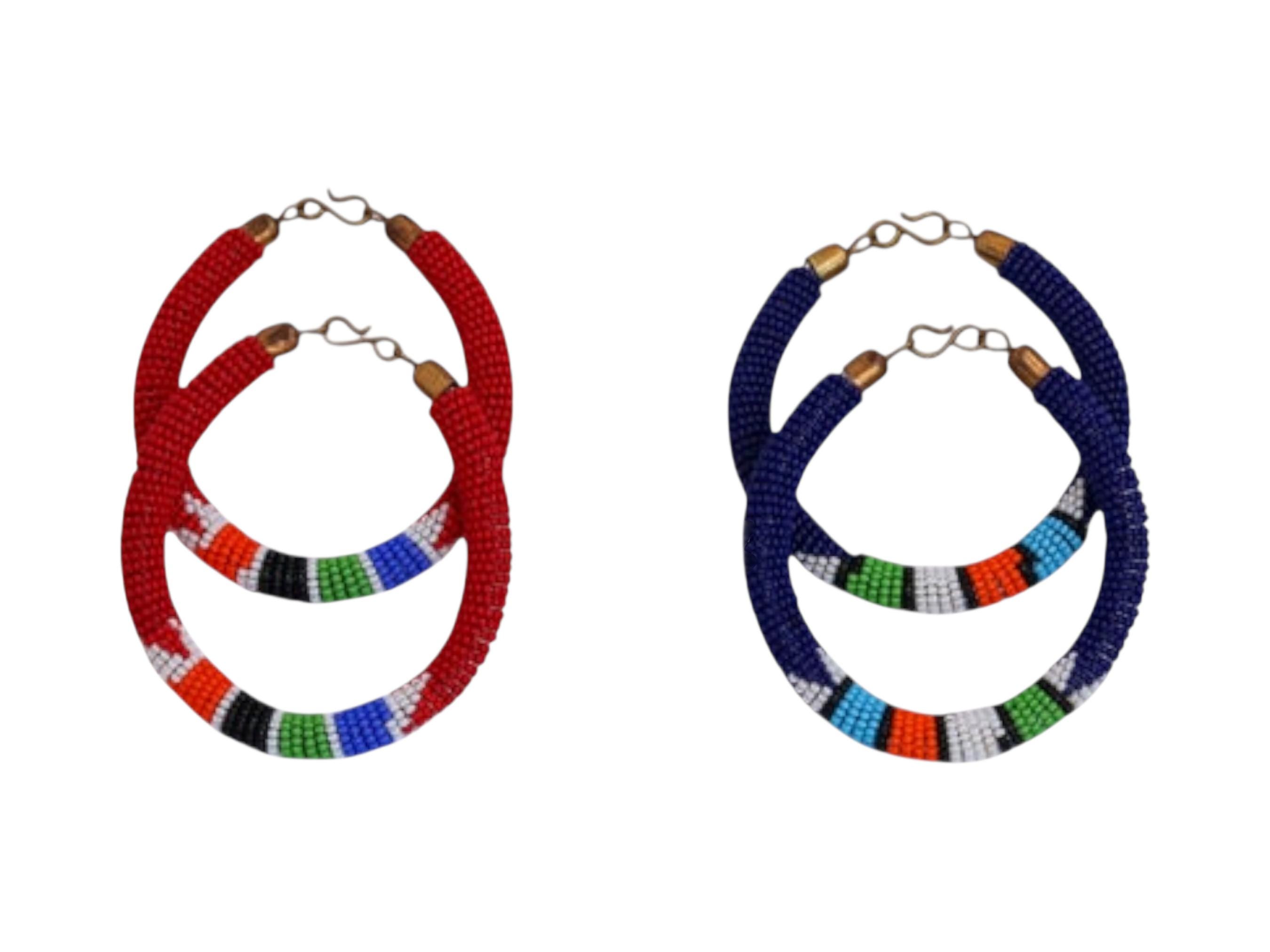 Add authentic South African flair to your accessory collection with this set of Zulu beaded hoop bracelets. This collection includes two distinct pairs of bangles in vibrant red and royal blue. Each pair is meticulously hand-beaded with high-quality glass seed beads. The designs feature a bold solid color base accented by a segment of geometric multi-colored bands. These decorative bands include shades of orange, green, white, and black for a striking look. A convenient hook closure allows for easy wear and removal. Their lightweight, tubular design makes them comfortable for all-day wear or festive occasions. These pieces are a perfect boho-chic statement or a meaningful gift representing traditional African artistry.