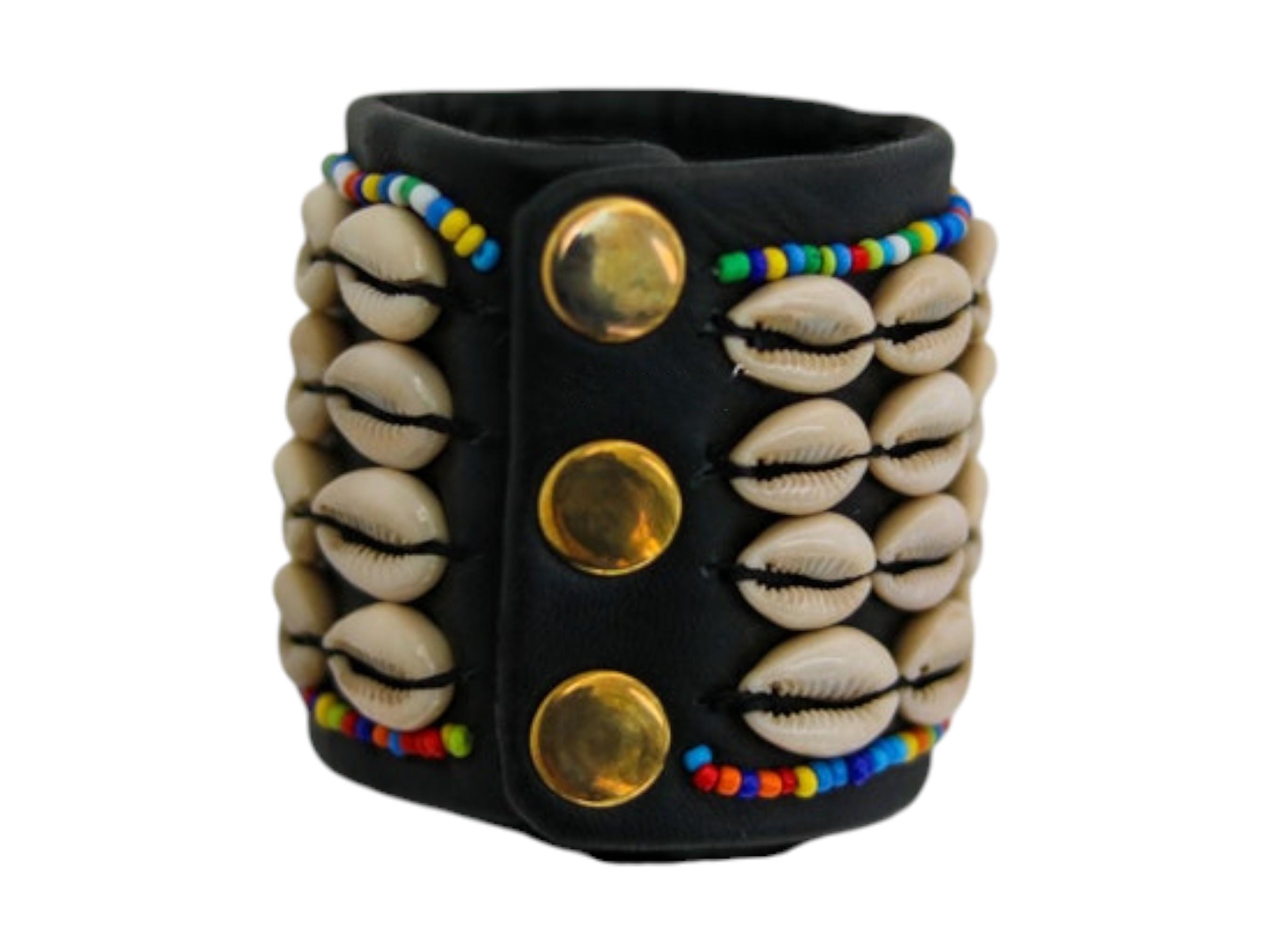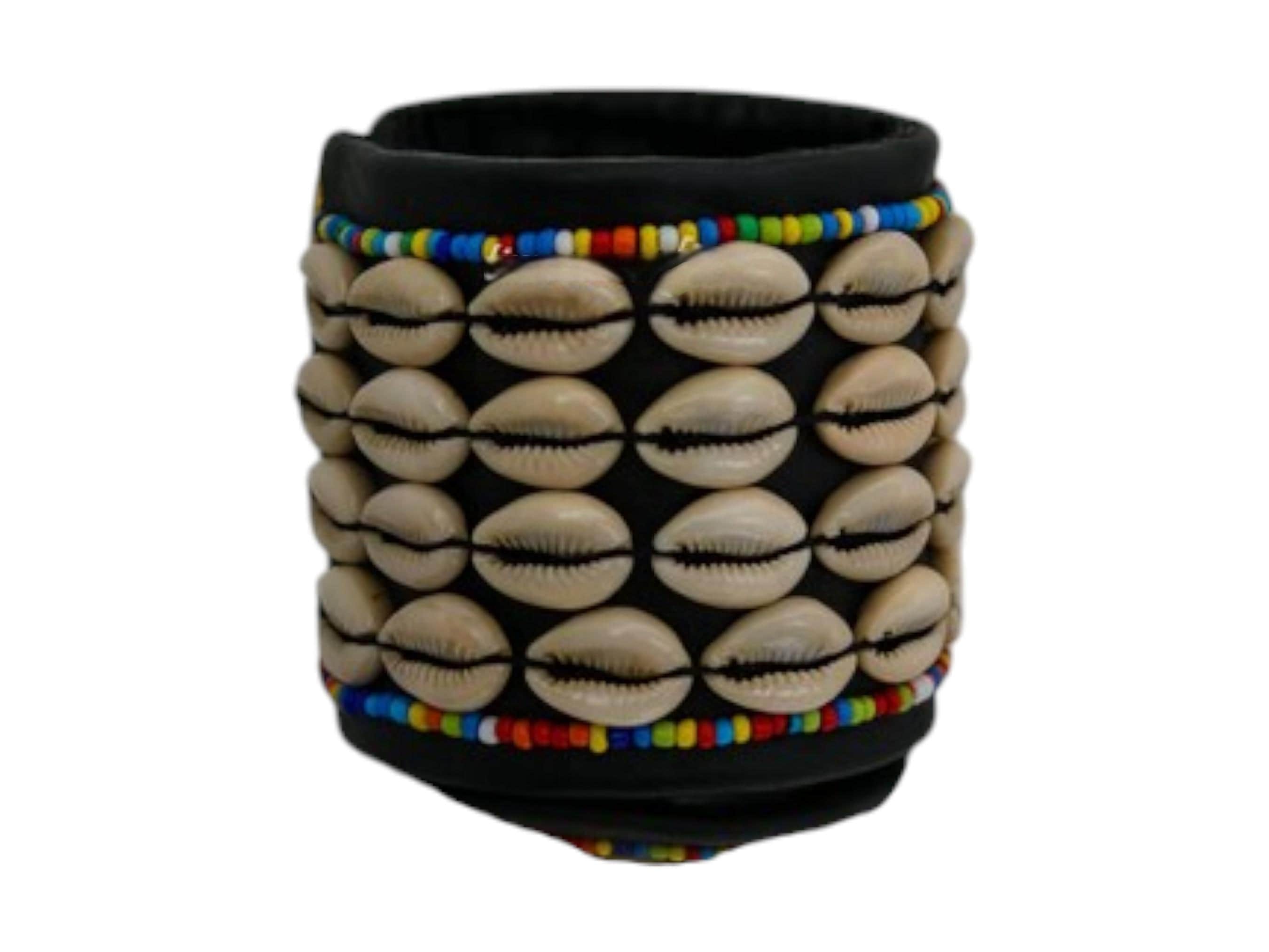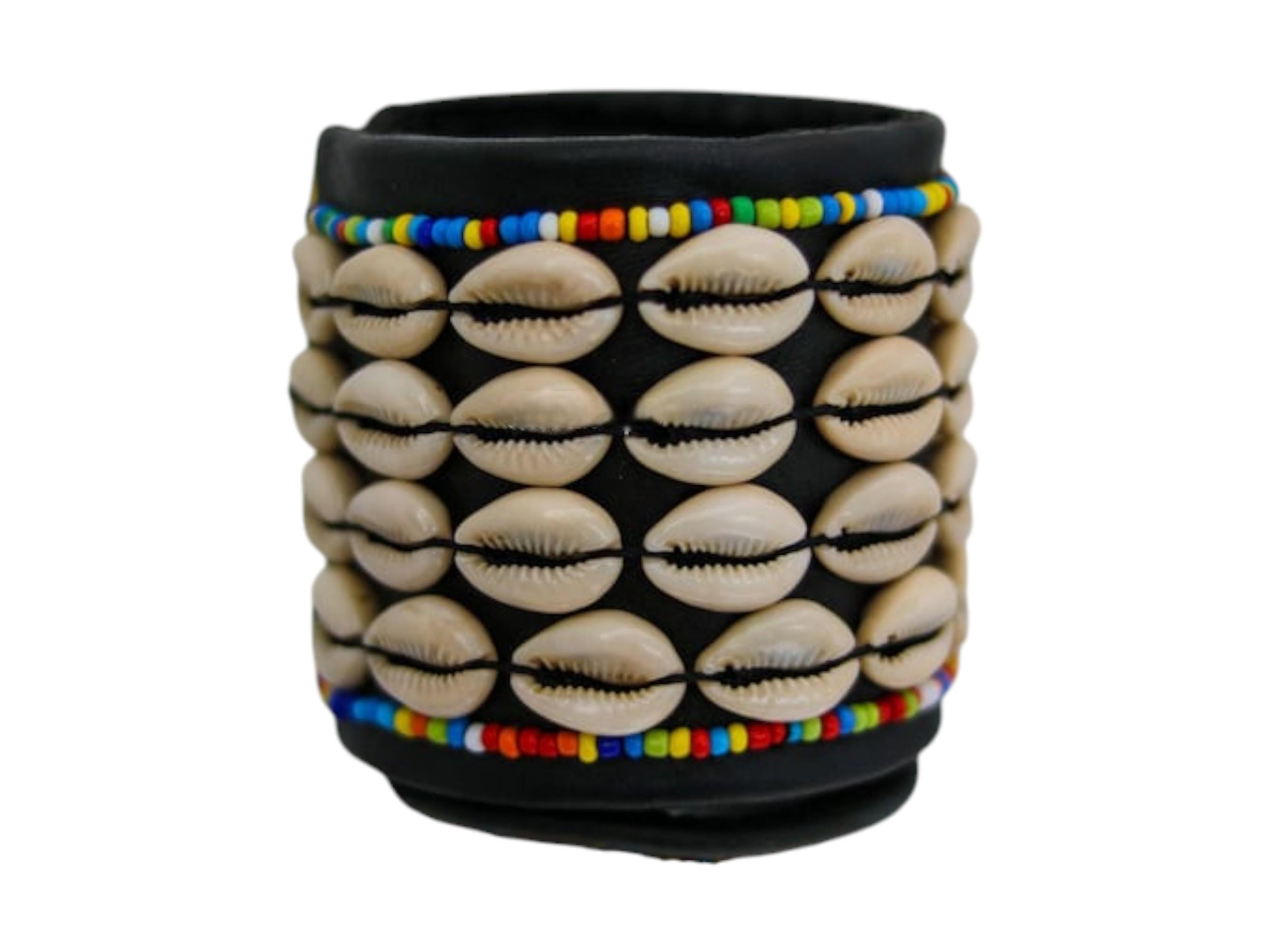 Elevate your jewelry collection with this stunning African cowrie shell cuff. This wide statement piece features four horizontal rows of authentic, cream-colored shells. The shells are set against a sleek black background for a high-impact, modern look. Thin borders of multi-colored seed beads add a vibrant touch to the top and bottom edges. These colorful accents include shades of red, yellow, green, and blue. Each cuff is meticulously handcrafted using traditional African beading techniques. The bold texture and cultural design make it a perfect boho-chic accessory. Give this unique piece as a meaningful gift that celebrates authentic tribal craftsmanship.