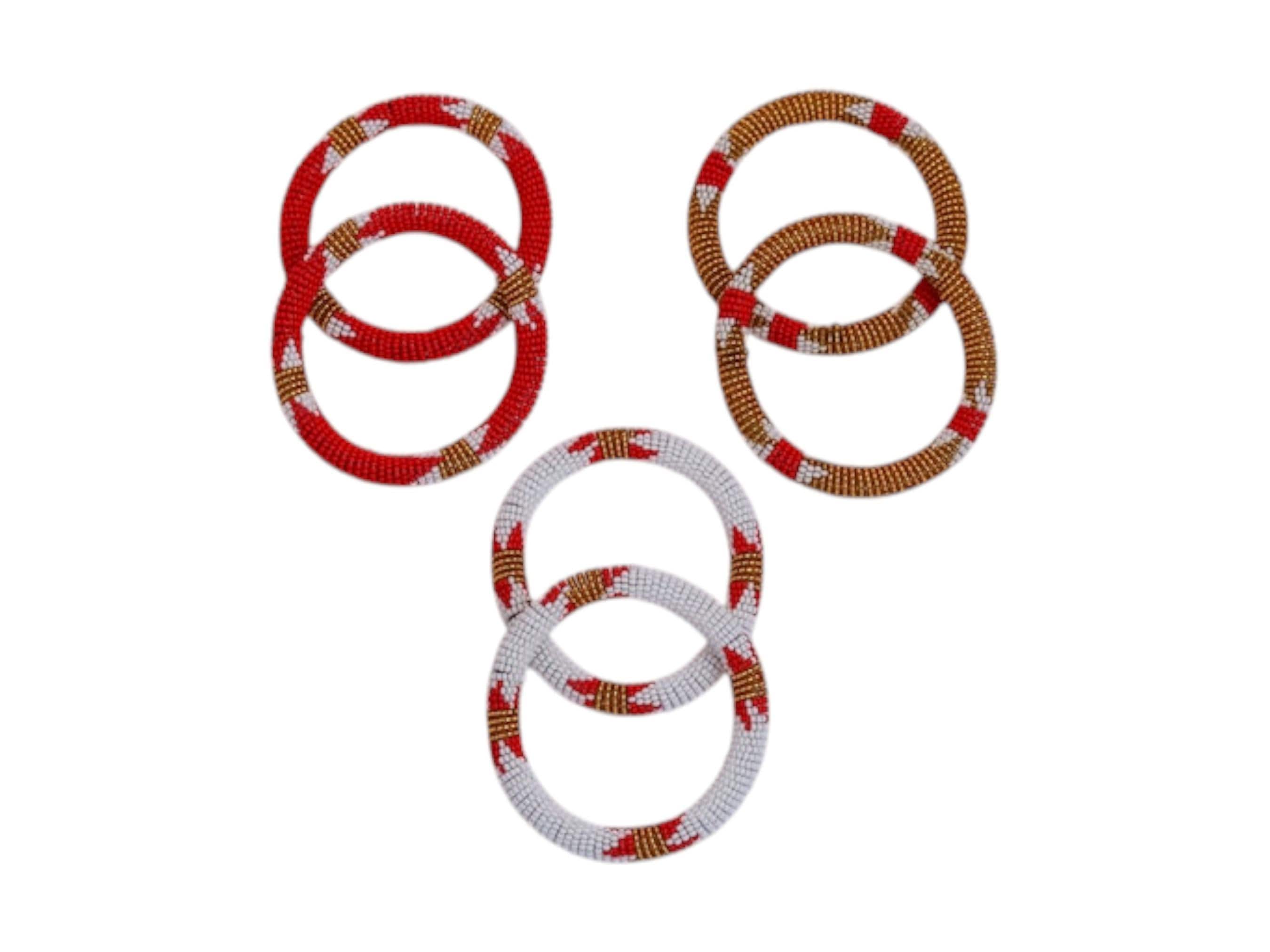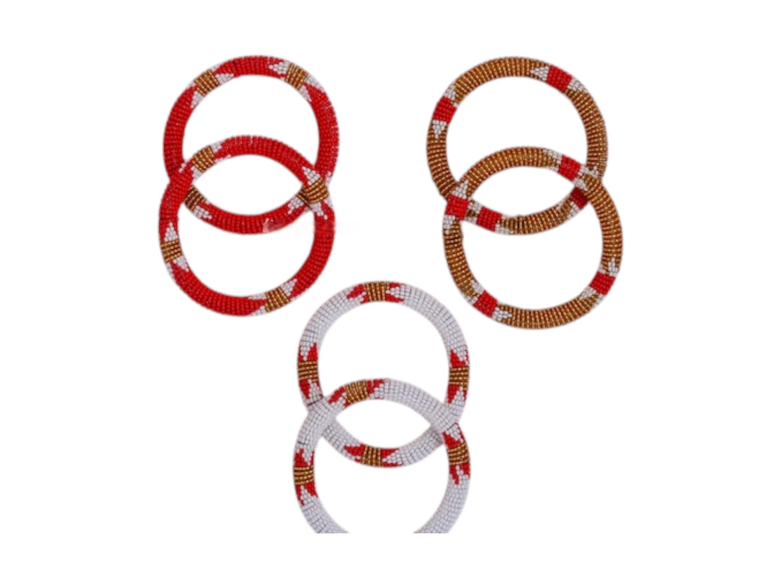 Enhance your accessory collection with this elegant set of three pairs of Zulu beaded bangles. This collection includes six bracelets featuring a sophisticated palette of red, white, and metallic gold. Each pair is meticulously hand-beaded with contrasting geometric cross patterns. These traditional African designs offer a striking visual contrast that wraps around the entire hoop. The lightweight, tubular construction makes them perfect for effortless stacking and all-day comfort. They are crafted using high-quality glass seed beads and authentic artisan techniques. This versatile set can be worn as coordinated pairs or mixed together for a bold boho statement. It makes a thoughtful and unique gift for anyone who appreciates handmade tribal jewelry.