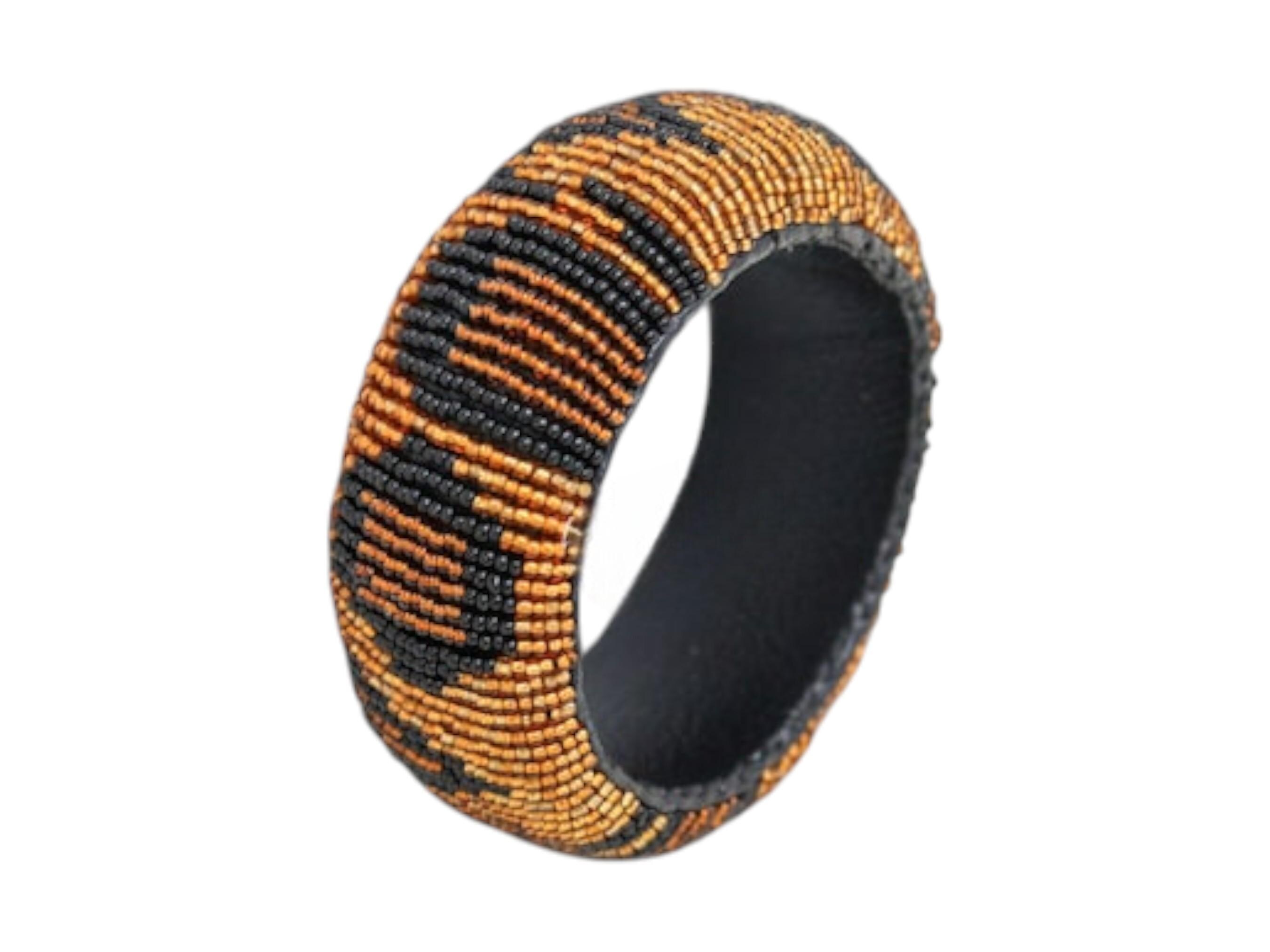 Make a bold fashion statement with this leopard-print African beaded bangle. This wide cuff is hand-crafted using thousands of tiny glass seed beads. The design features a shimmering base of metallic gold and bronze beads. Detailed black spots are woven in to create a realistic and fierce animal print pattern. Its sturdy construction ensures it maintains its shape while providing a high-impact look. The interior is finished with a smooth black lining for all-day comfort. This tribal-inspired accessory is perfect for adding a touch of the wild to any outfit. It serves as a unique and meaningful gift for anyone who loves authentic handmade jewelry.