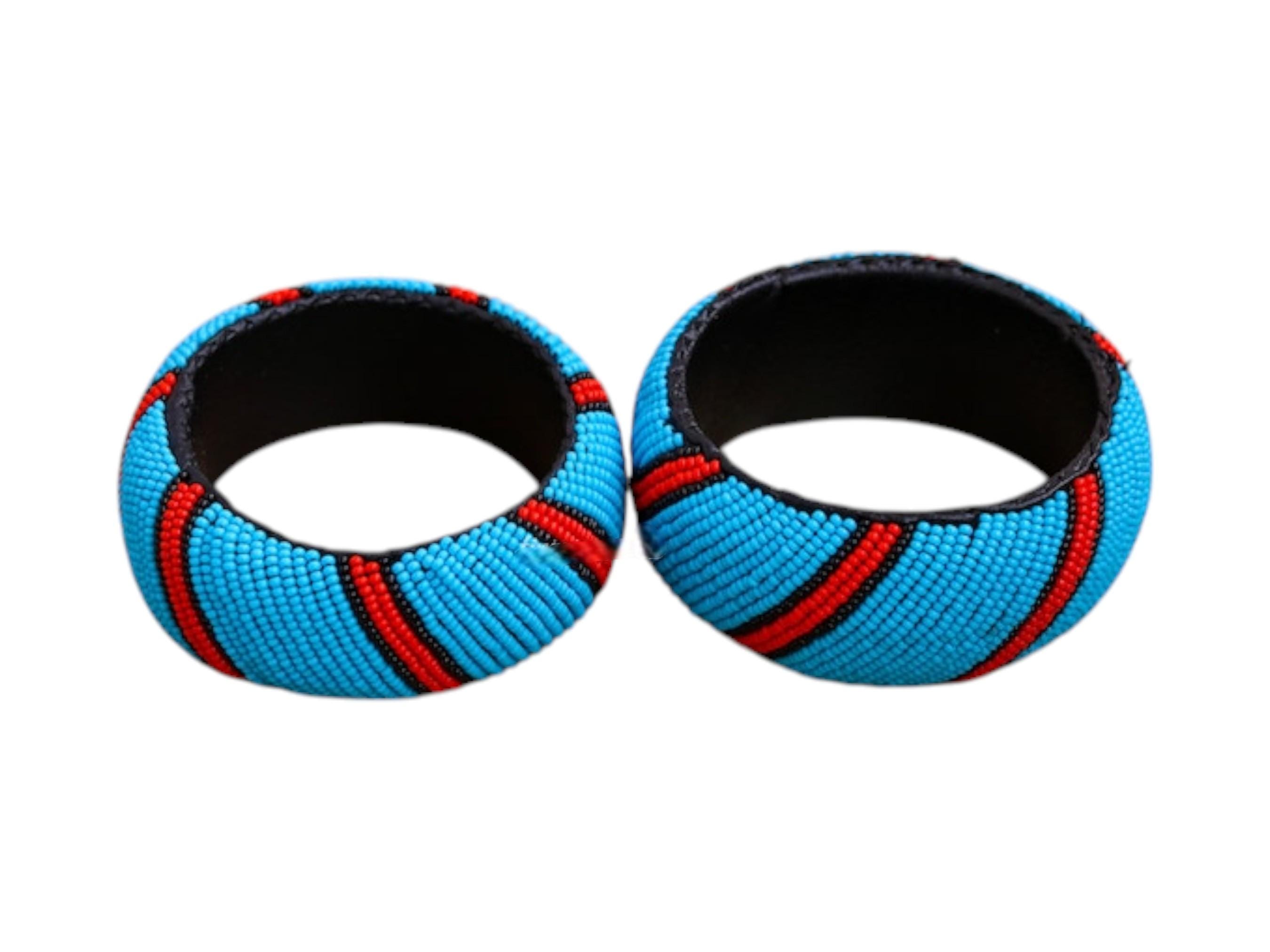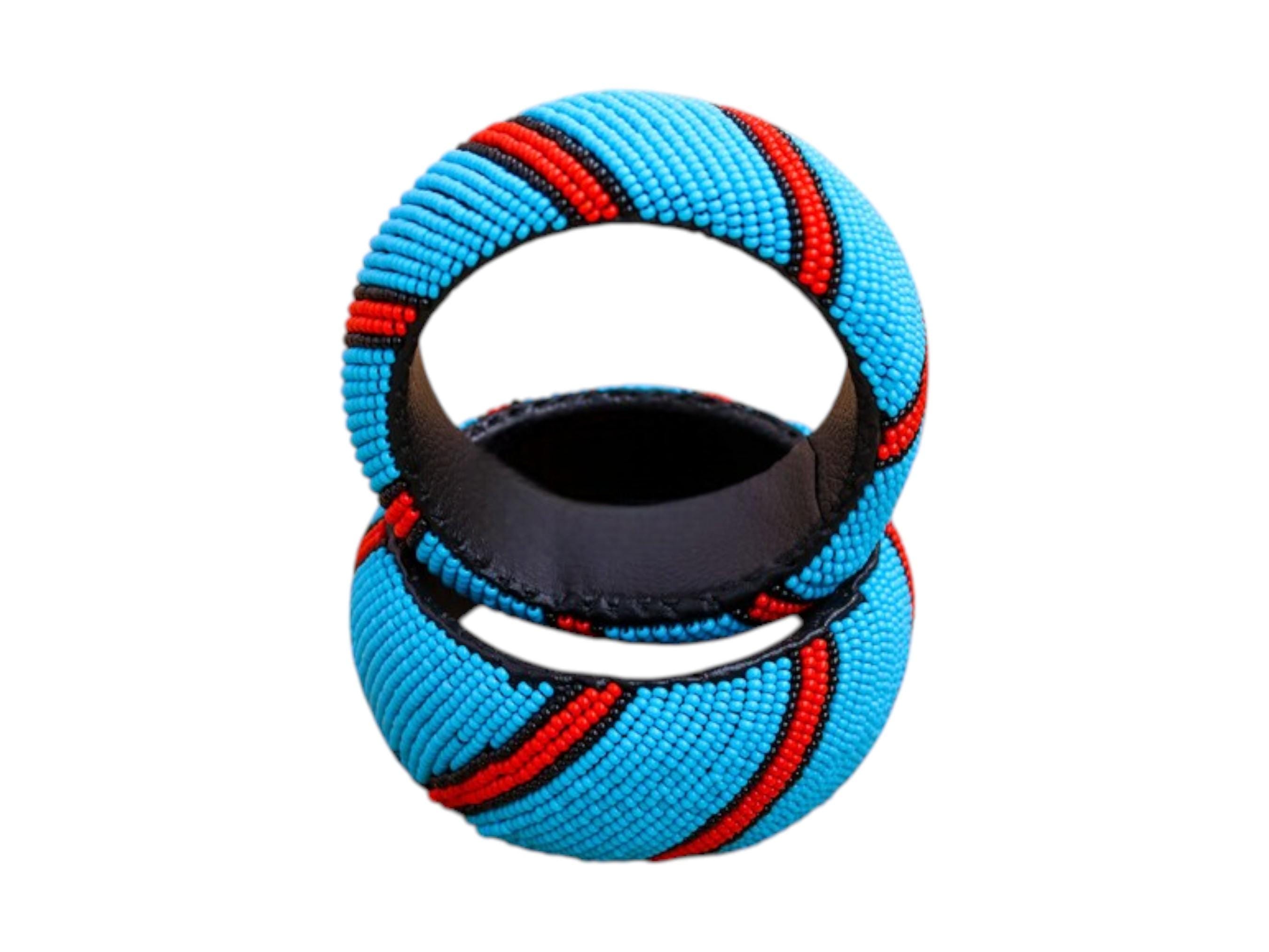Brighten your wardrobe with this stunning set of two wide sky blue African beaded bangles. Each bracelet is meticulously hand-beaded with a vibrant sky blue base. A striking pattern of red and black diagonal stripes wraps around each bangle for a dynamic look. These bracelets are crafted in a traditional tribal style using high-quality glass seed beads. The wide, sturdy design provides a bold statement accessory that is built for durability. The interior is finished smoothly to ensure a comfortable fit for daily wear. This matching pair is perfect for wearing together on one arm for a high-impact look. It serves as a beautiful and unique gift for anyone who loves authentic handmade jewelry.
