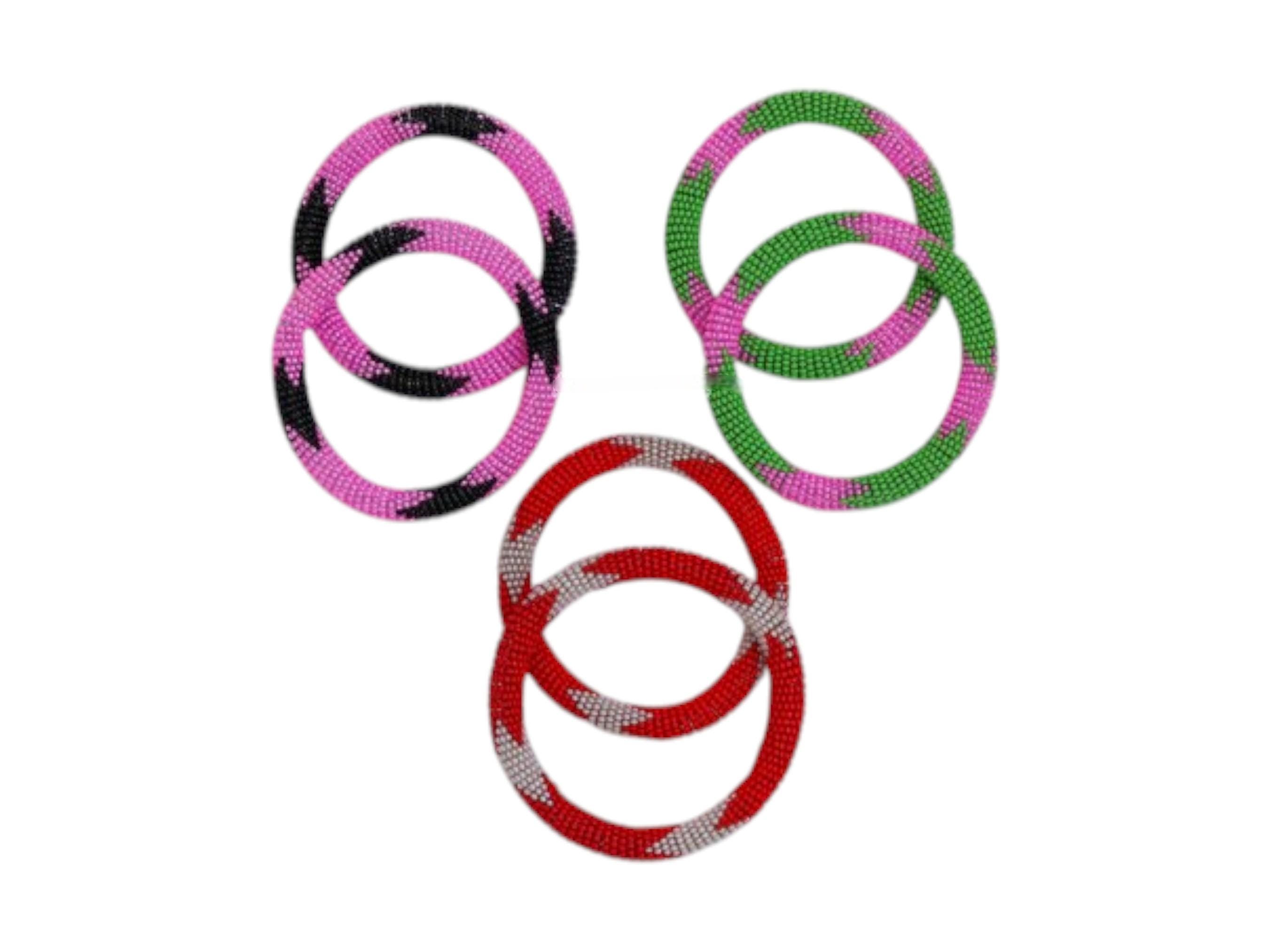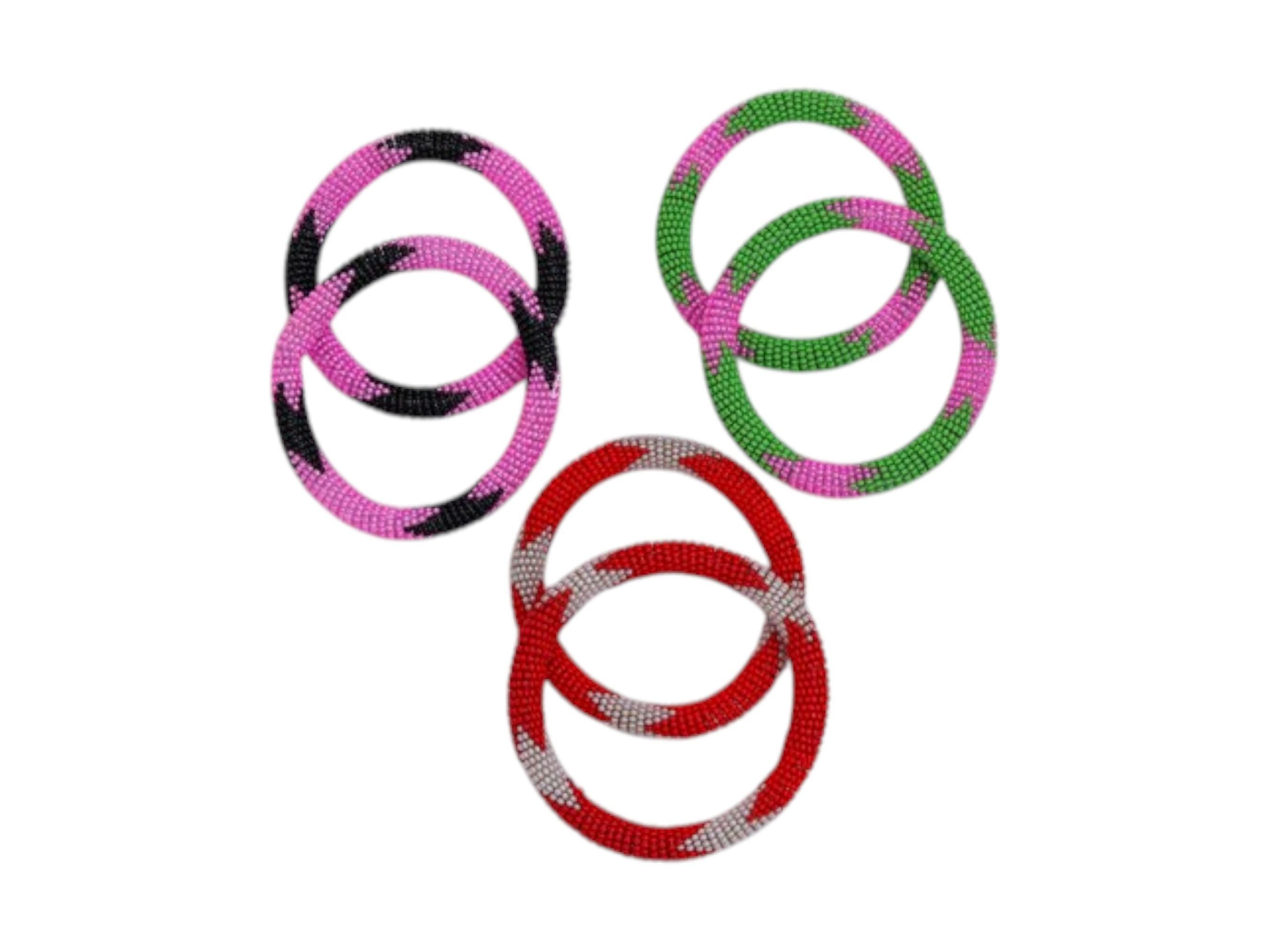 Elevate your accessories with this vibrant set of three pairs of Zulu beaded bangles. This collection features six bracelets total in eye-catching pink, red, and green hues. Each pair is hand-beaded with a repeating geometric zig-zag motif. These traditional African patterns provide a striking contrast against the solid-colored bases. The slim, tubular design allows for comfortable wear and easy stacking. Every piece is crafted using high-quality glass seed beads and authentic artisan techniques. You can wear these as matching pairs or mix them together for a bold boho statement. This set makes a unique and colorful gift for anyone who loves handmade tribal jewelry.