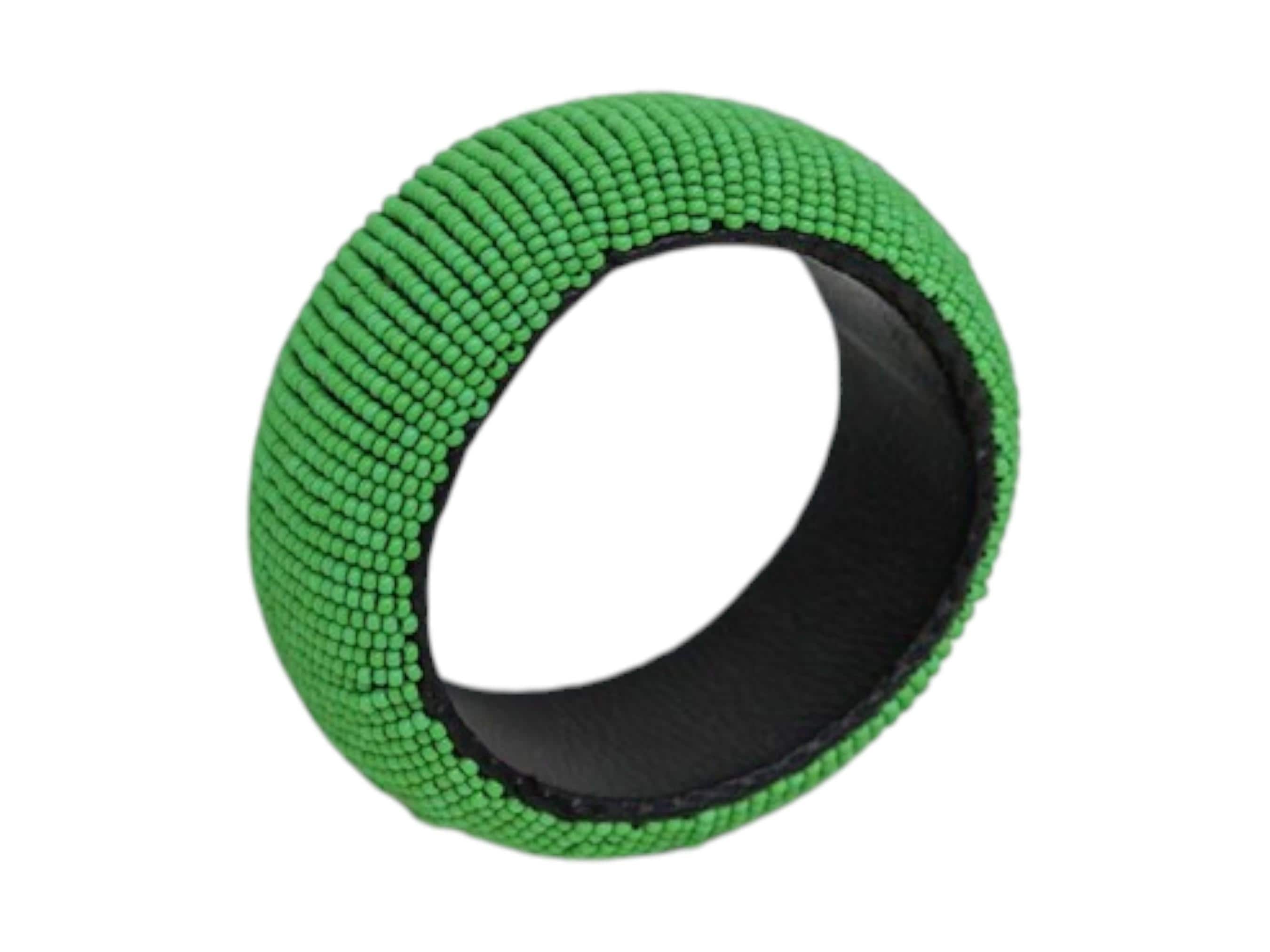 Brighten your jewelry collection with this stunning wide lime green African beaded bangle. This handcrafted cuff features a solid, vibrant neon green color that commands attention. Thousands of tiny glass seed beads are meticulously hand-strung to create a rich, textured surface. The wide design provides a bold and substantial statement look for the wrist. It is built on a sturdy internal core to maintain its beautiful circular shape. The monochromatic palette offers a modern twist on traditional Maasai beadwork. This accessory is perfect for adding an electric pop of color to any ensemble. It makes a unique and memorable gift for those who love authentic handmade accessories.